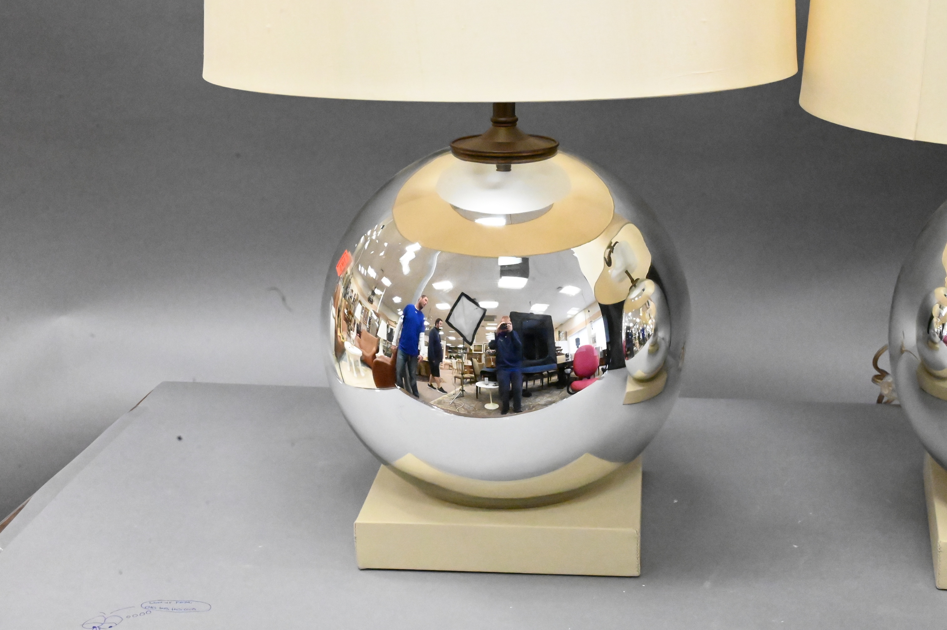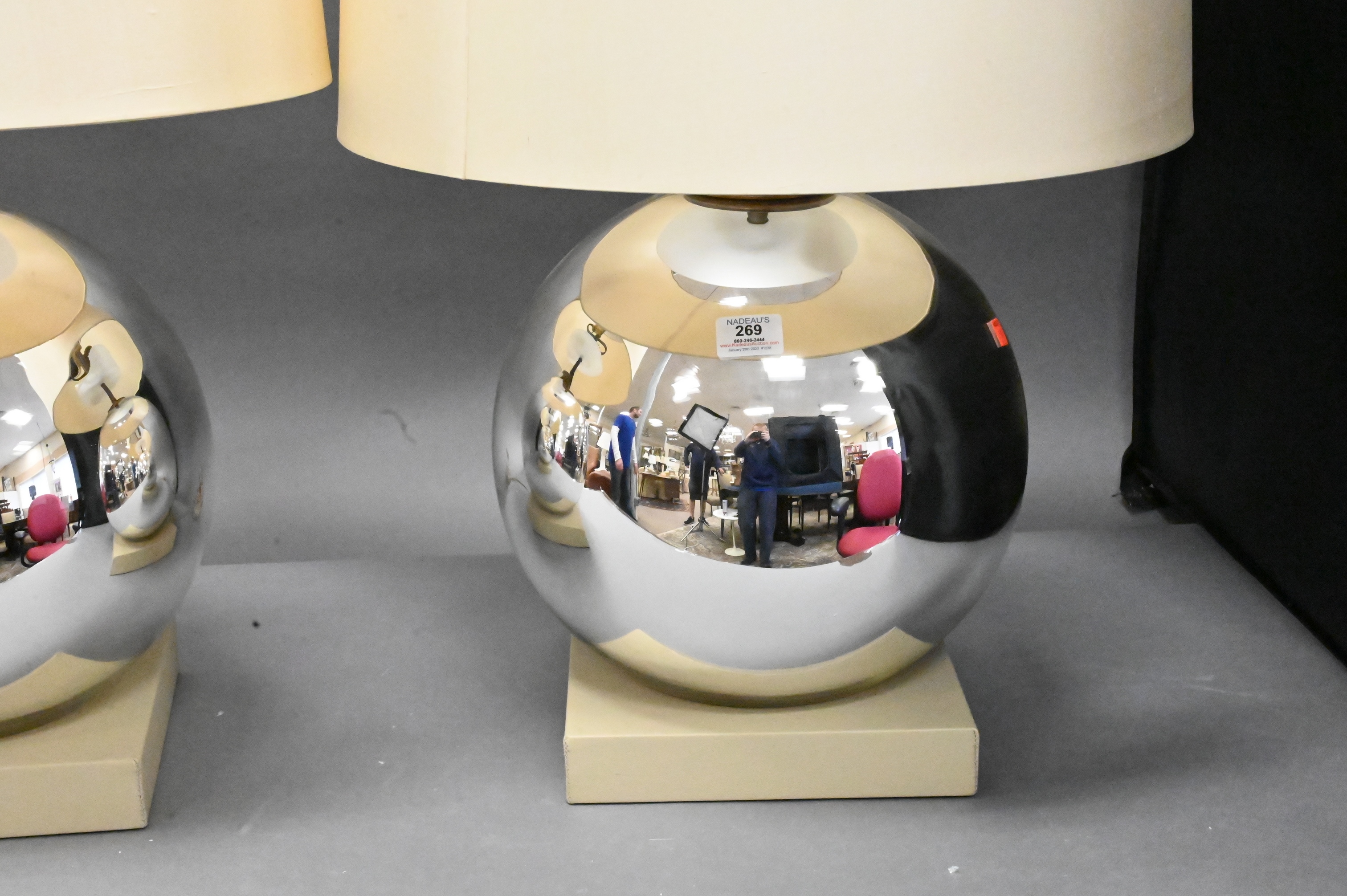 A Pair of Contemporary Mirrored Glass Lamps, in the form of a large ball on square cream leather bases, height 29 inches.
