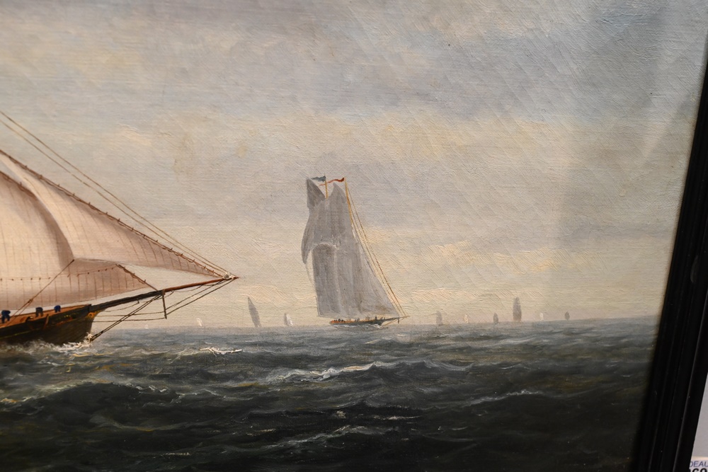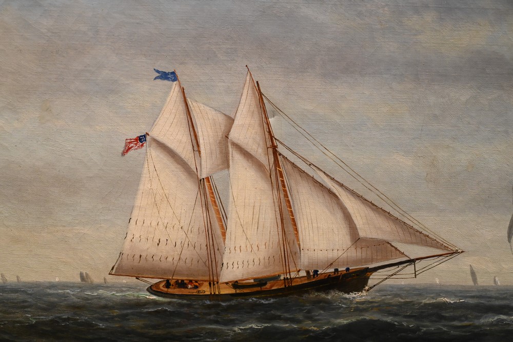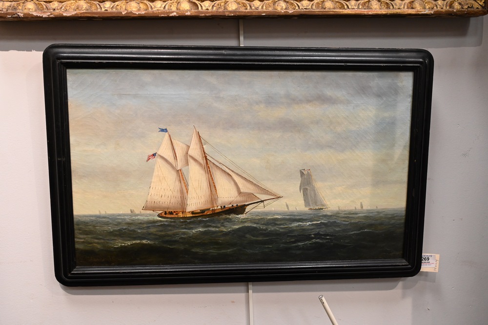 Lot 269: American School 19th century Schooner at Sea with American Flag oil on canvas signed indistinctly 14 x 24 inches