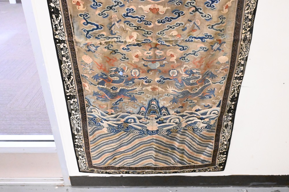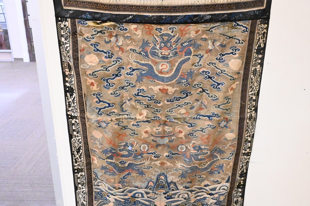 Lot 269: Chinese Embroidered Panel, probably made from a Thangka, with a five claw dragon, probably 18th century, (worn in spots), 66″ x 34″.