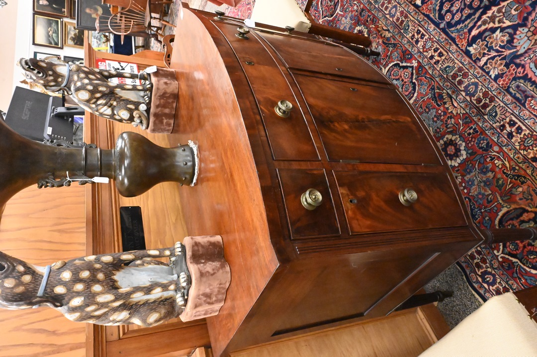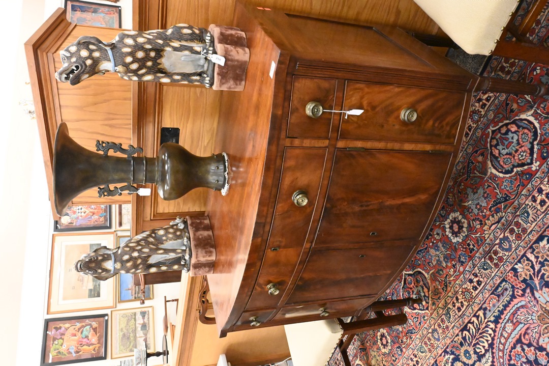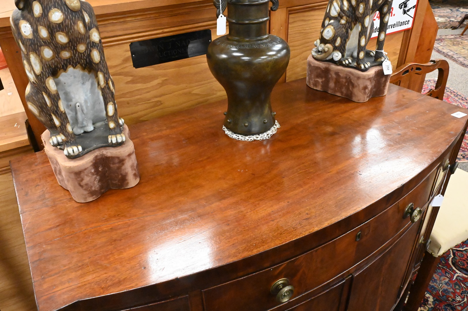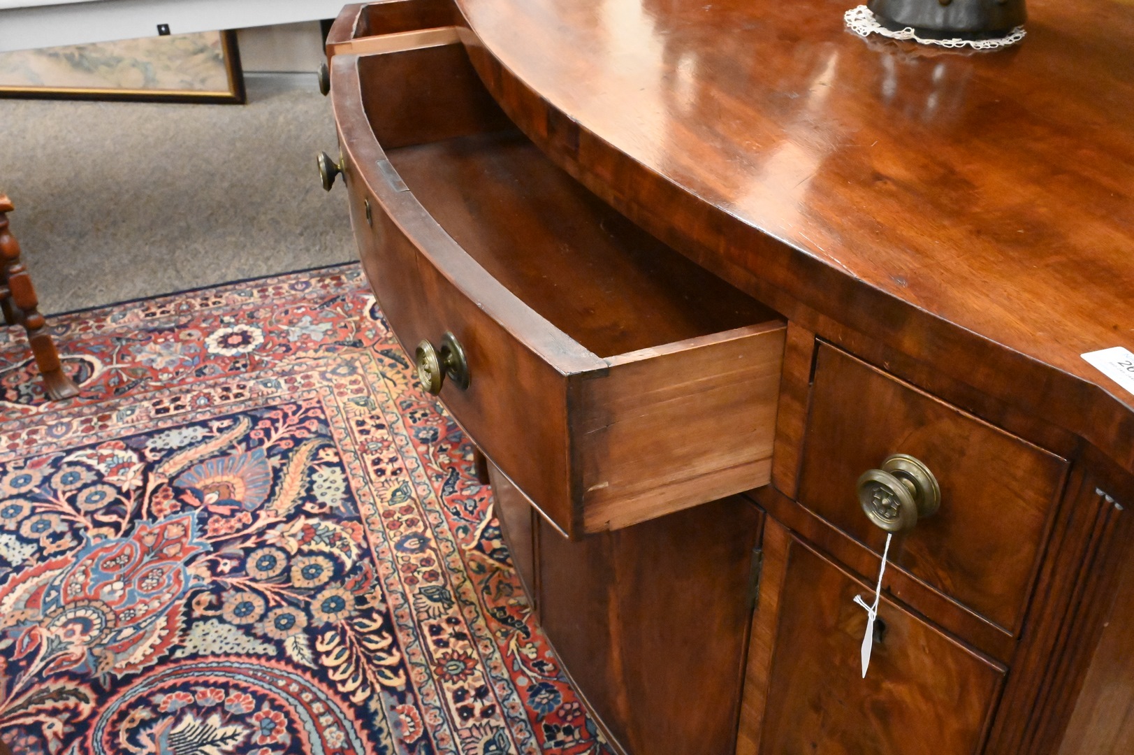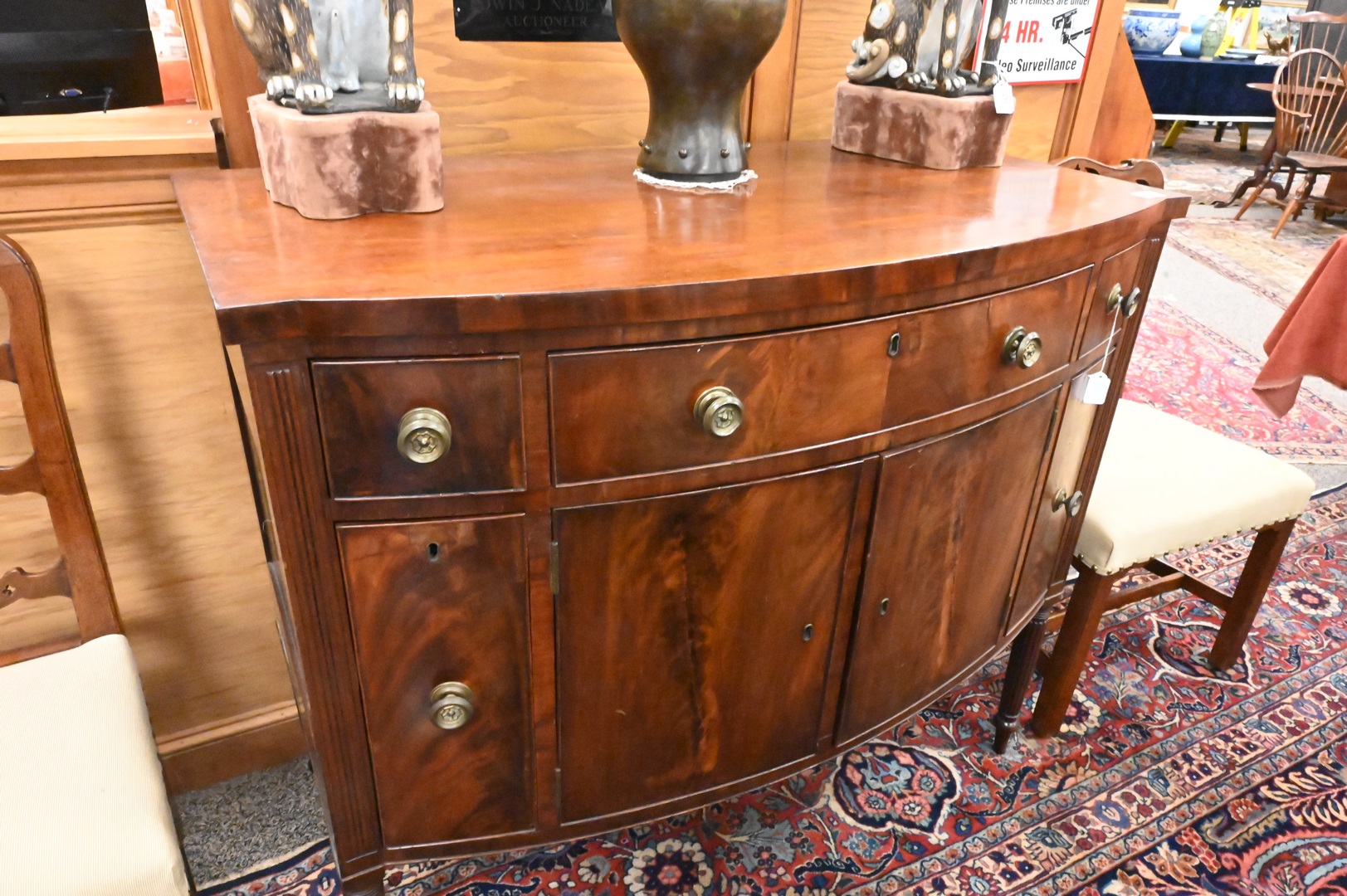 Diminutive Sheraton Mahogany Sideboard, having bowed front with three drawers over a pair of center doors, flanked by bottle drawers, all flanked by fluted pilasters, set on turned and fluted legs, circa 1820, shrinkage cracks in top, height 39 1/2 inches, top 24″ x 45 1/4″.
