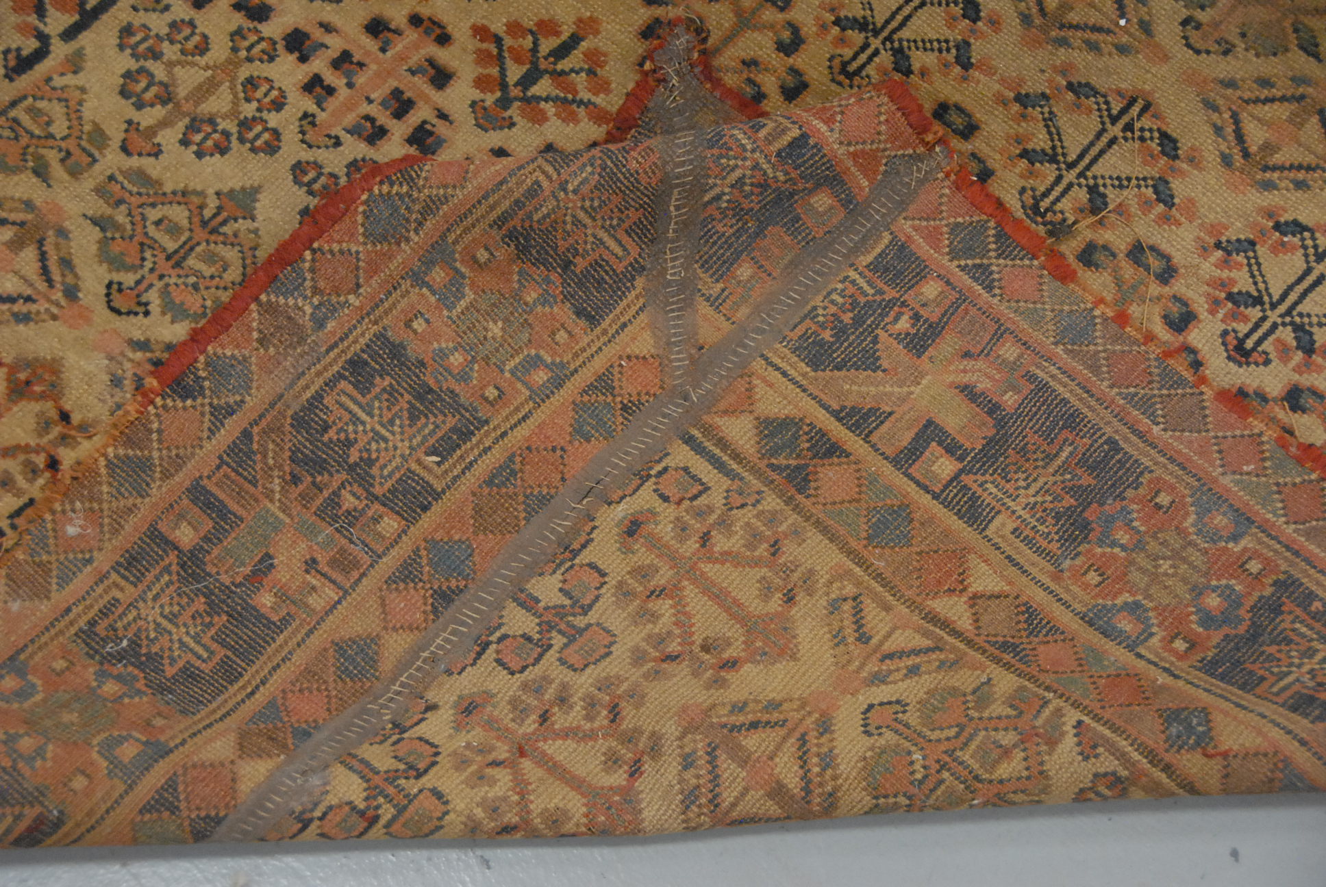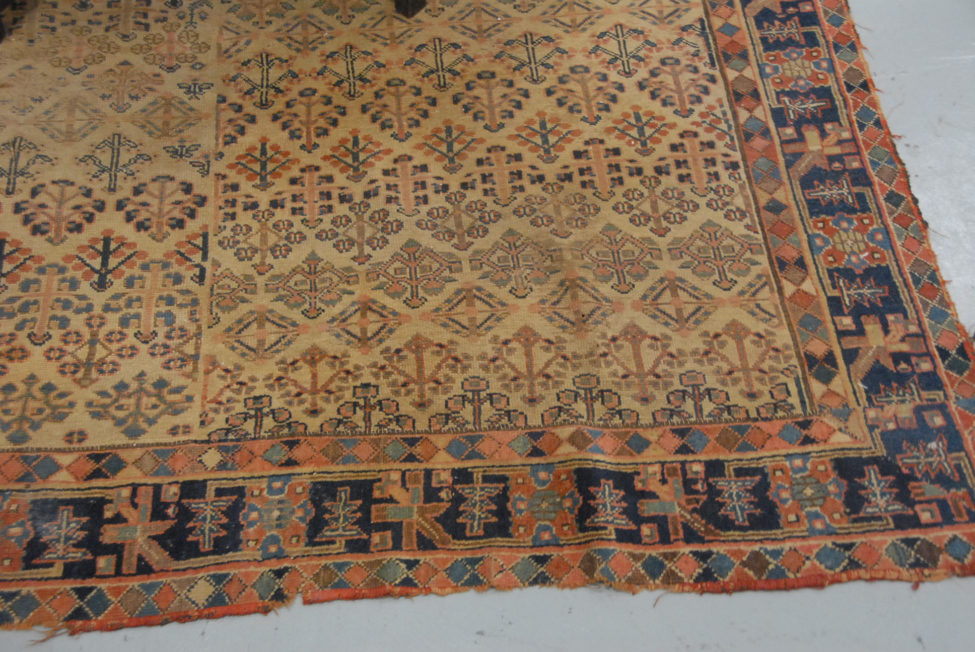 Early Persian Oriental carpet some wear, cut down. 6’5 x 11’3