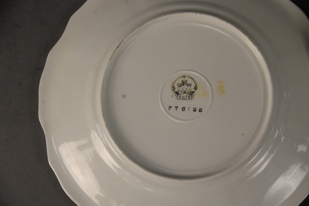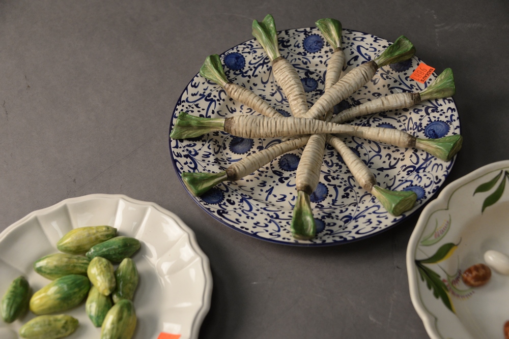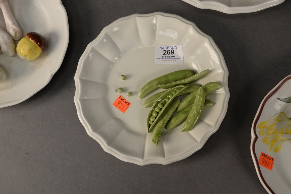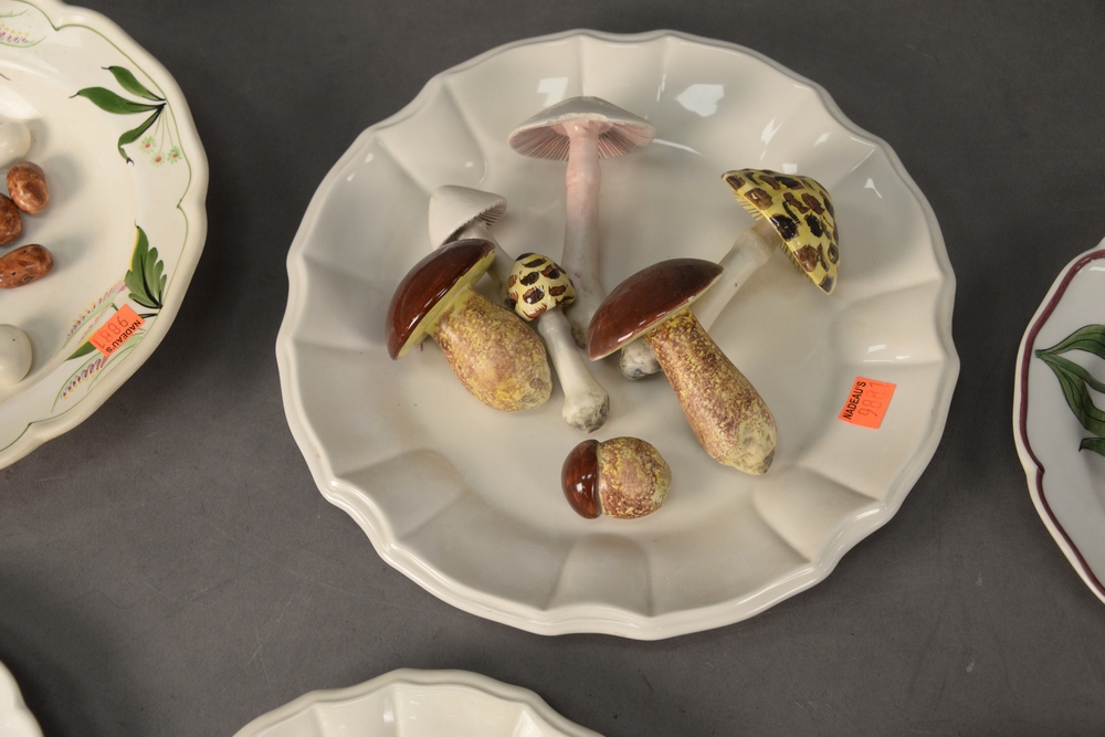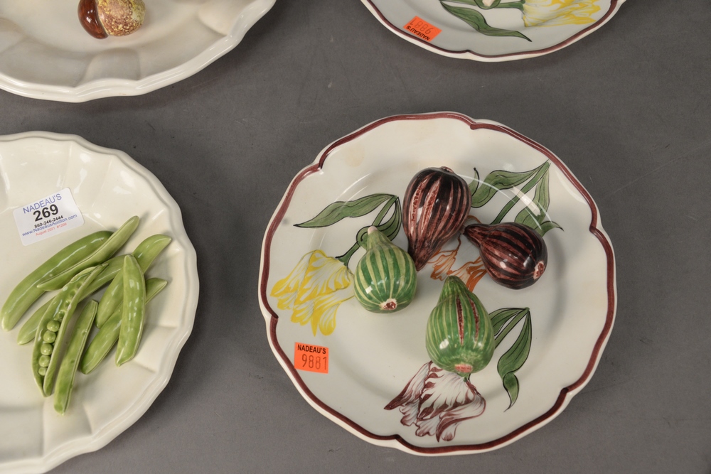 Lot 269: Eight Piece Group of Este For Tiffany Tromp L’Oeil Plates, to include two fig plates, one mushroom platter, a mushroom plate, pea pl…
