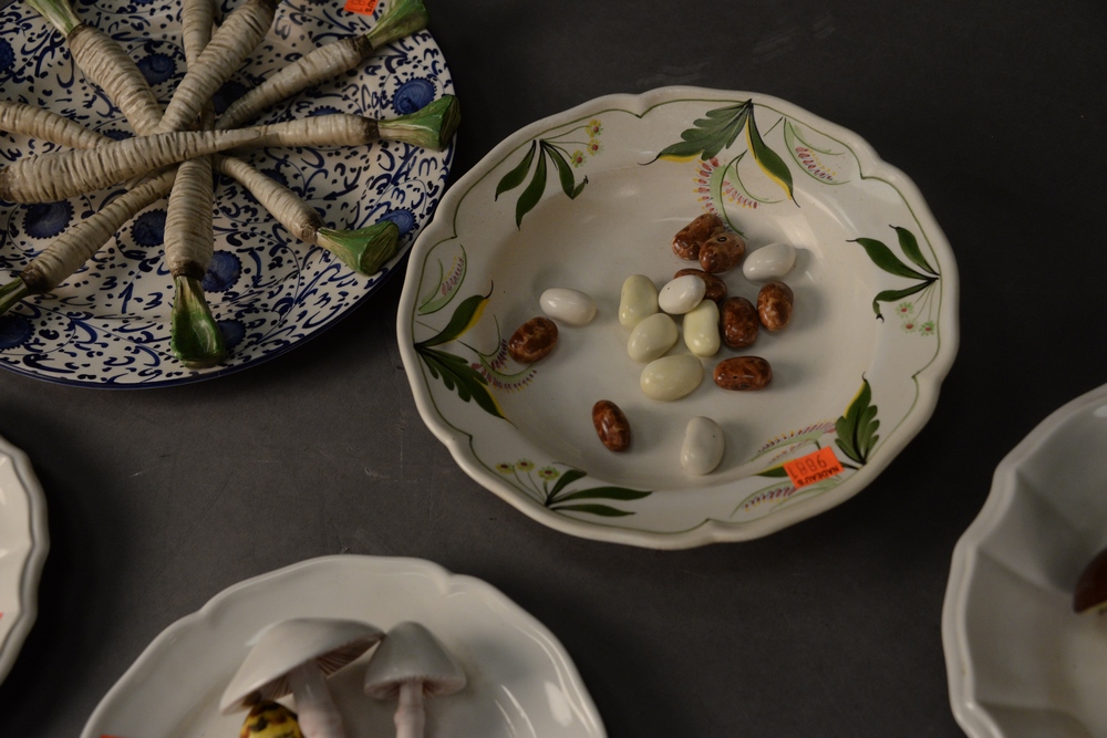Eight Piece Group of Este For Tiffany Tromp L’Oeil Plates, to include two fig plates, one mushroom platter, a mushroom plate, pea plate, a bean plate, along with a brussel sprout plate, mushroom plate diameter 10 1/2 inches.