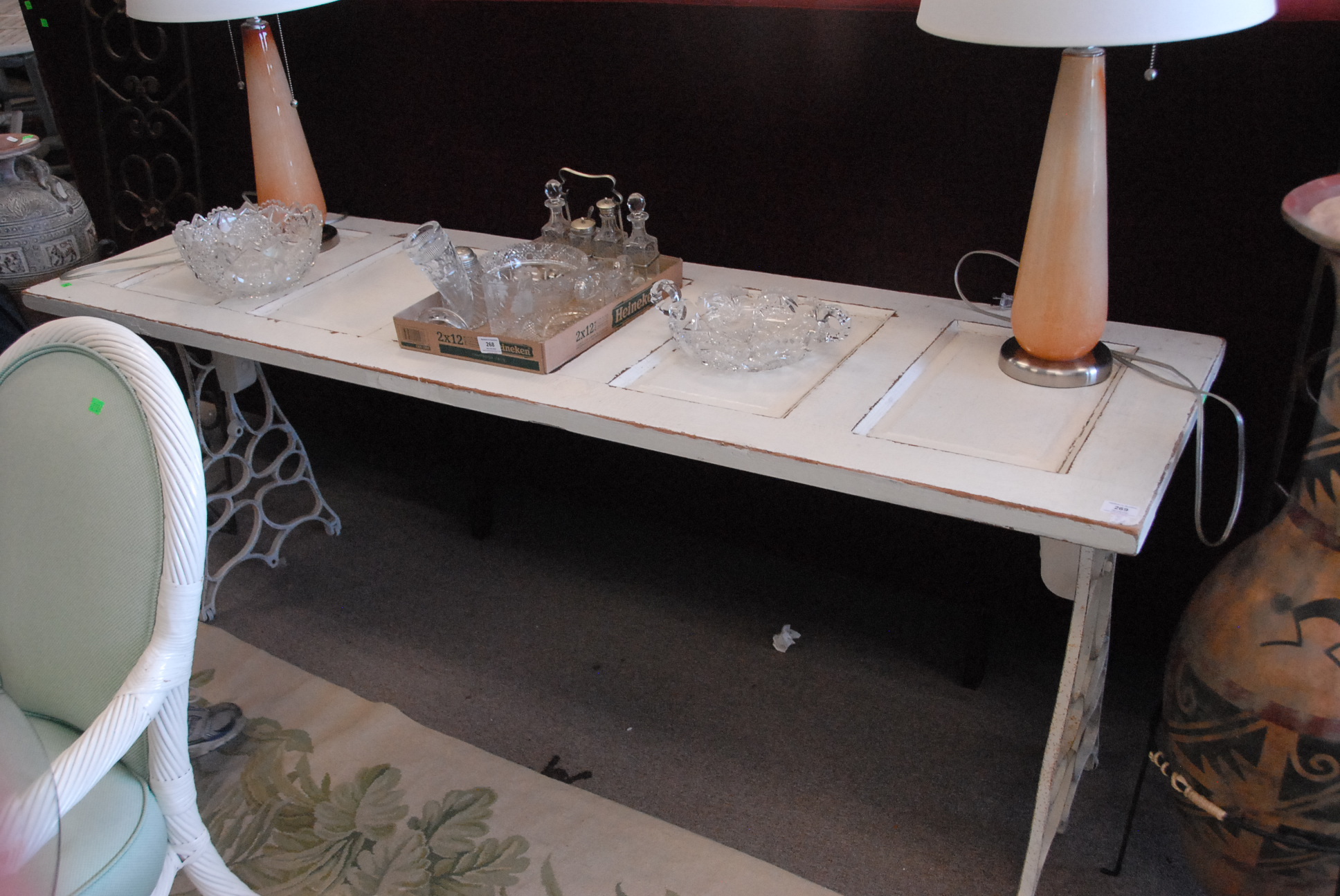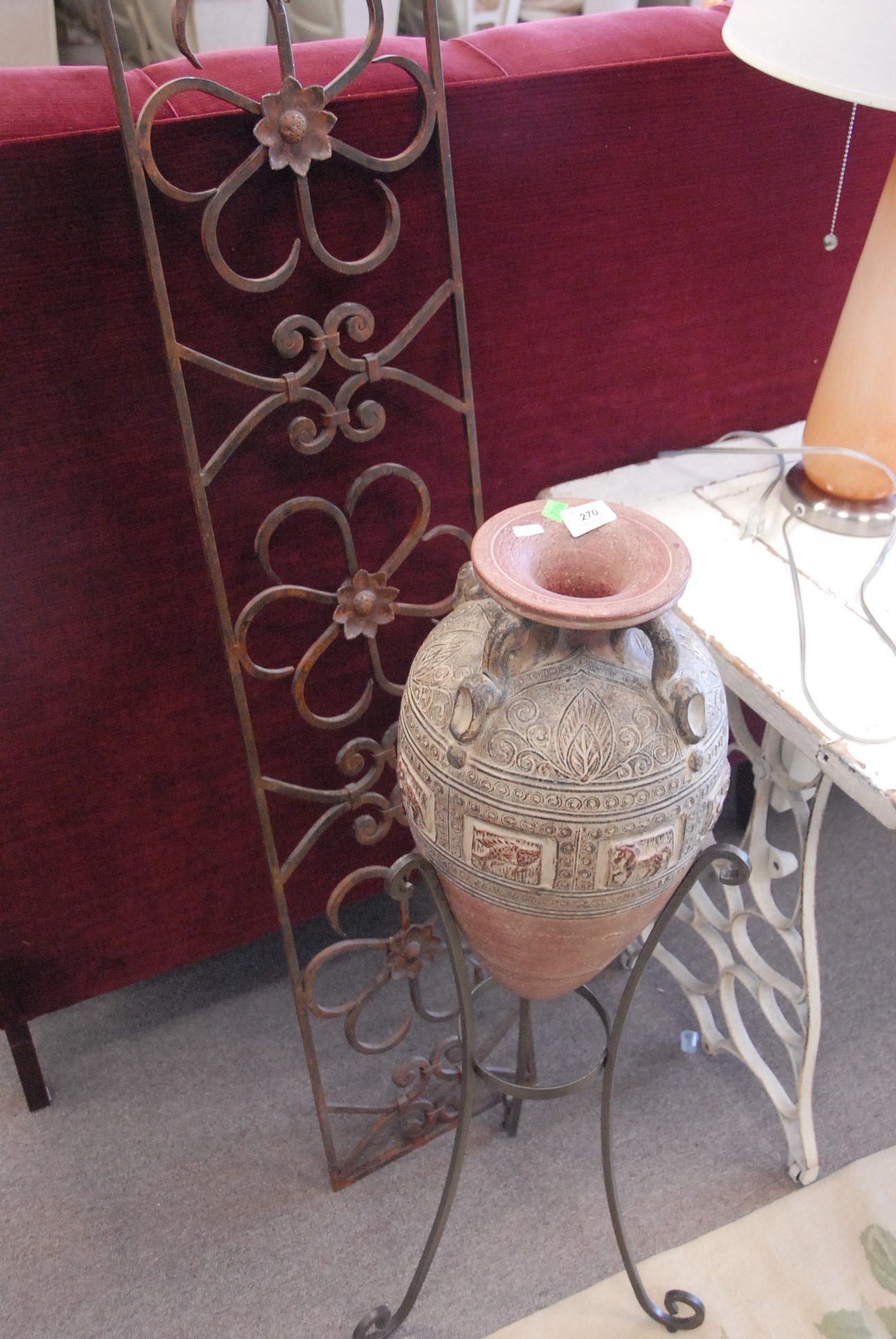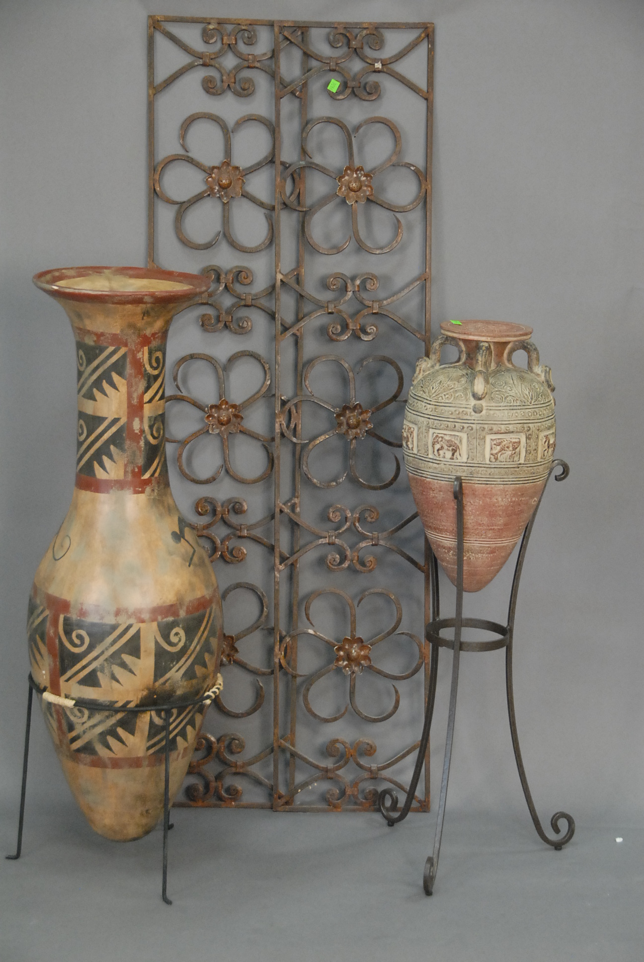 Lot 269: Five piece lot to include door/hall table with iron base, two urns, and two iron decorative wall mounts, ht. 30in. top: 23 x 60.