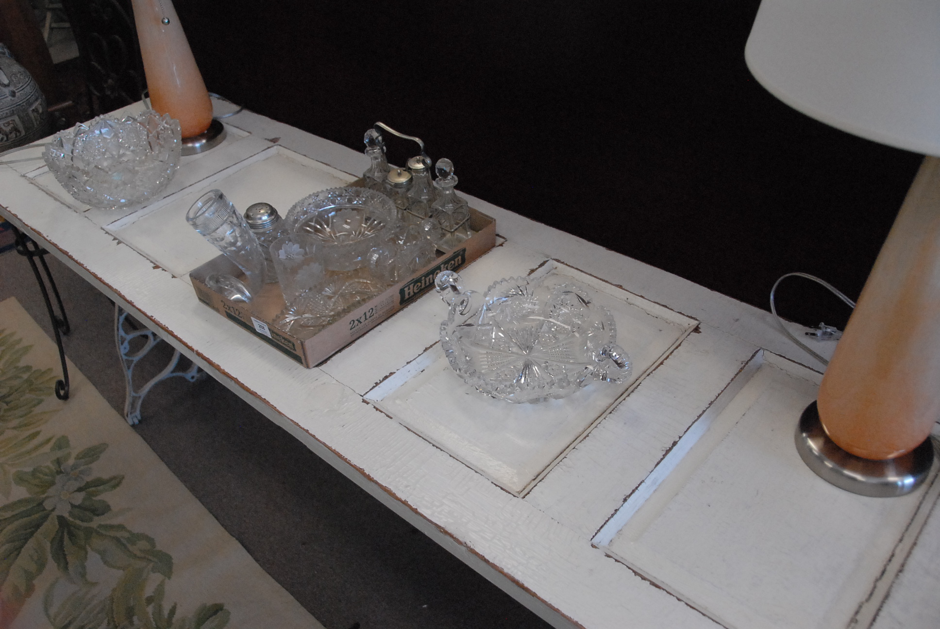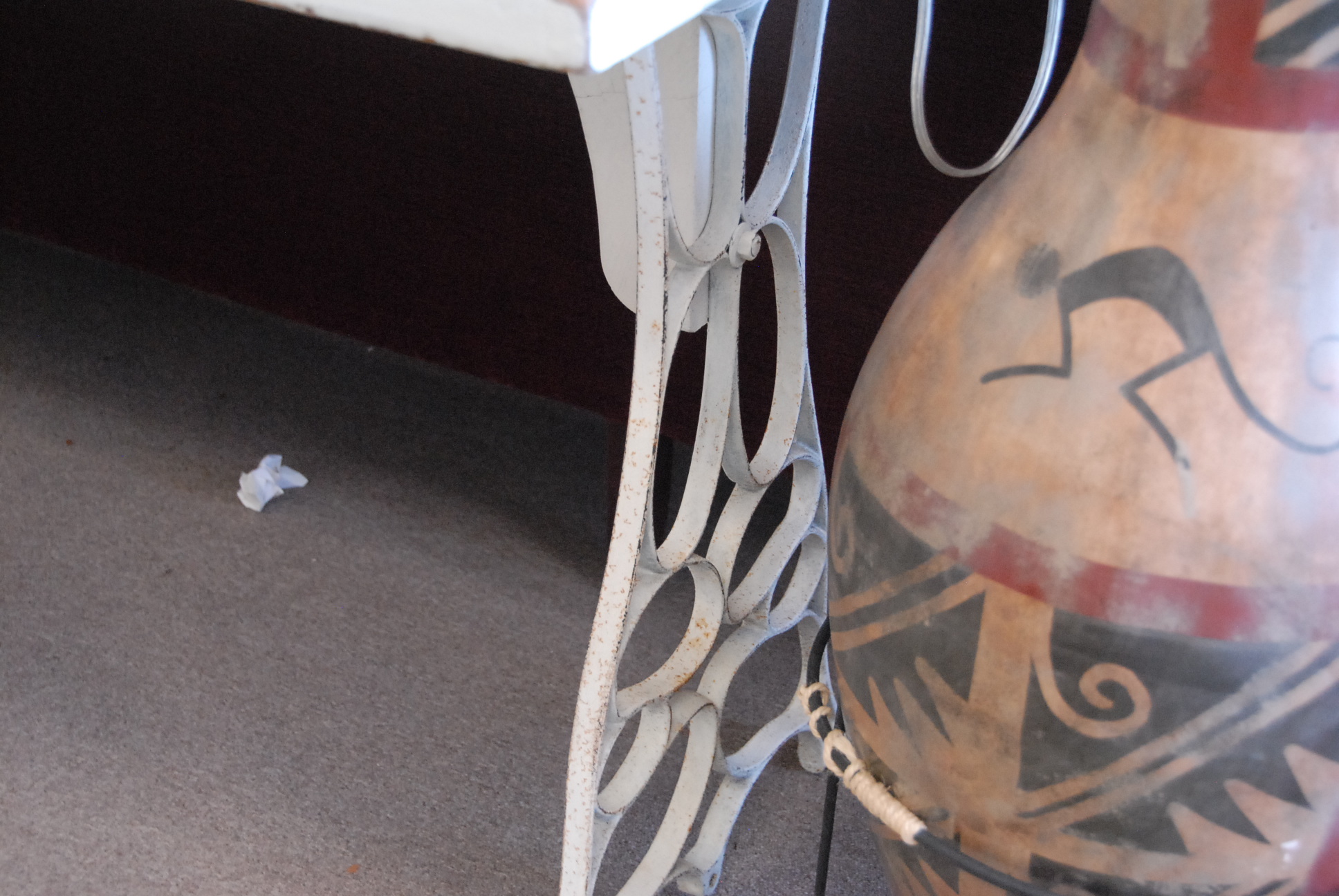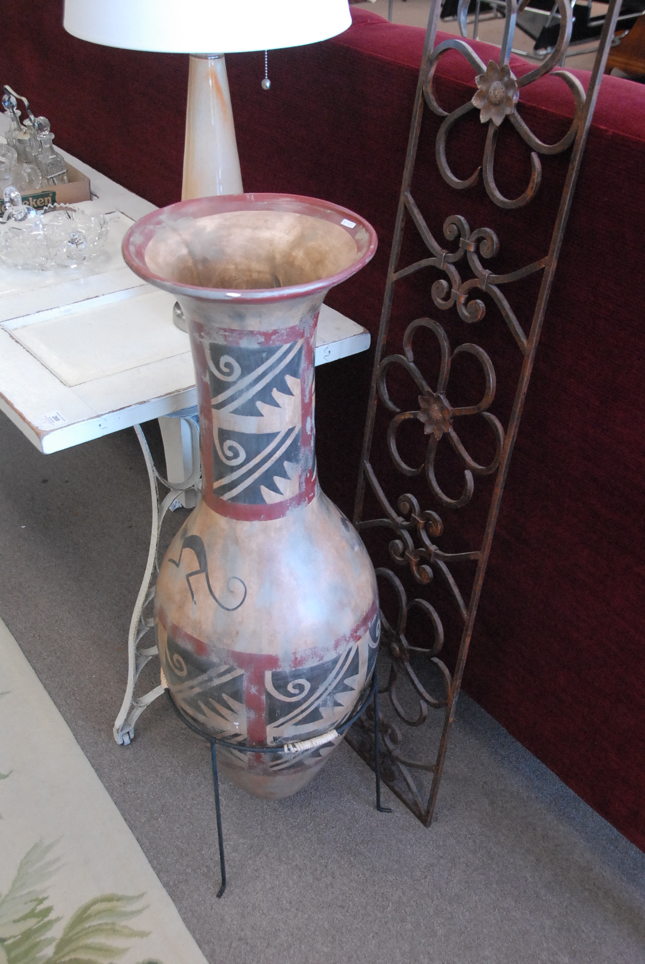 Lot 269: Five piece lot to include door/hall table with iron base, two urns, and two iron decorative wall mounts, ht. 30in. top: 23 x 60.