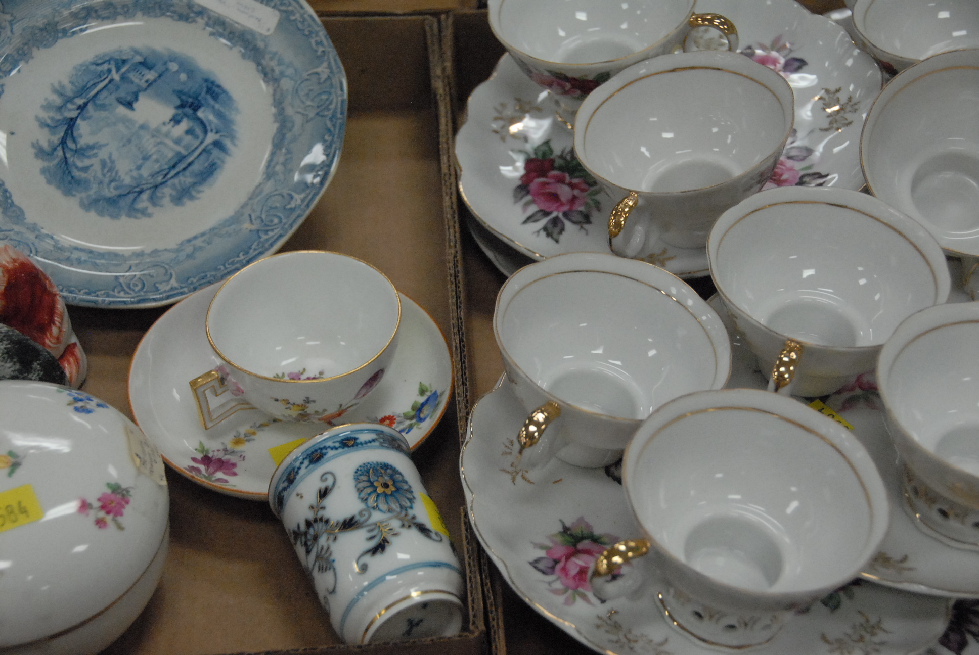 Four box lots of china, two small Staffordshire dogs, Wedgwood shallow bowl, Staffordshire plate, Meissen cup and saucer, various cups and luncheon plates.