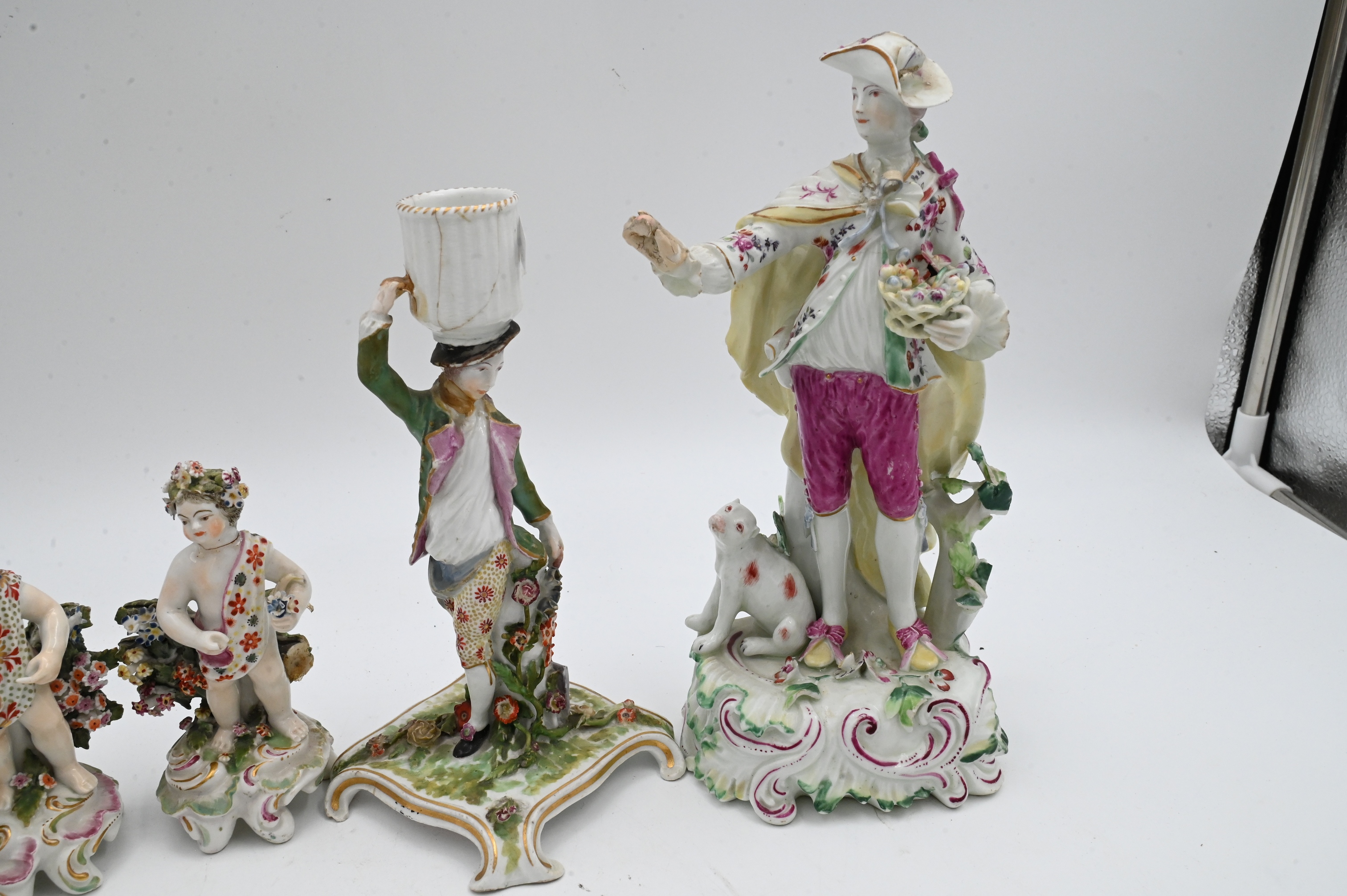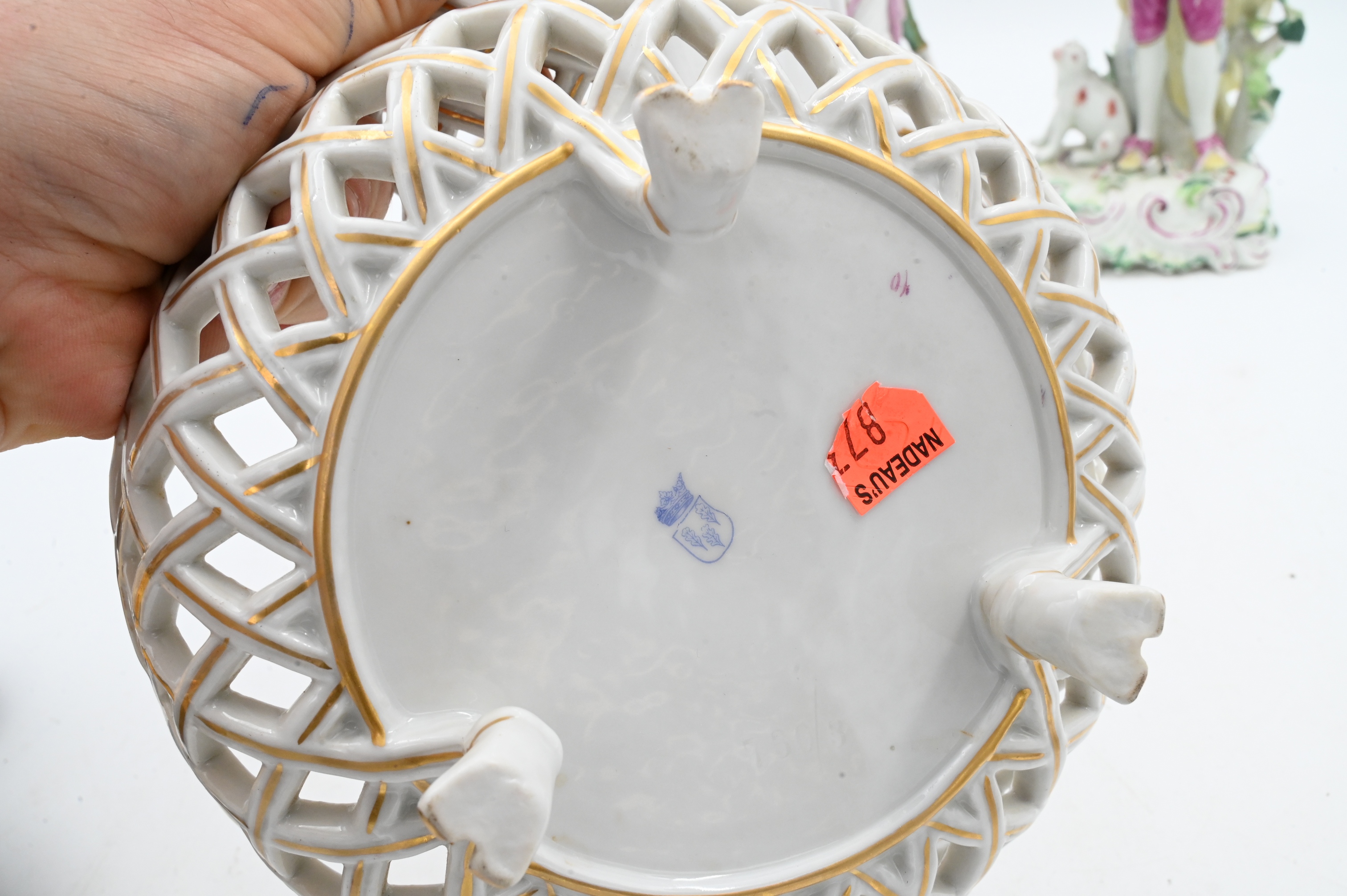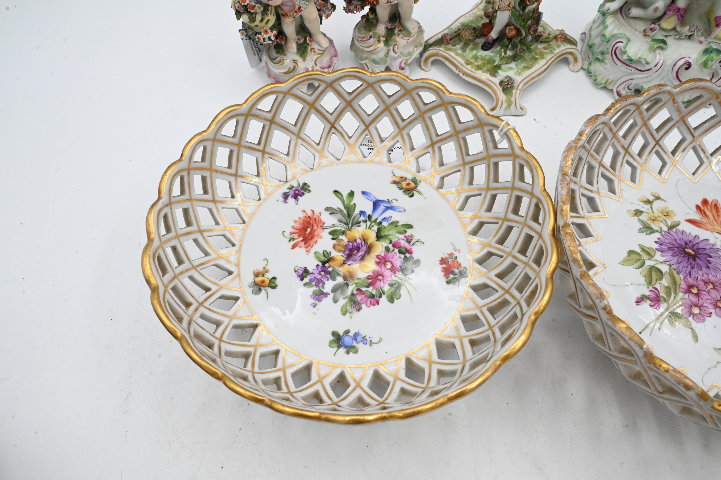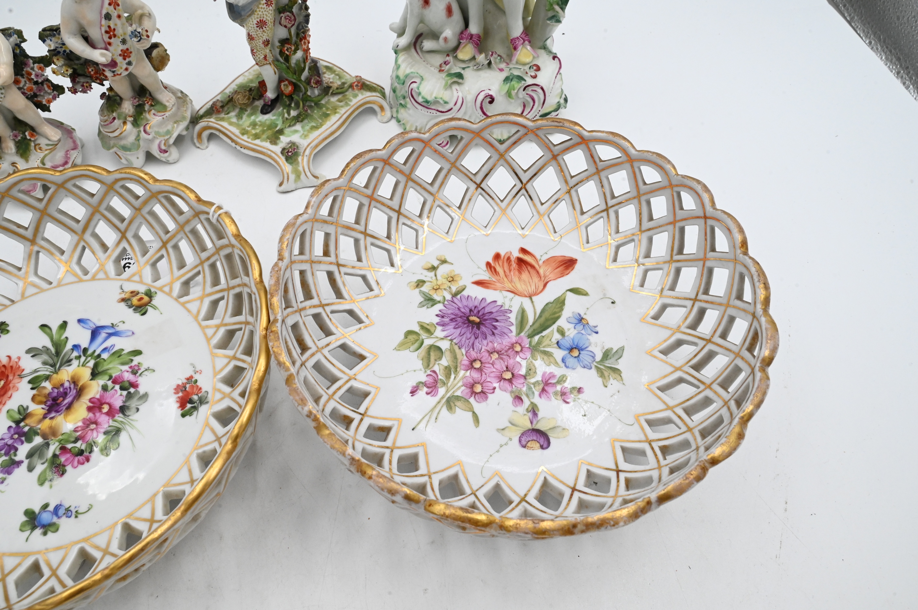 to include the Dresden shepherd figure holding a reticulated basket of flowers and eggs standing against a tree trunk beside crowns and baskets of flowers along with figural candlestick of a man beside a stump, each on gilt pedestal bases, 18th to 19th century (repairs and loss) , reticulated dishes on woven feet, one Meissen marked, the other Schierholz