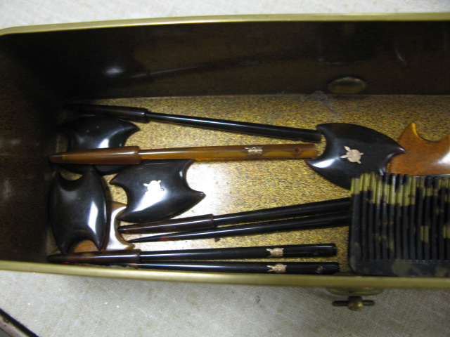Group lot Japanese enameled decorated box with raised relief and Japanese items including hairpins with small gold decorations.