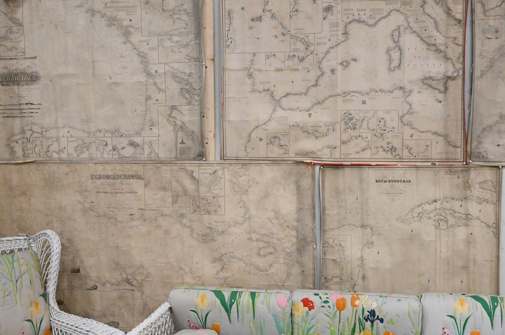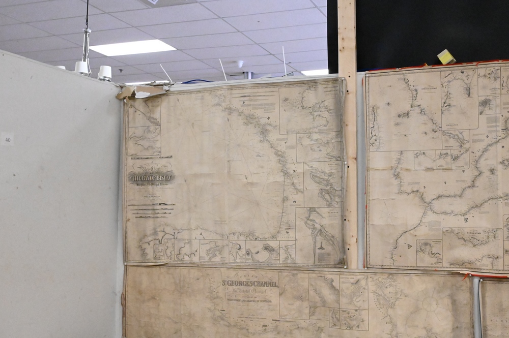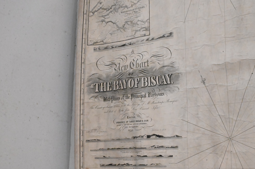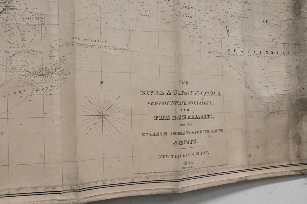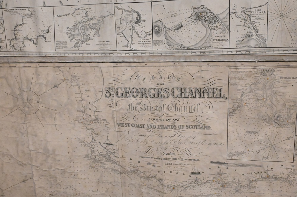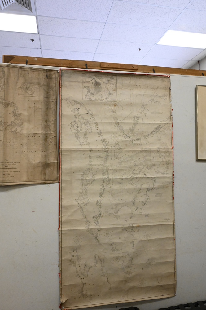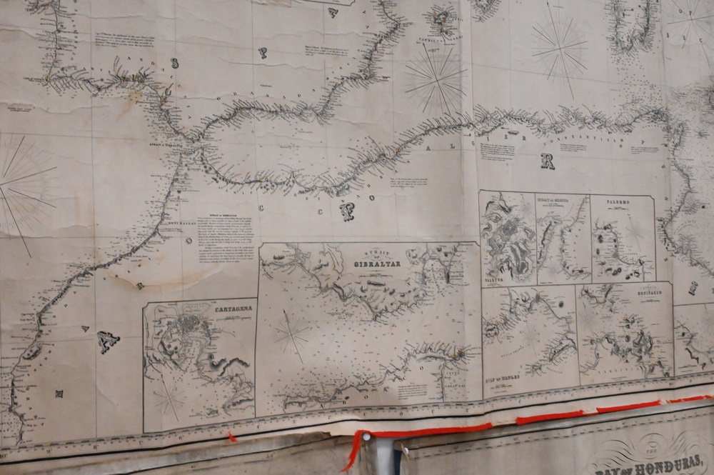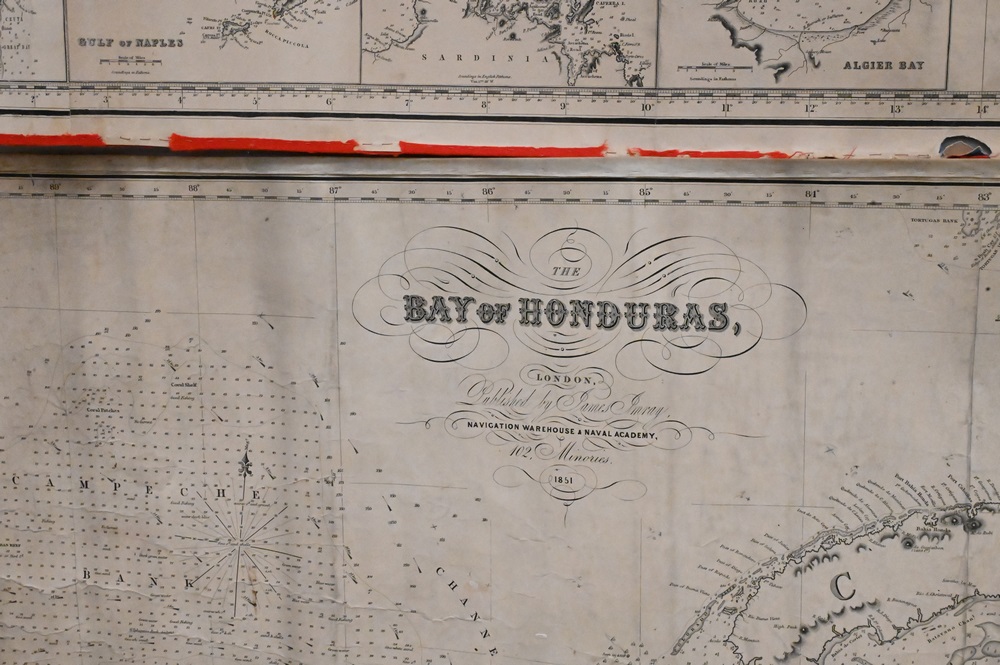 Group of Six Maps, to include James Imray & Son, Bay of Biscay; Imray & Son St. Georges Channel; James Imray’s The Bay of Honduras; E & G.W. Blunt’s The River and Gulf of St. Lawrence, Plan of Havah from the Spanish surveys; along with a large map of many mediterranean locations; largest 80″ x 41″.