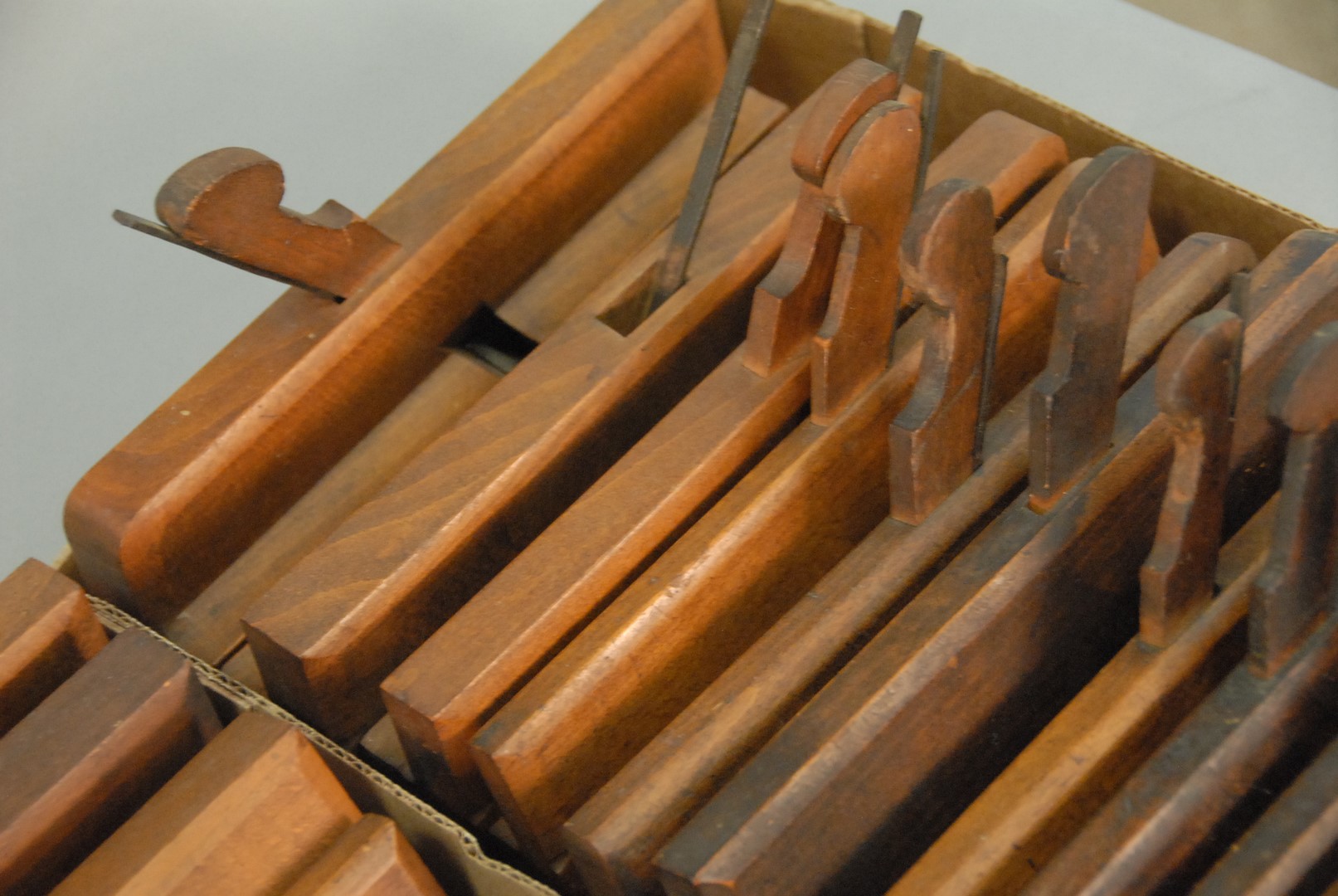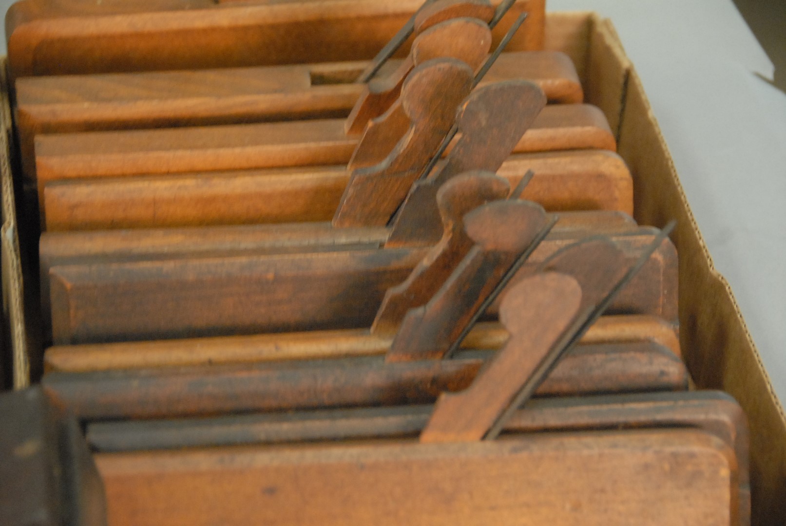 Lot 269: Group of wood planes including J. Stoke, Graillaiths Norwich, Edwd. Preston, George Adam, and other names and small mini planes.