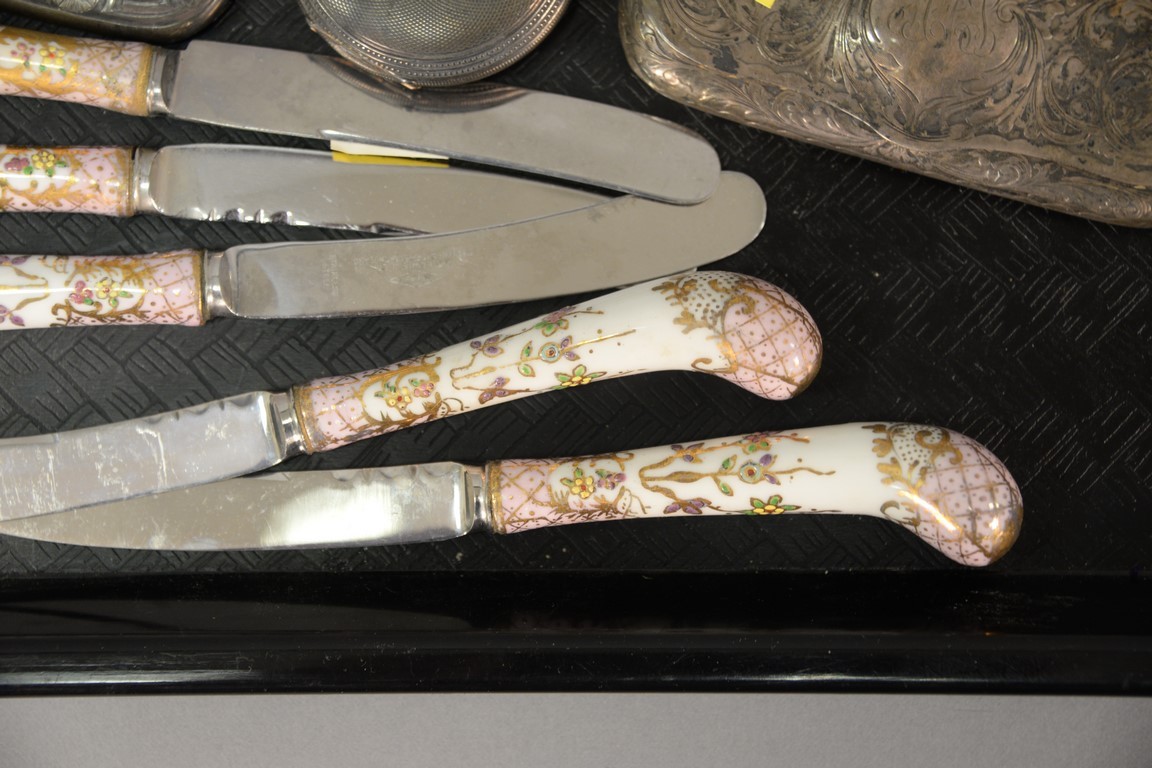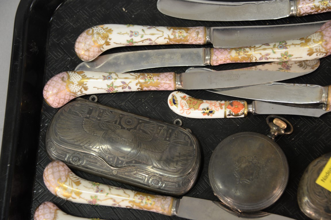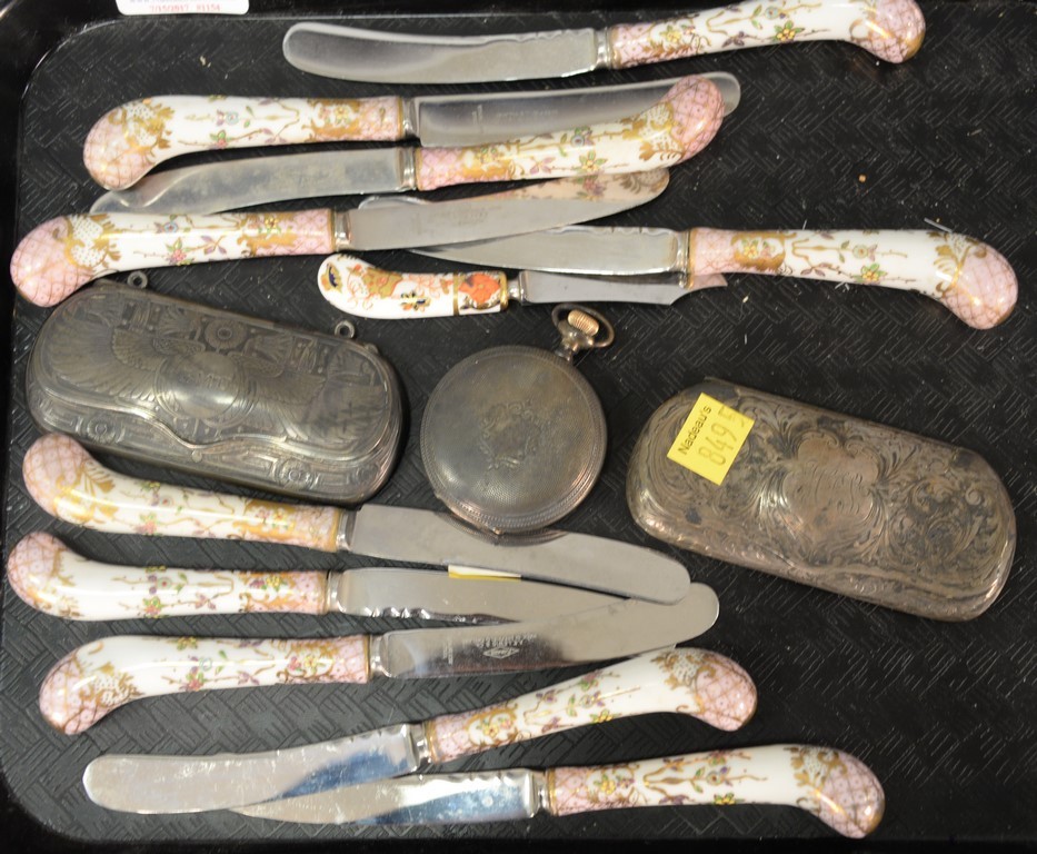Lot to include two silver cigarette, silver watch case, and porcelain handle knives.