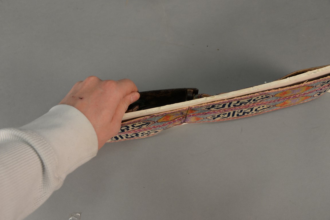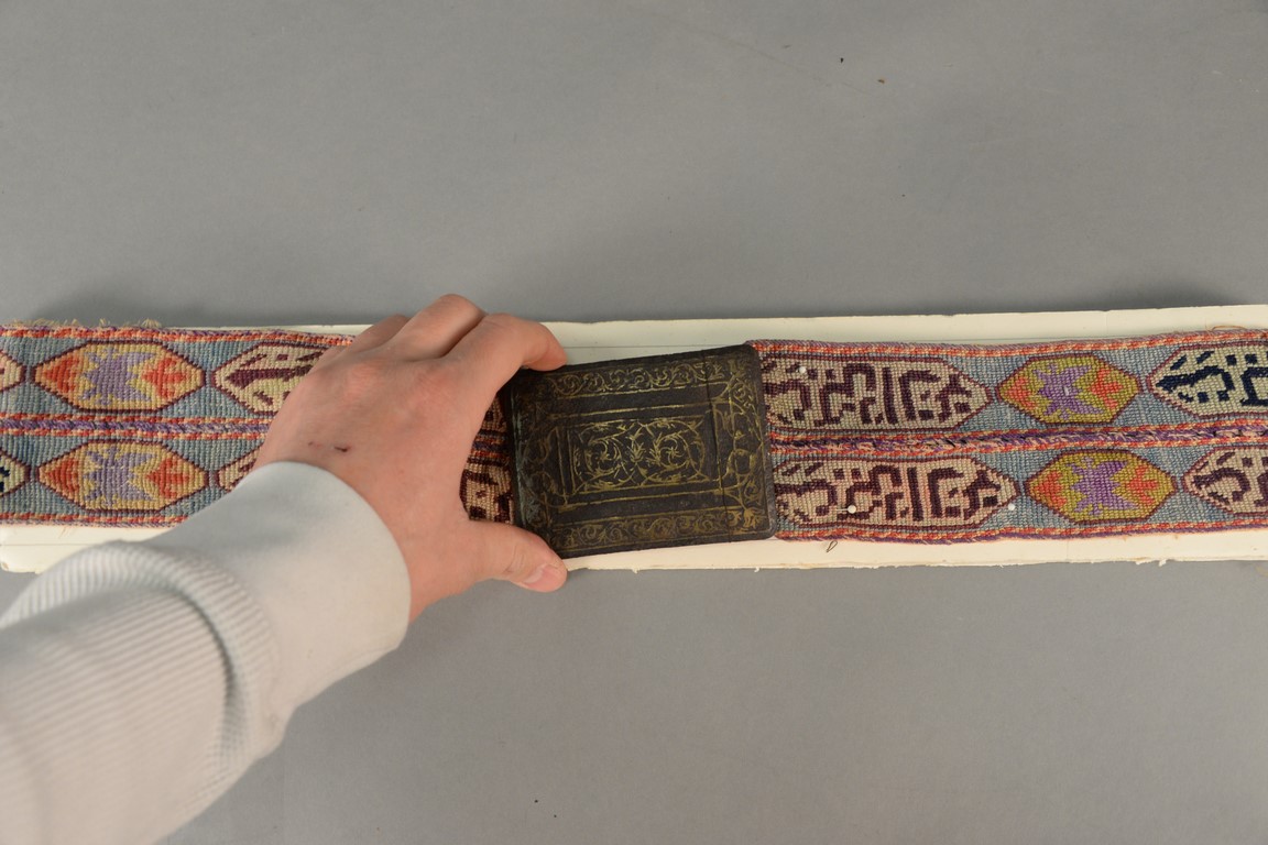 Needlepoint Middle Eastern belt with metal and gold color inlay chape. length 23 inches