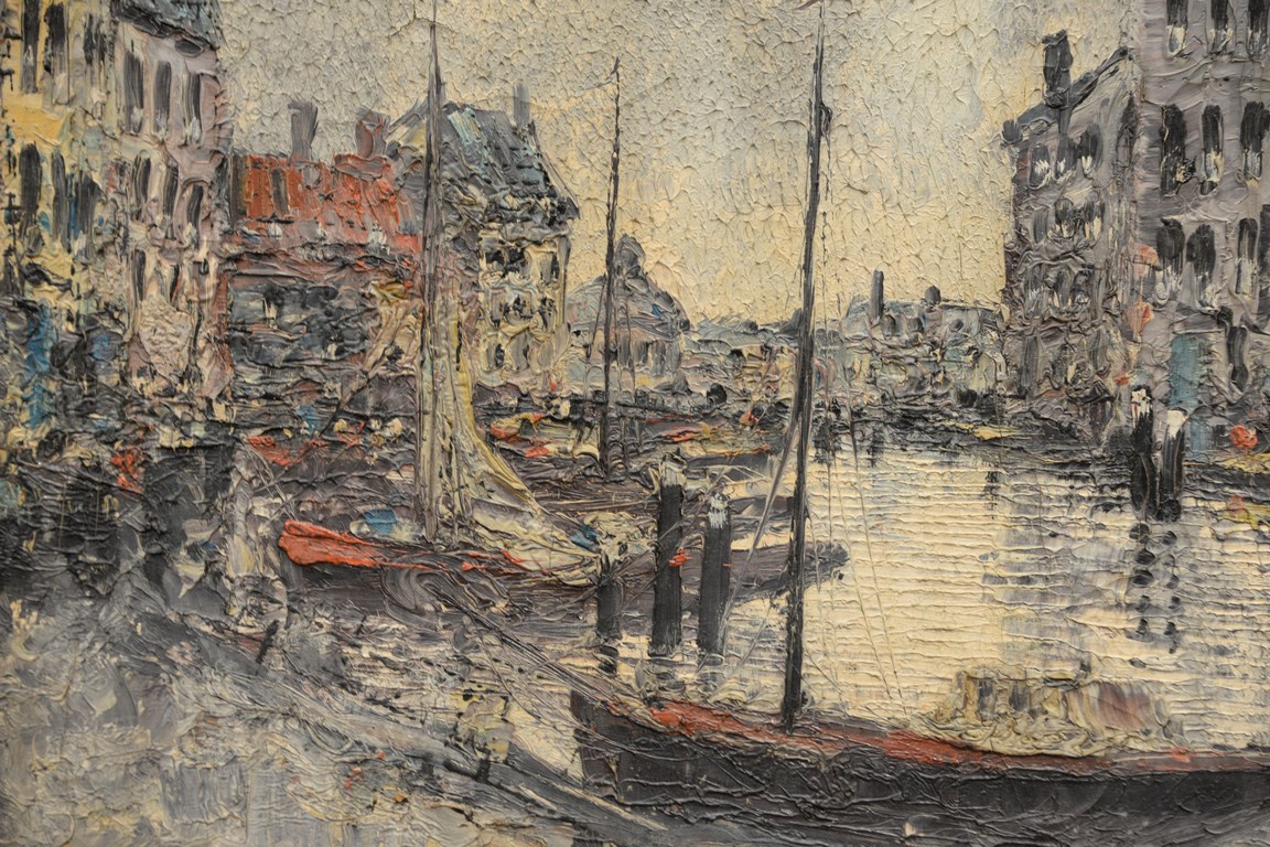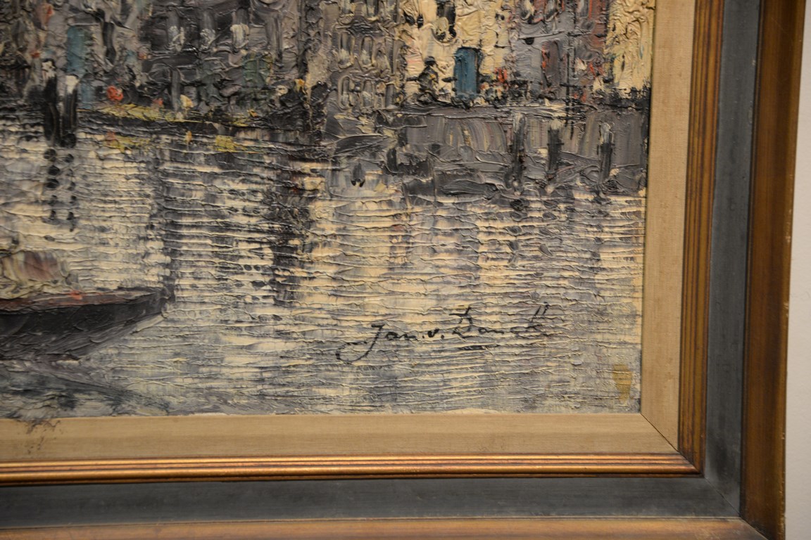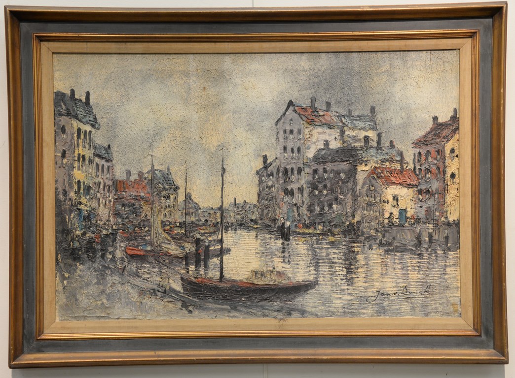 Lot 269: Oil on canvas city canal signed lower right Jan. V. Dom…, 24 x 36