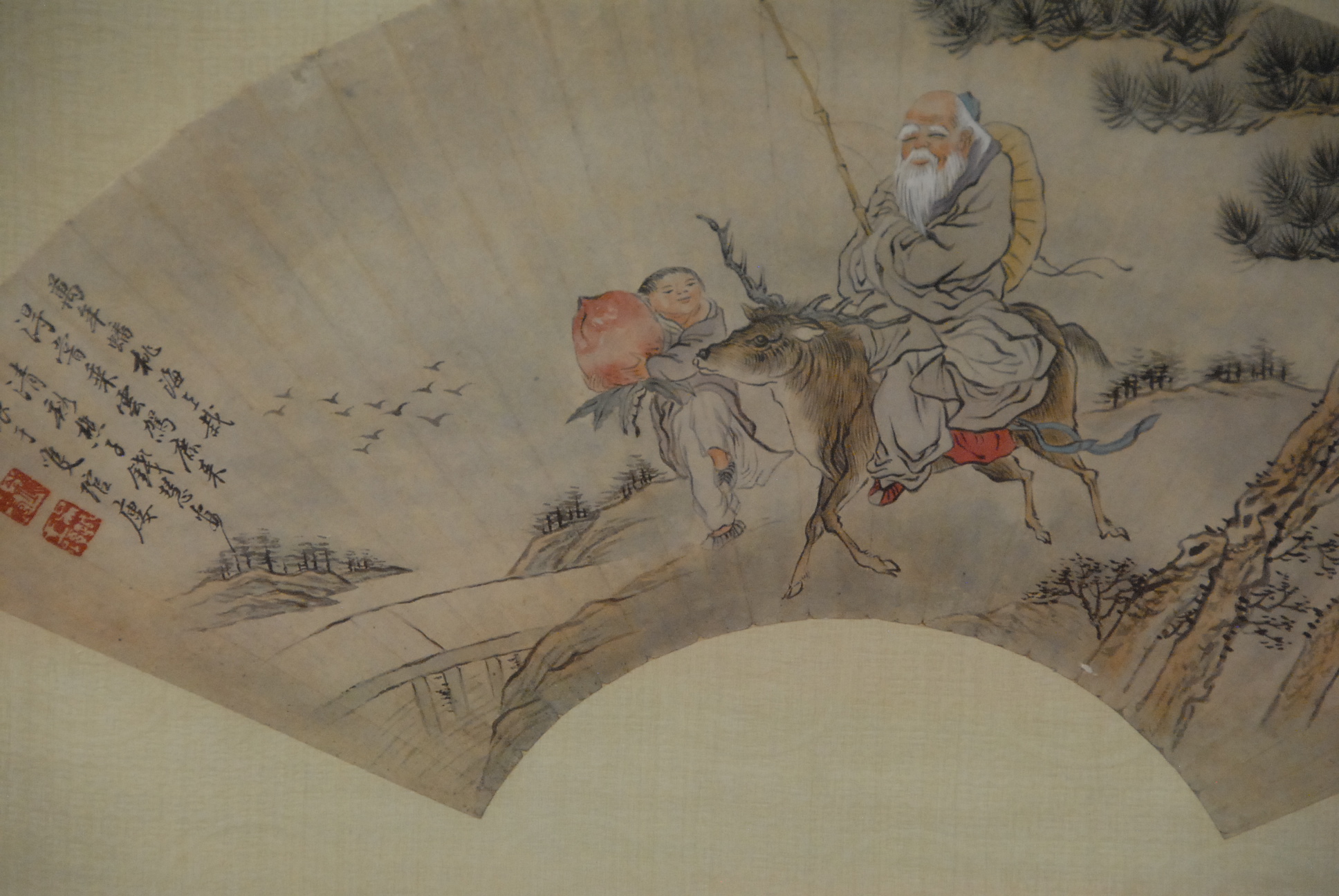 Oriental framed painting on fan of scholar riding a deer, lg. 21in.