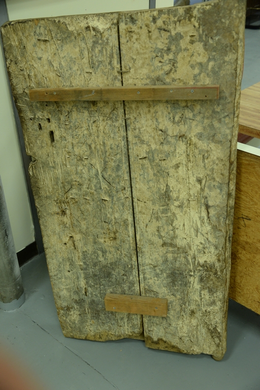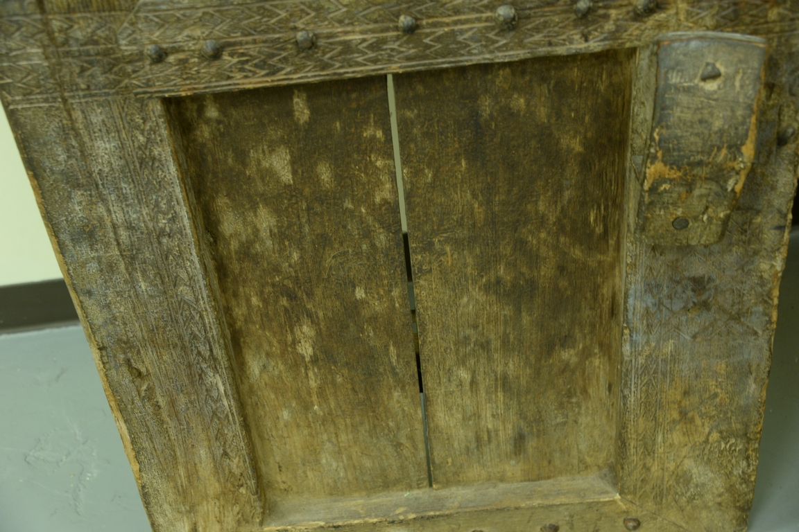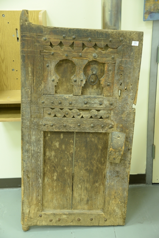 Lot 269: Primitive carved door and large steel head nail decoration, possibly several hundred years old, 29 x 52 plus hinges.