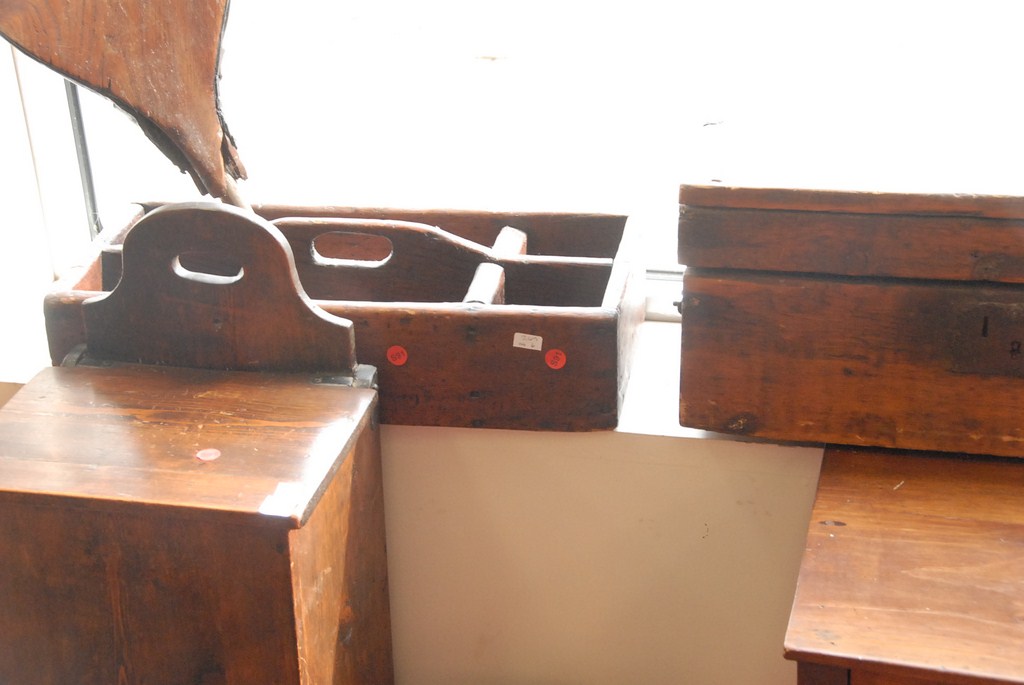 Lot 269: Primitive six piece lot wash stand, lift top chest, bellows, child’s rocker, lift top box, and tool tray.