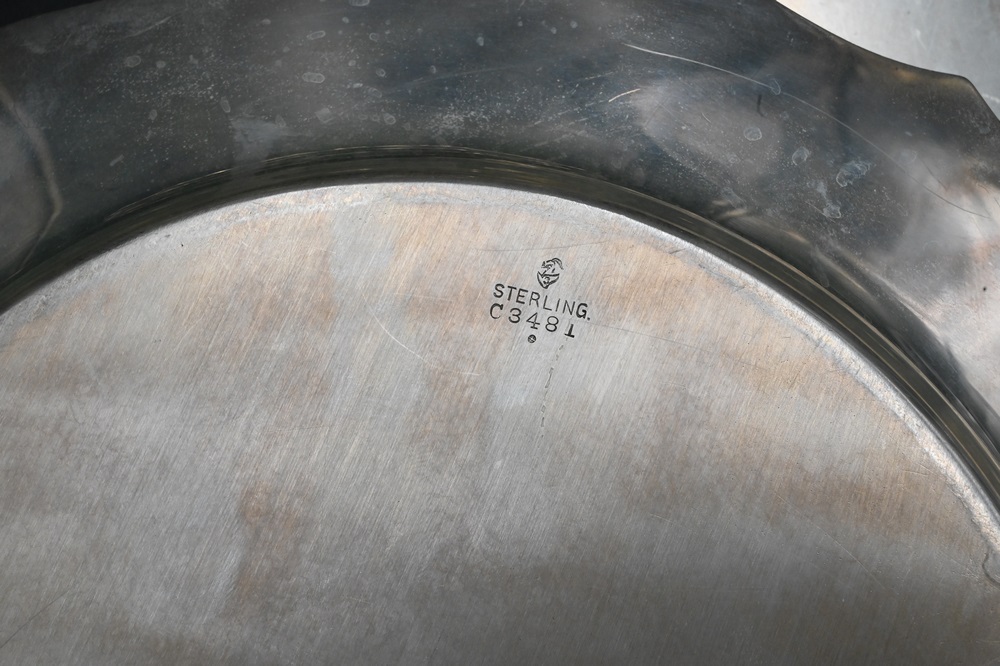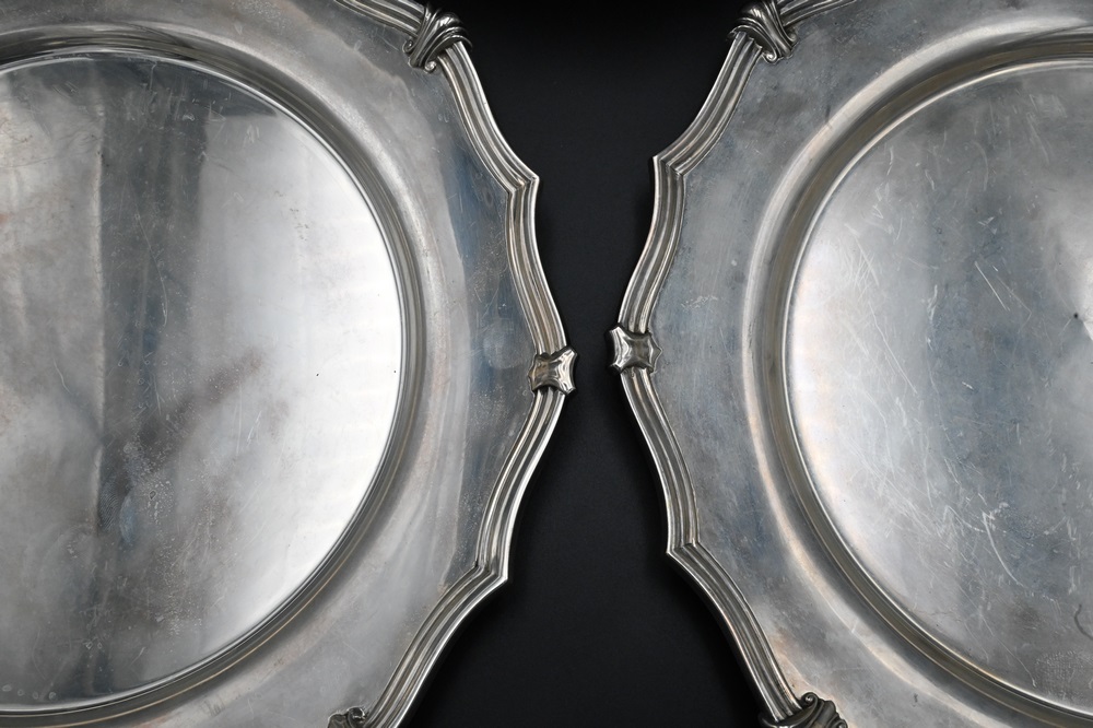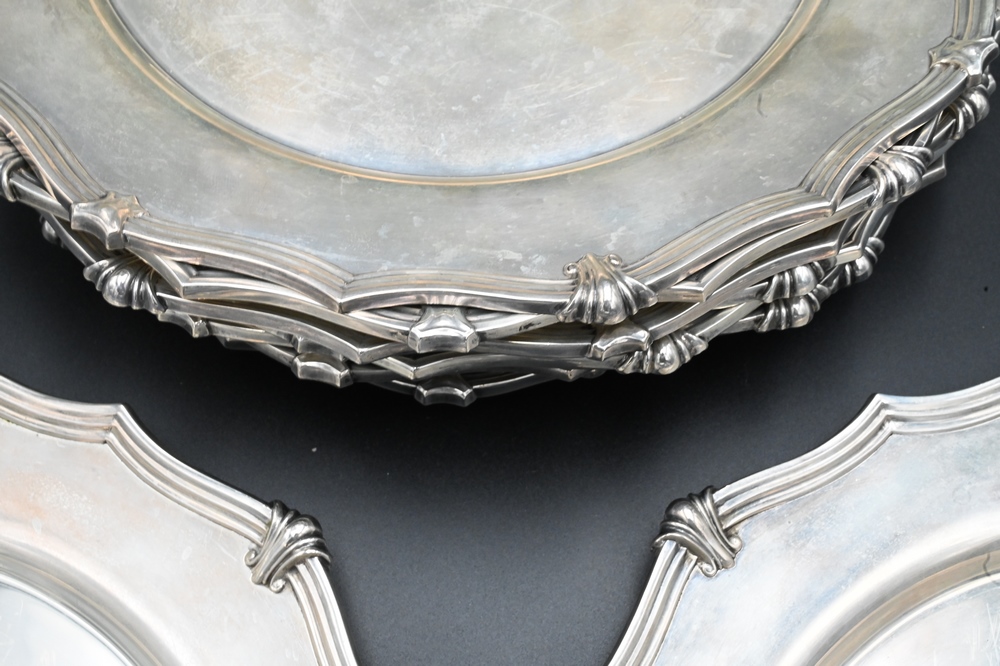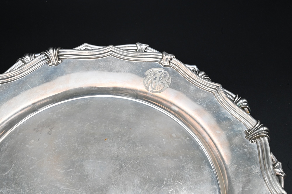 Lot 269: Set of 12 Sterling Silver Service Plates, having shaped edge, monogrammed, diameter 10 3/4 inches, 176 t.oz,