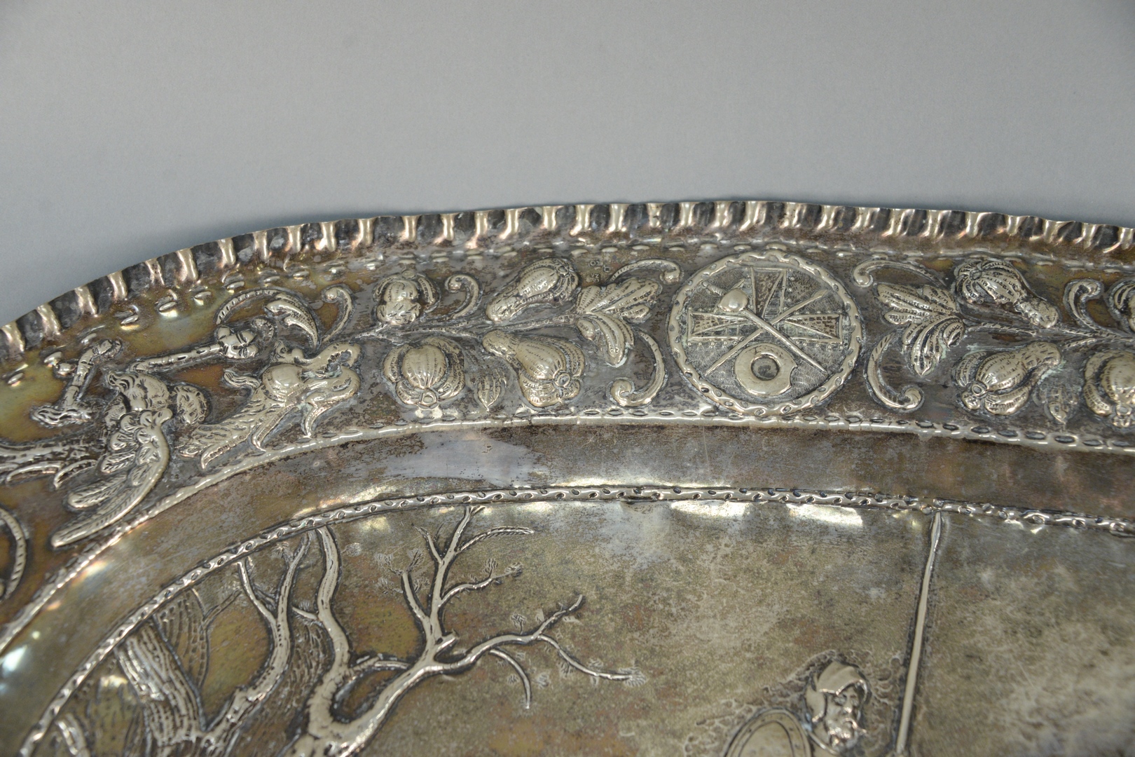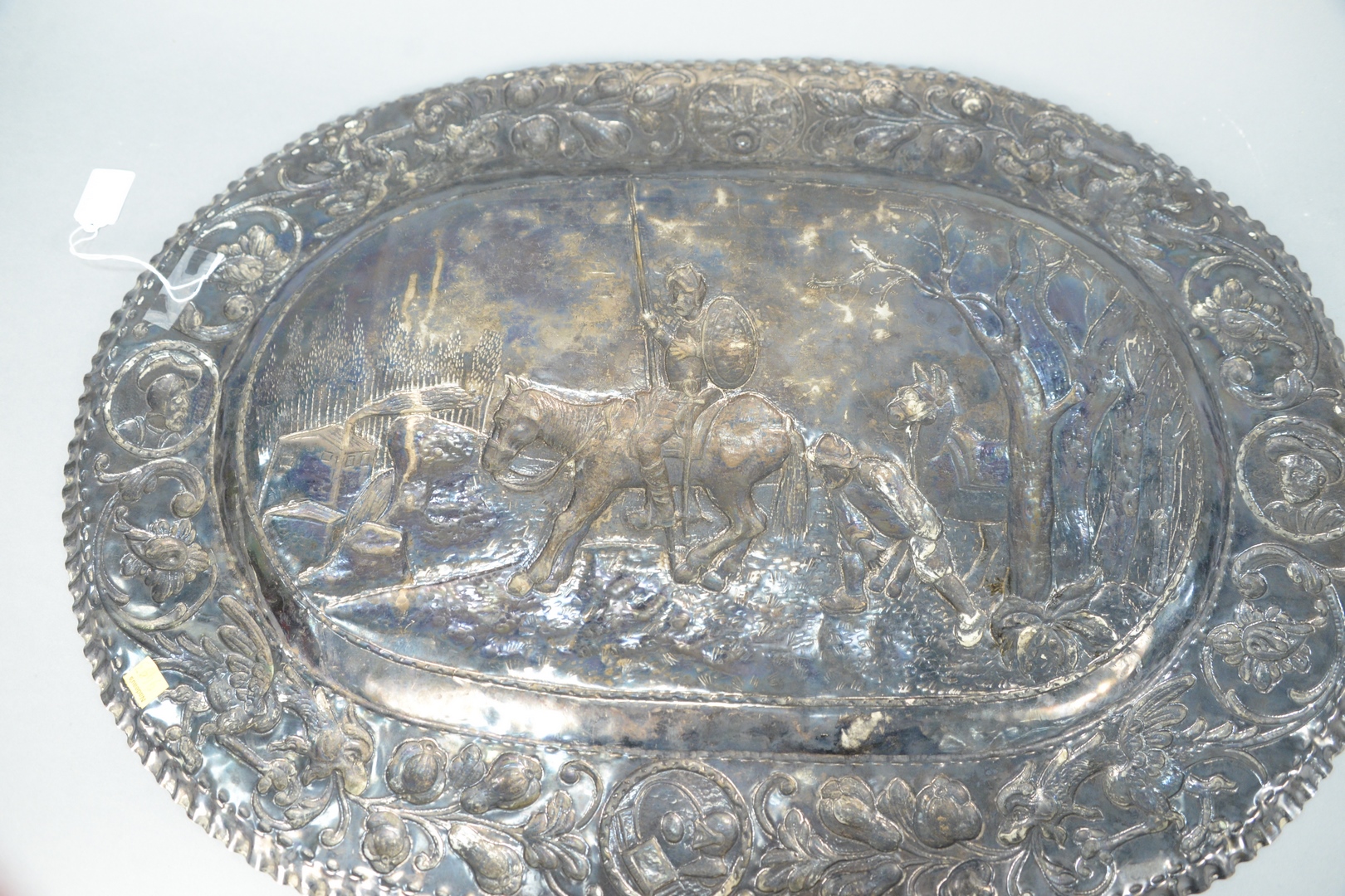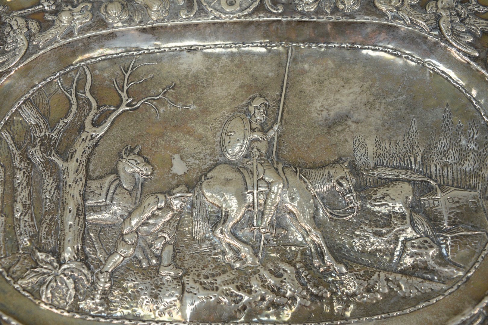 Lot 269: Silver Embossed Tray with Don Quixote on Donkey and landscape, with embossed border possibly Diego Gonzalez de la Cuevas marked on r…