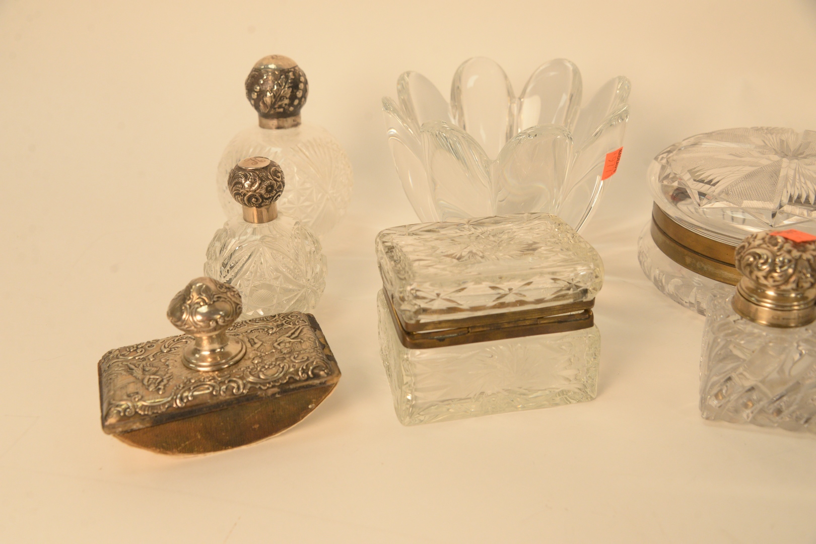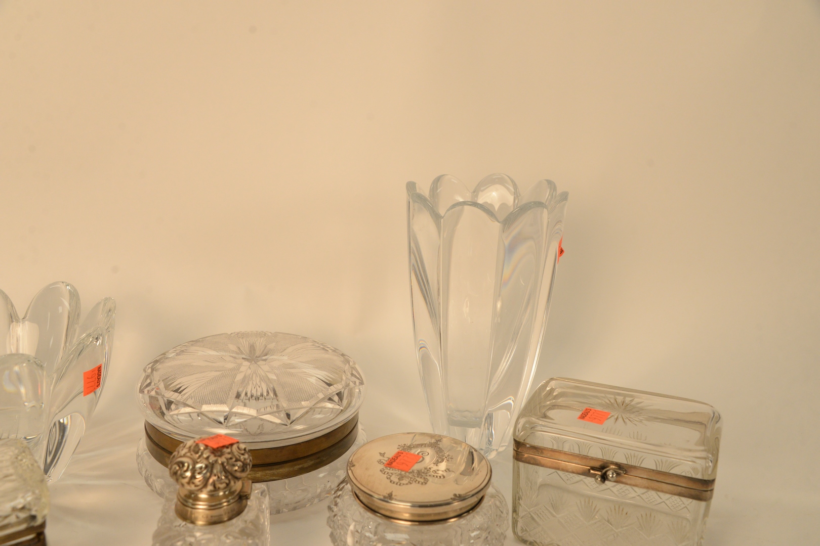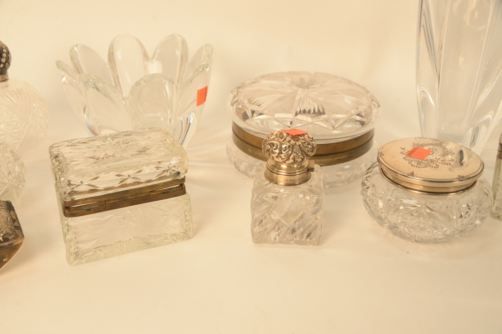 Ten Piece Crystal Lot, to include, boxes, orrefors, vases, inkwell with sterling top, two bottles with sterling tops, etc.; along with silver desk stamp, tallest 8 1/2 inches.