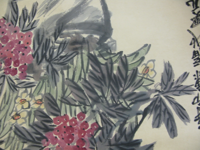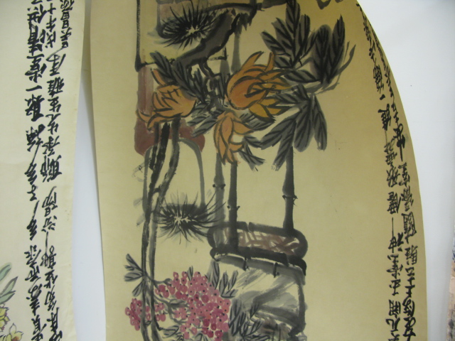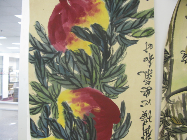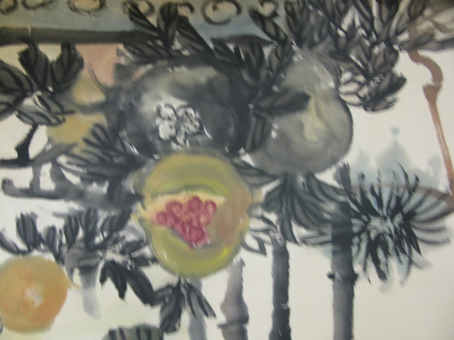 Three Oriental paintings peaches, blossoming tree and potted plants.