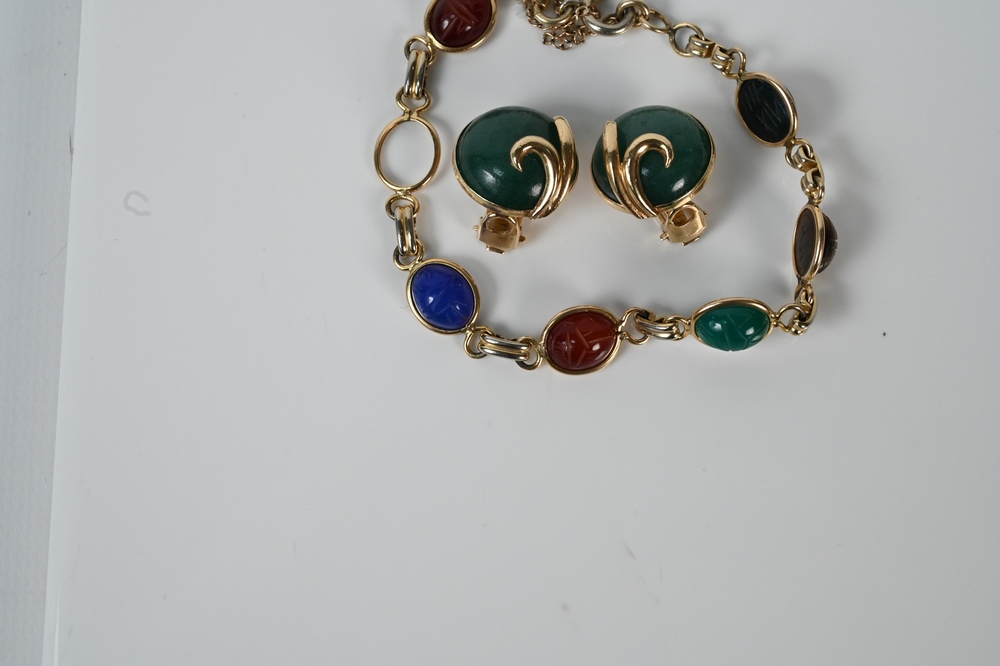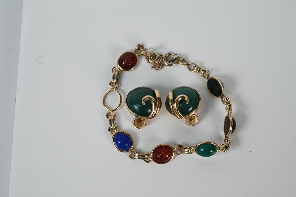 Three Piece Group of Jewelry, to include pair of 14 karat gold and stone earrings, along with a 14 karat gold filled bracelet having scarab hard stones, length 7 inches.