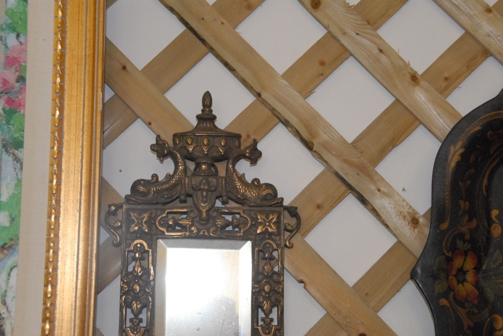 Two piece lot early tole tray with hanger and mirrored brass wall sconce signed Bradley and Hubbard.