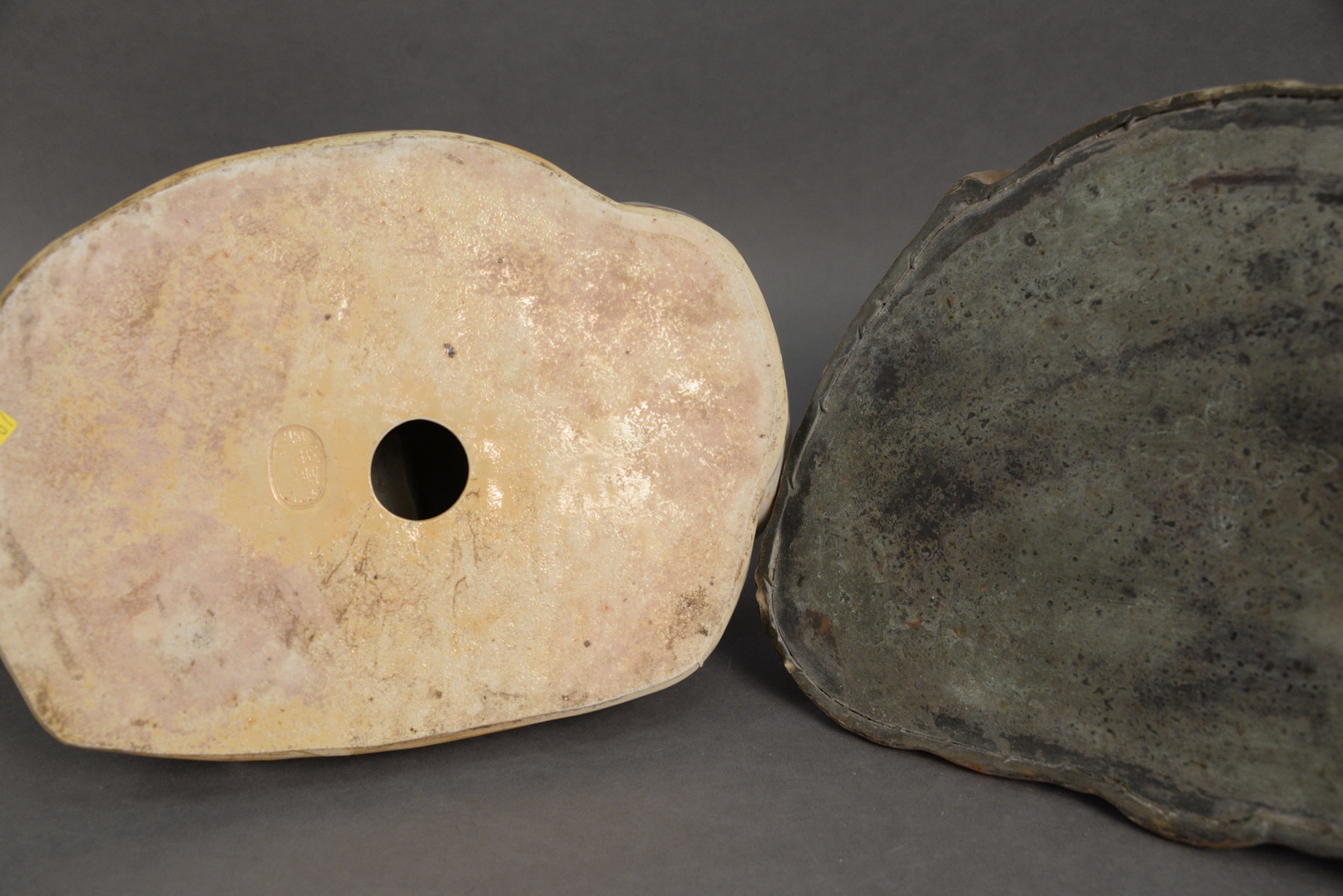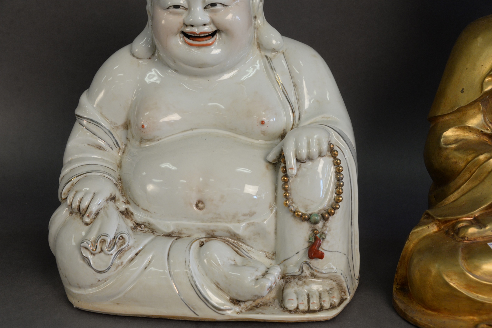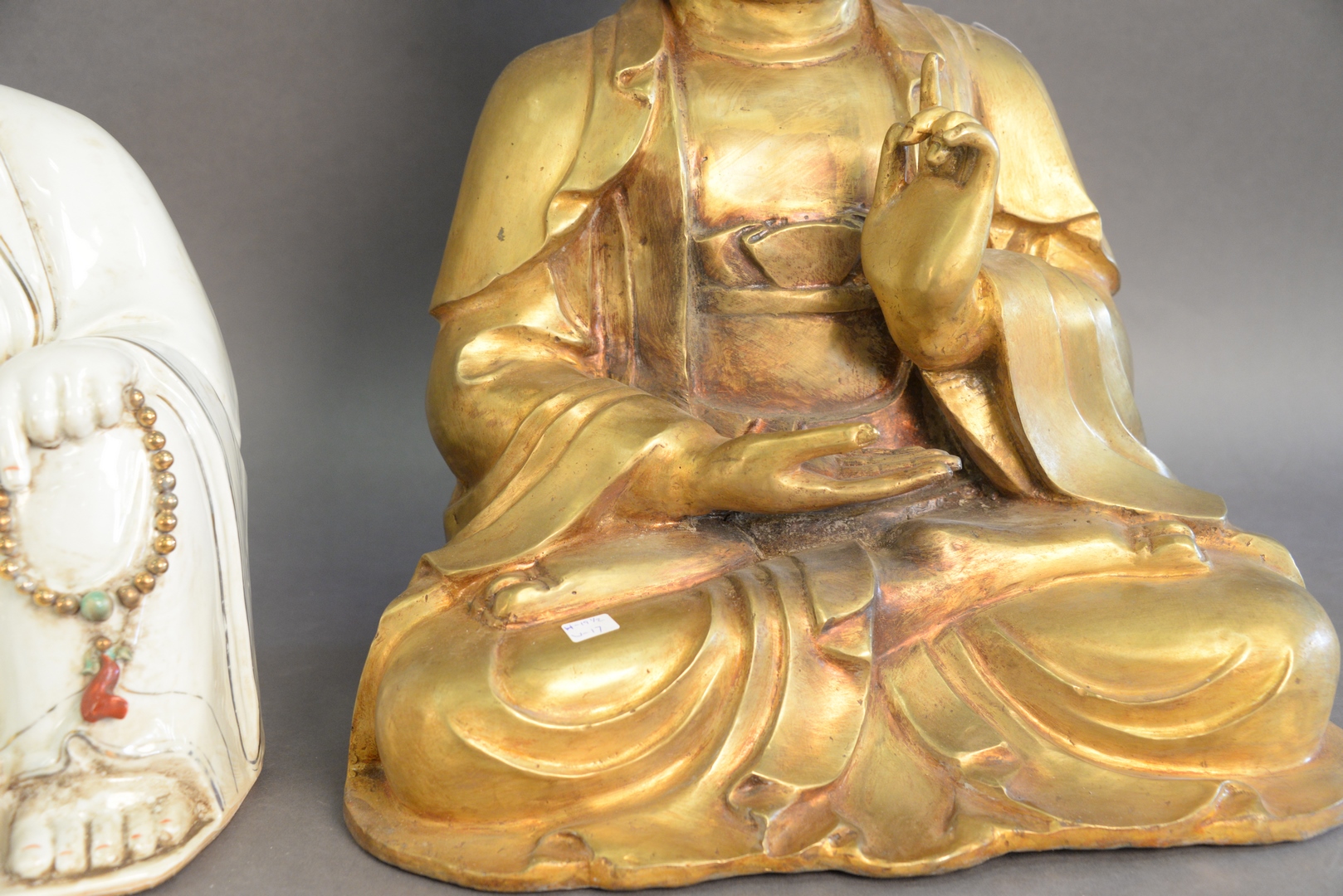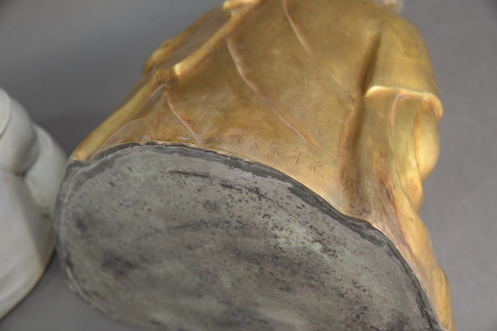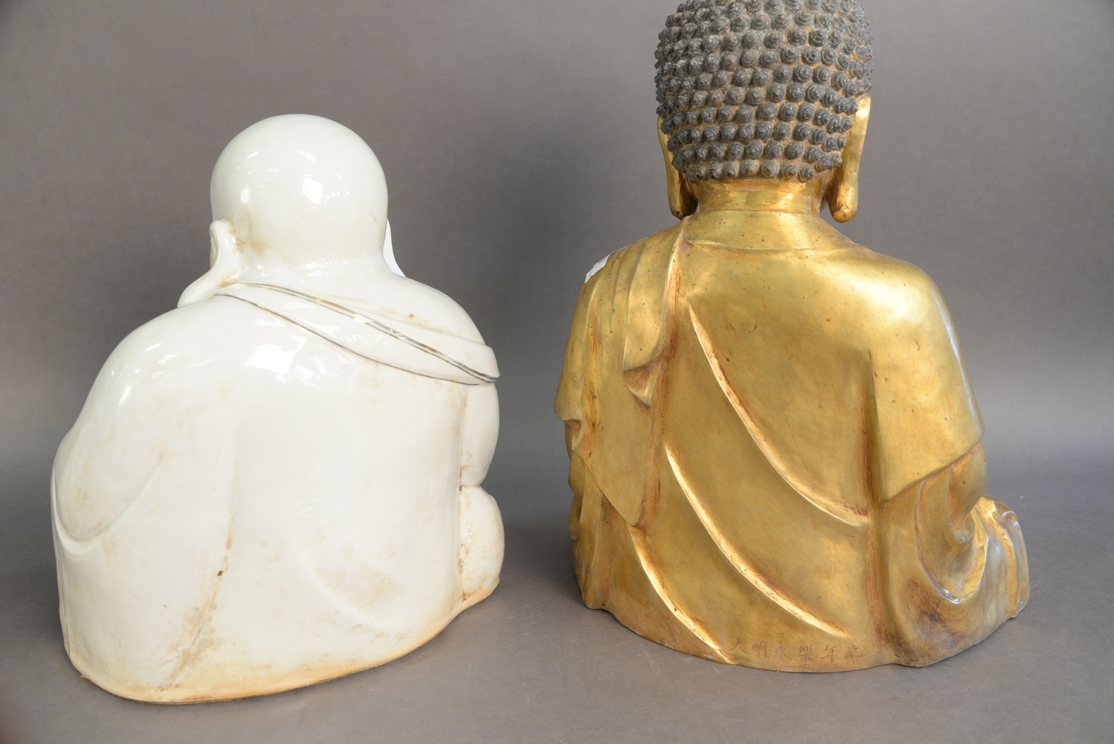 Two piece lot to include a gilt bronze Buddha figure, height 19 inches, along with a white glazed ceramic Buddha figure, height 15 inches.