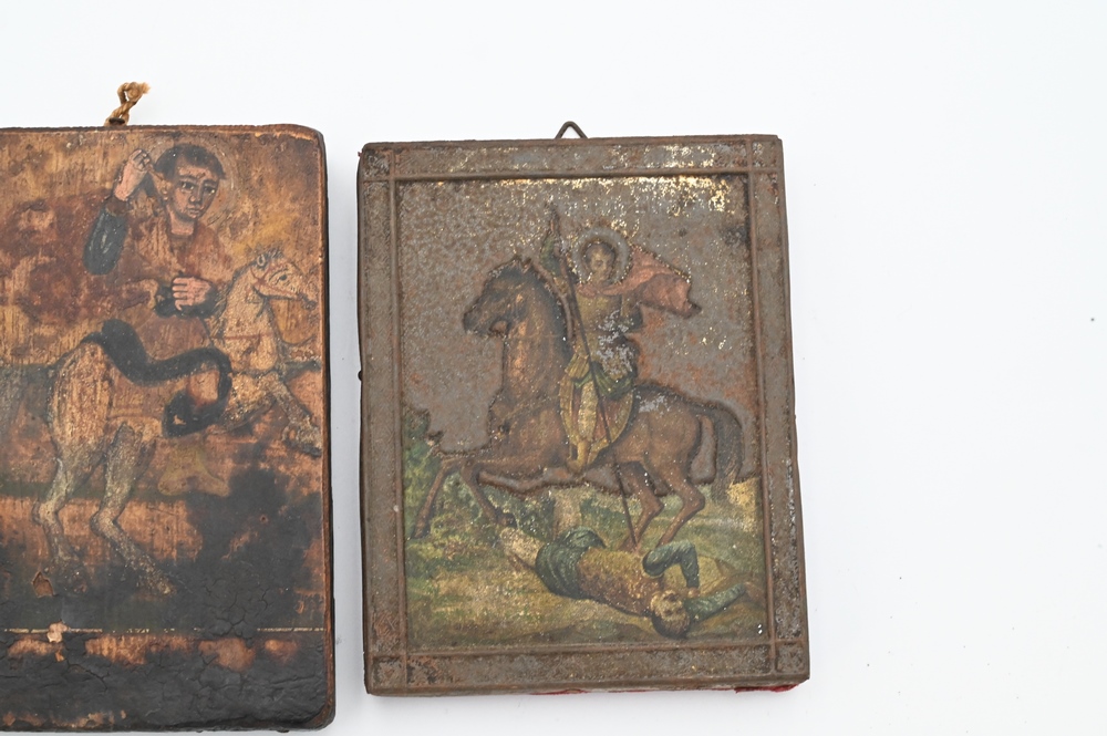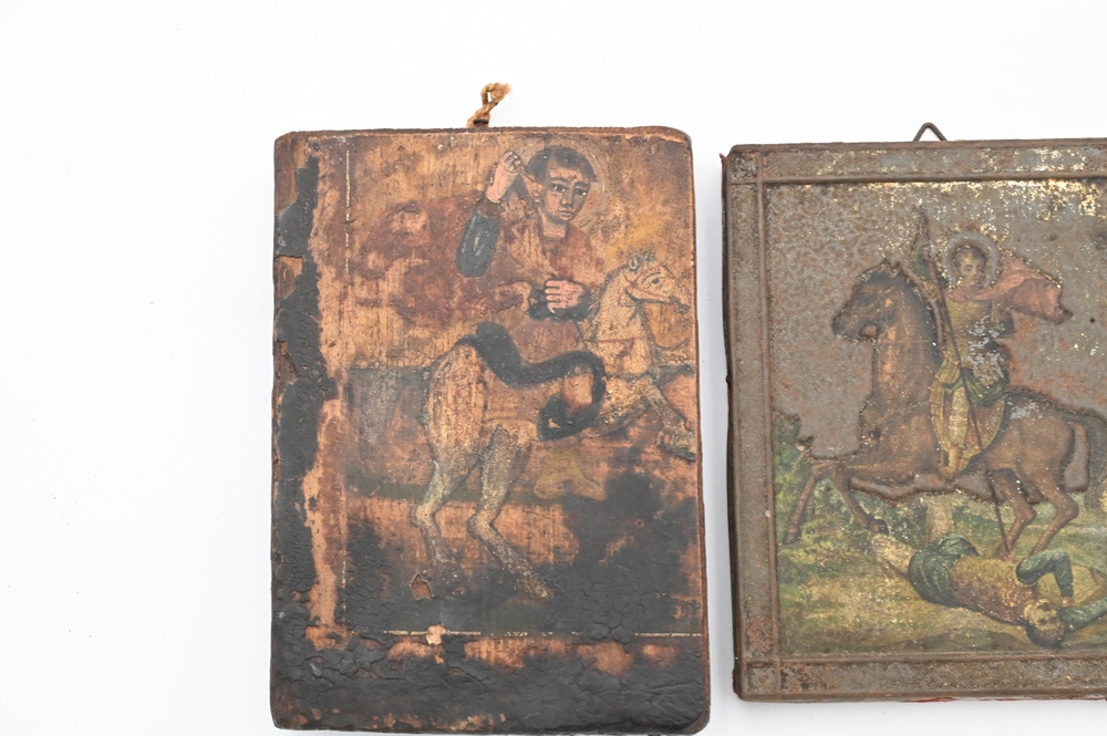 Two Small Icons, one on tin, one on wood, 4 3/4″ x 3 3/4″ and 4 1/2″ x 3 1/2″.