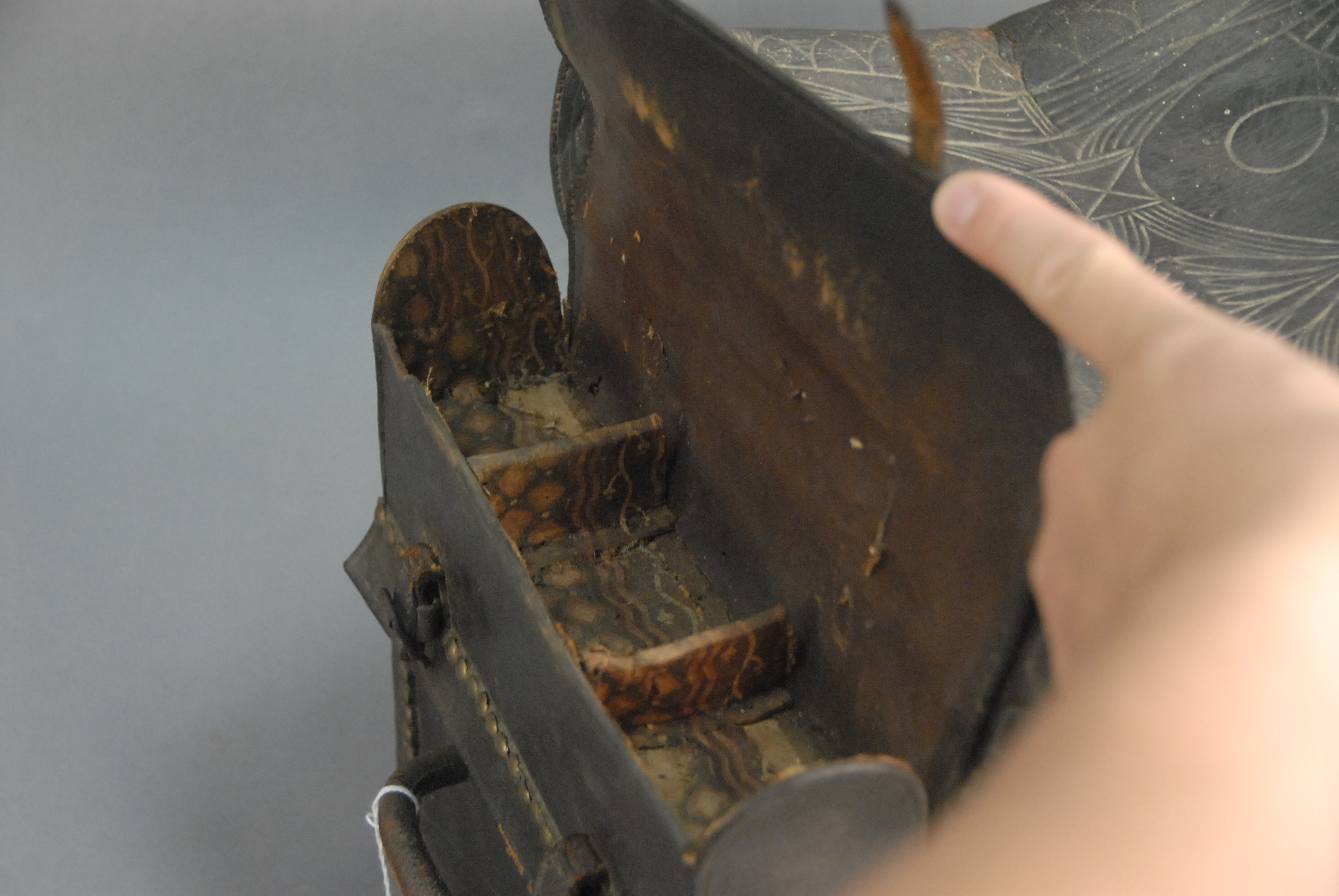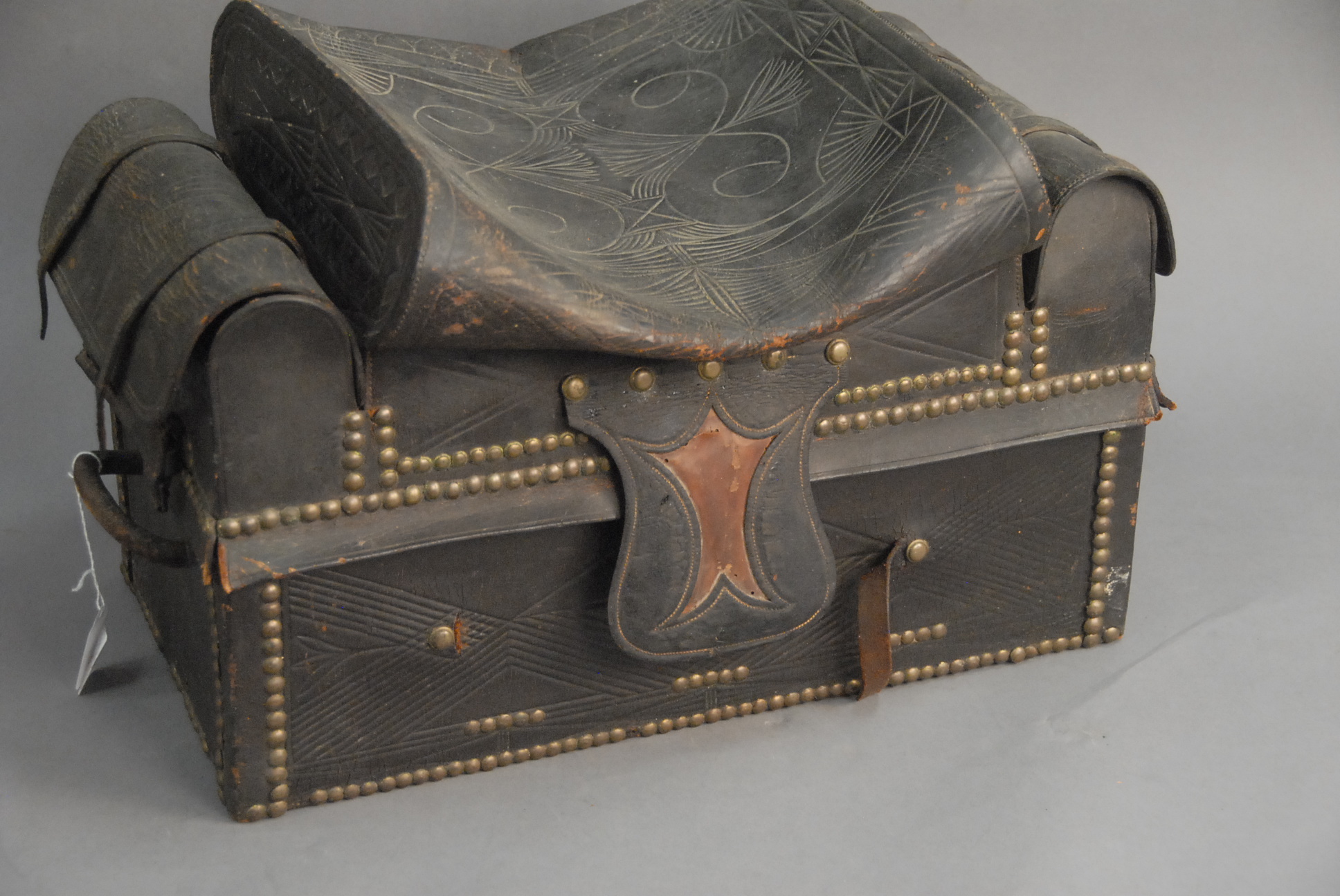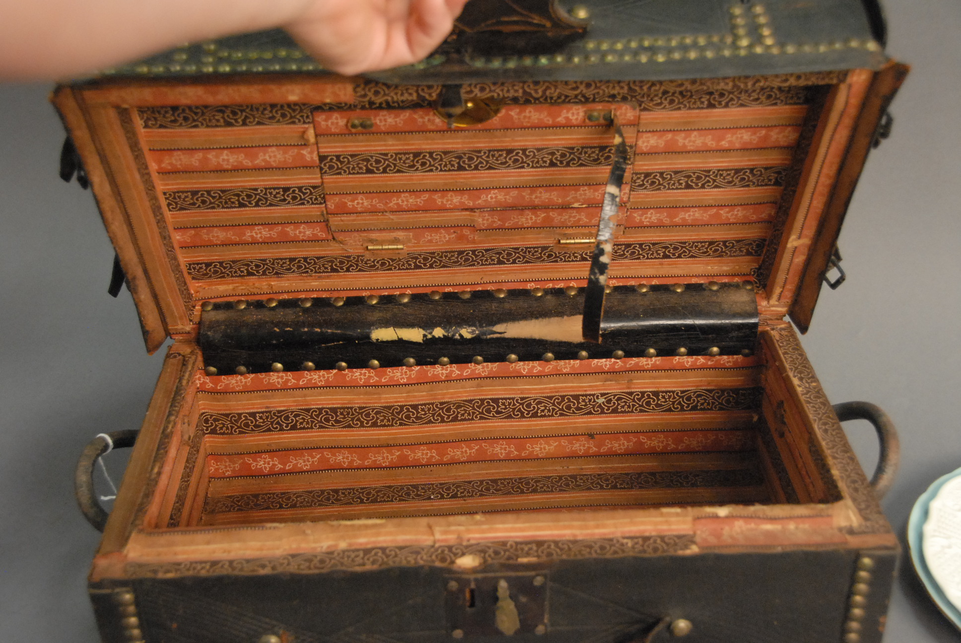 Victorian leather lift top case with tacks.ht. 12 in. wd. 19 in.