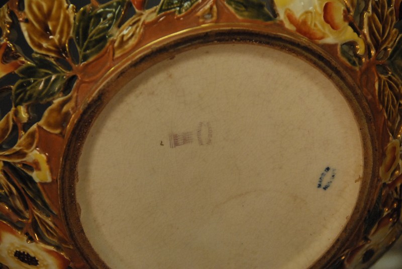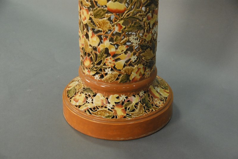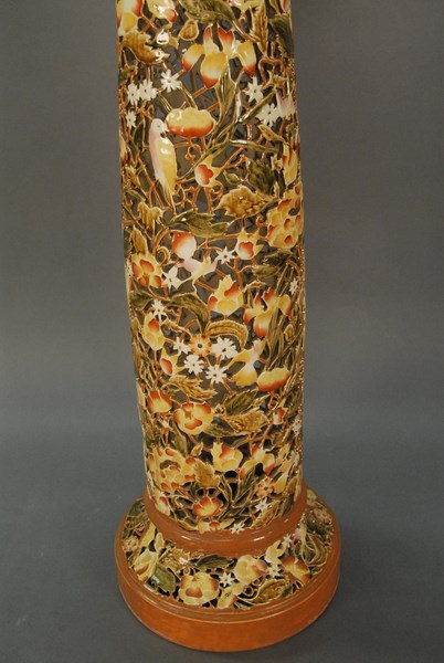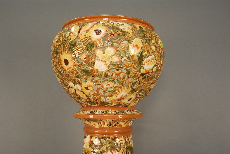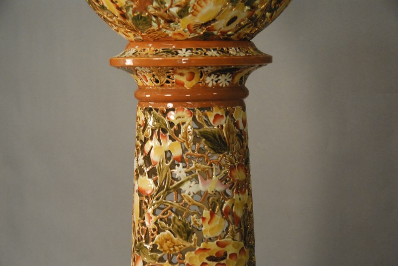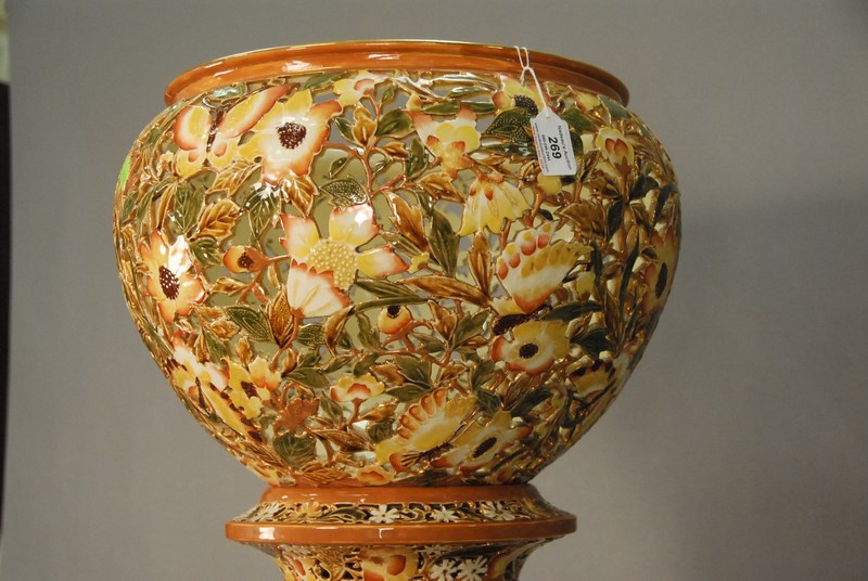 Lot 269: Zsolney pottery jardinire on pedestal in orange, yellow, green, brown, and white, completely reticulated with birds, leaves, and flowers, marked Made in Hungary with stamp of Zsolney. pedestal: ht. 33in. pot: ht. 11in. dia. 13in.