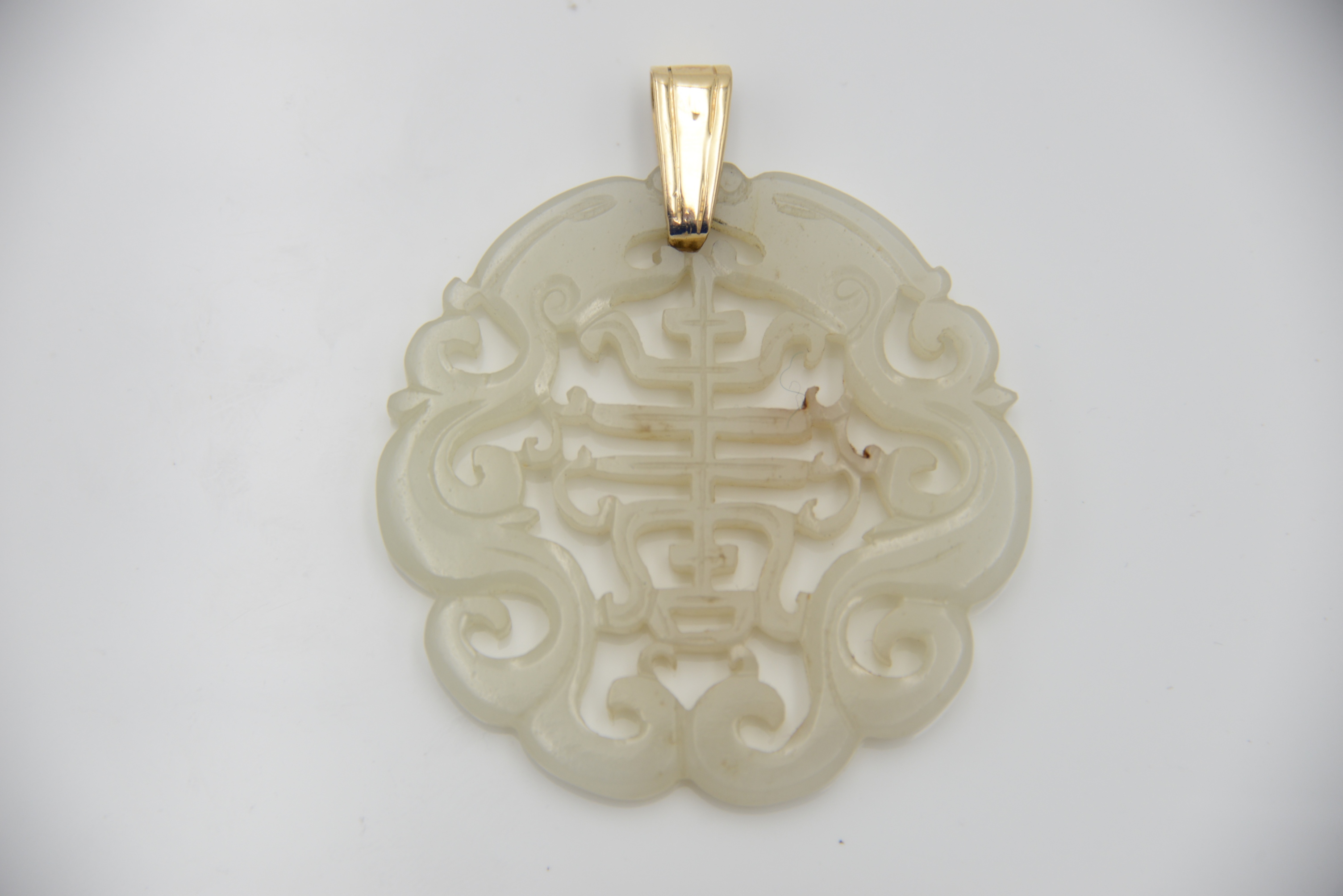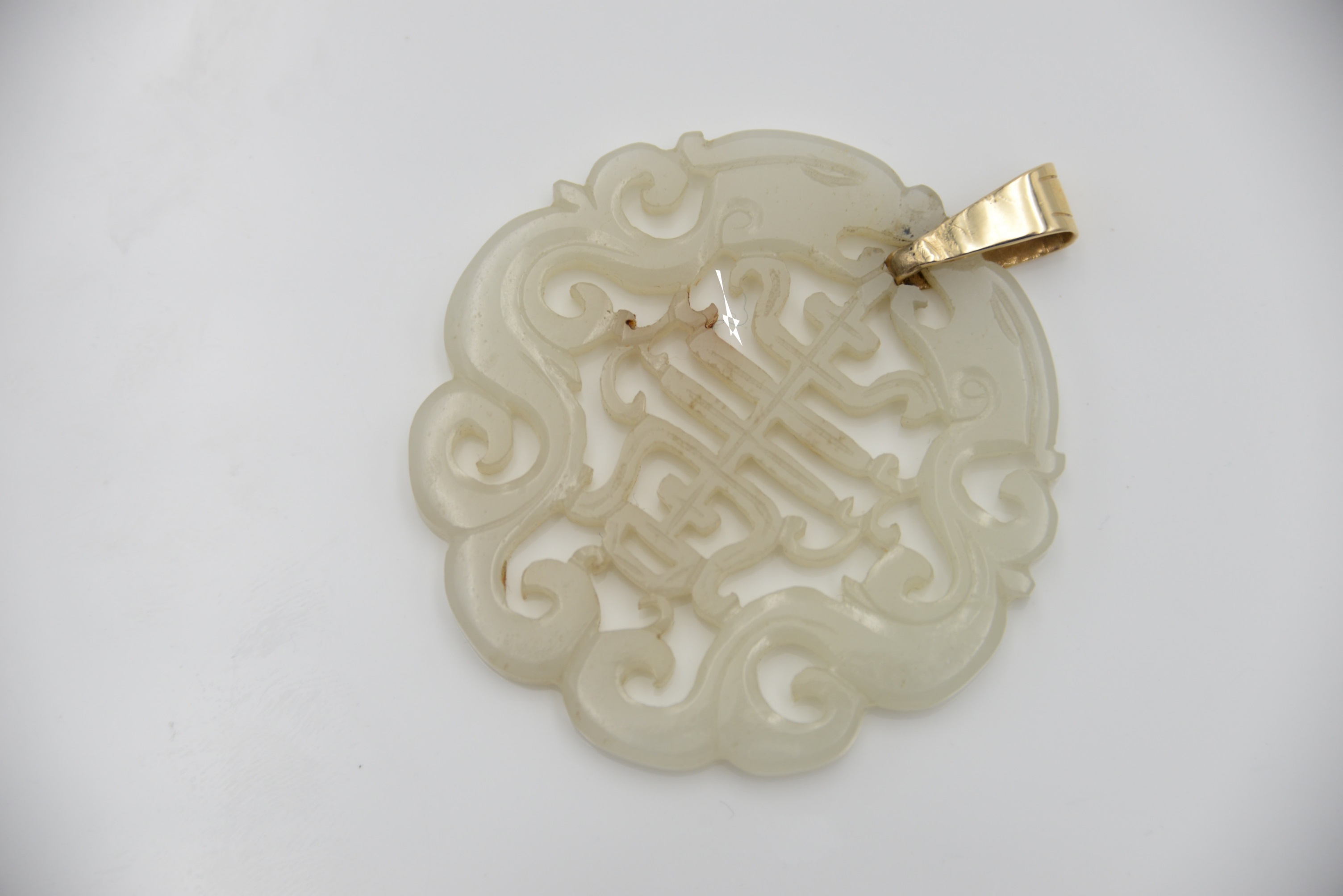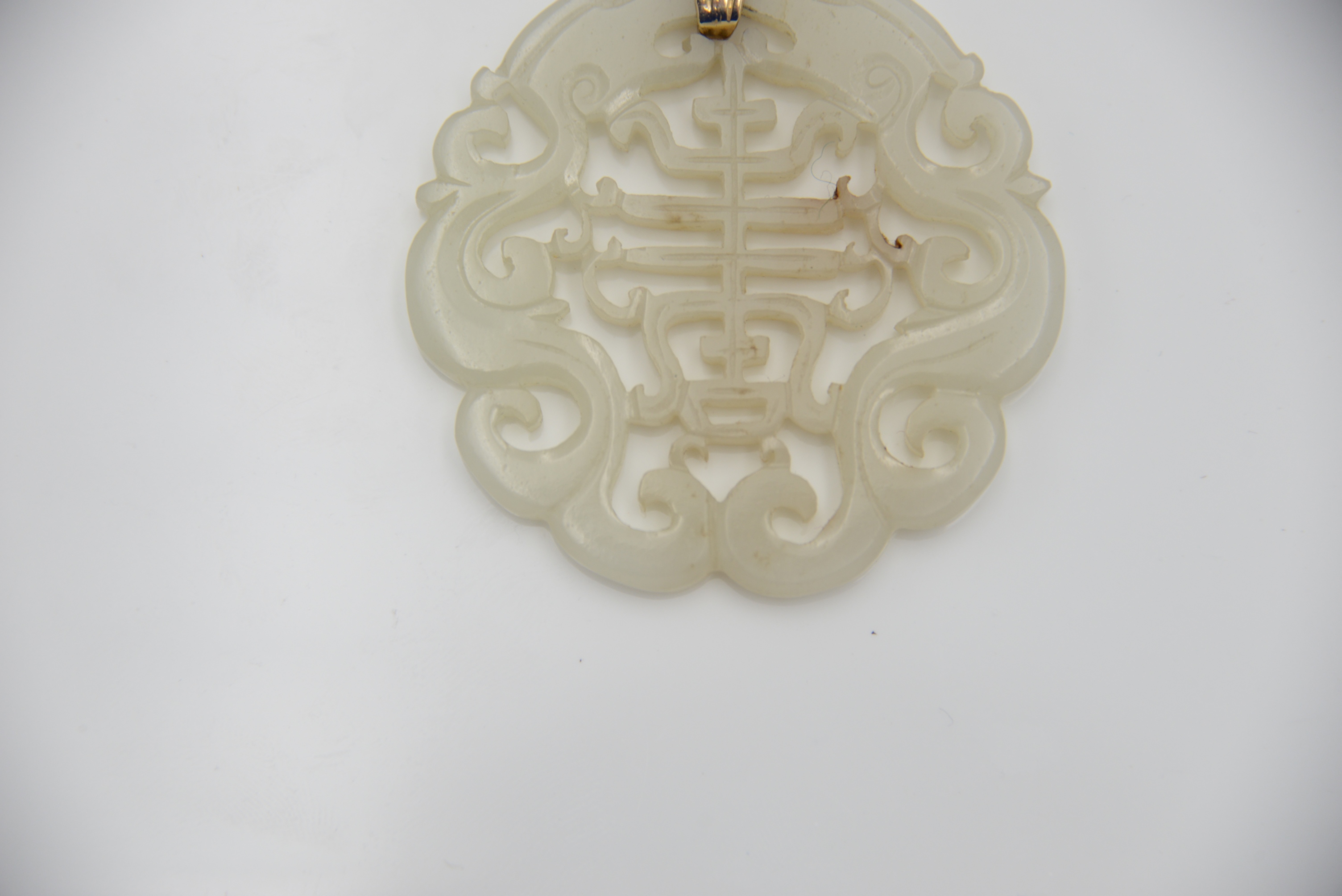 Carved White Jade Pendant pierced carved with gold mount diameter 60mm x 5mm.