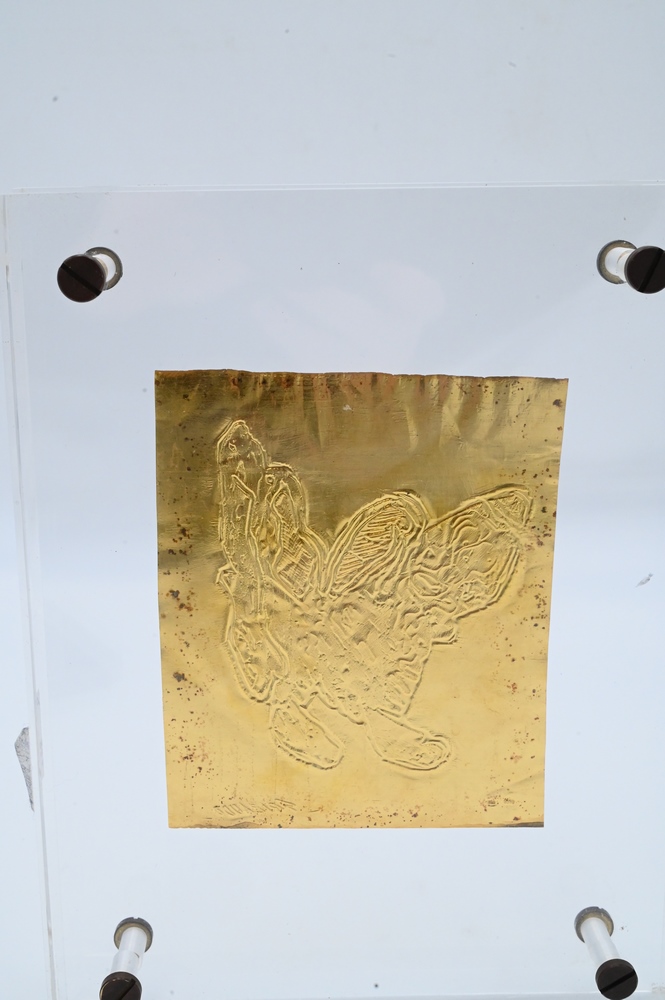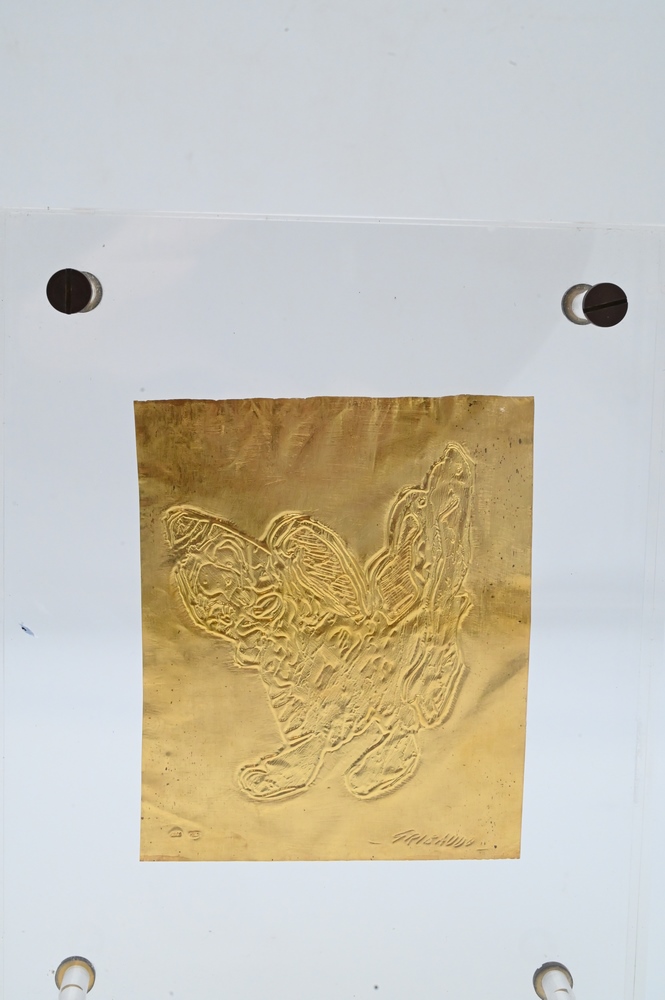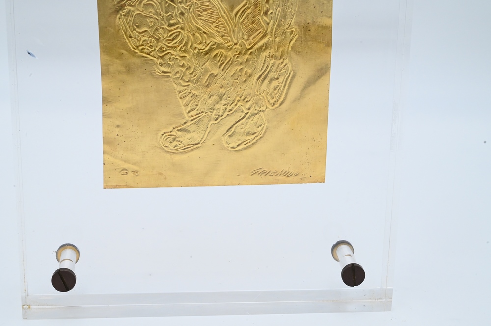 Lot 27: Ezio Gribaudo Embossed Gilt Silver Plaque, figure in lucite frame, signed lower right ‘Gribaudo’, hallmarks lower left 800, 9 1/2″ x 7 1/8″.