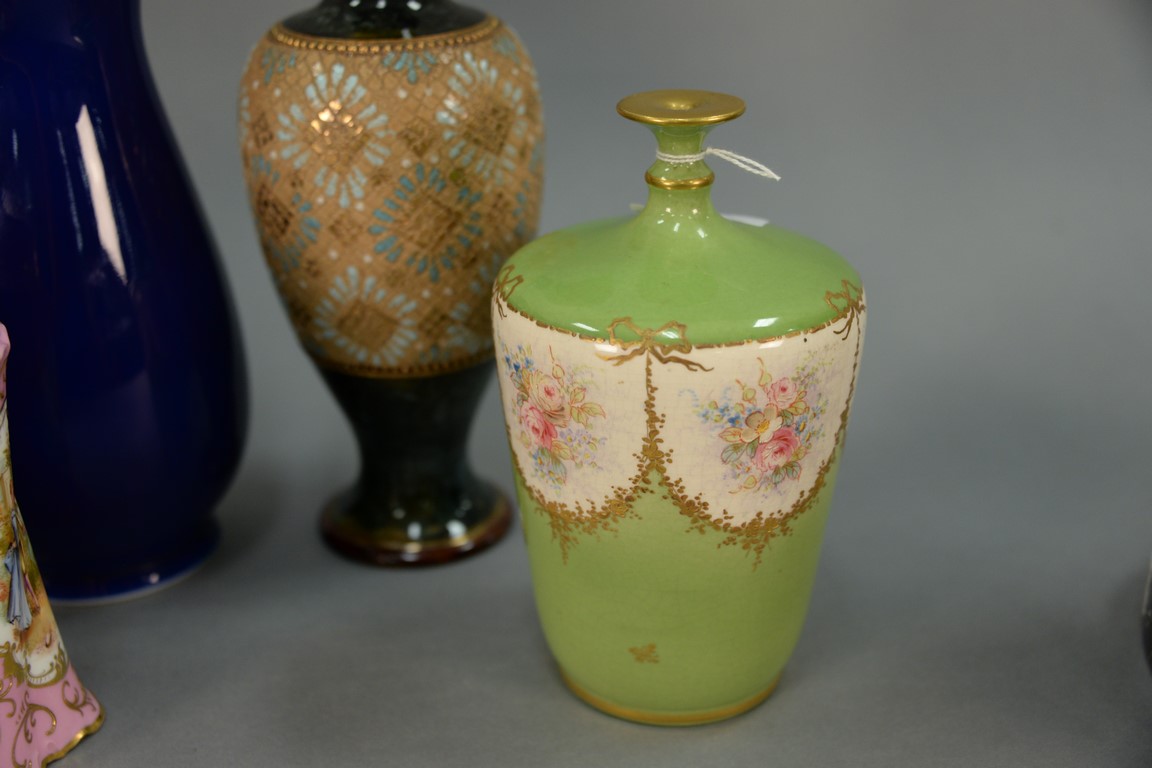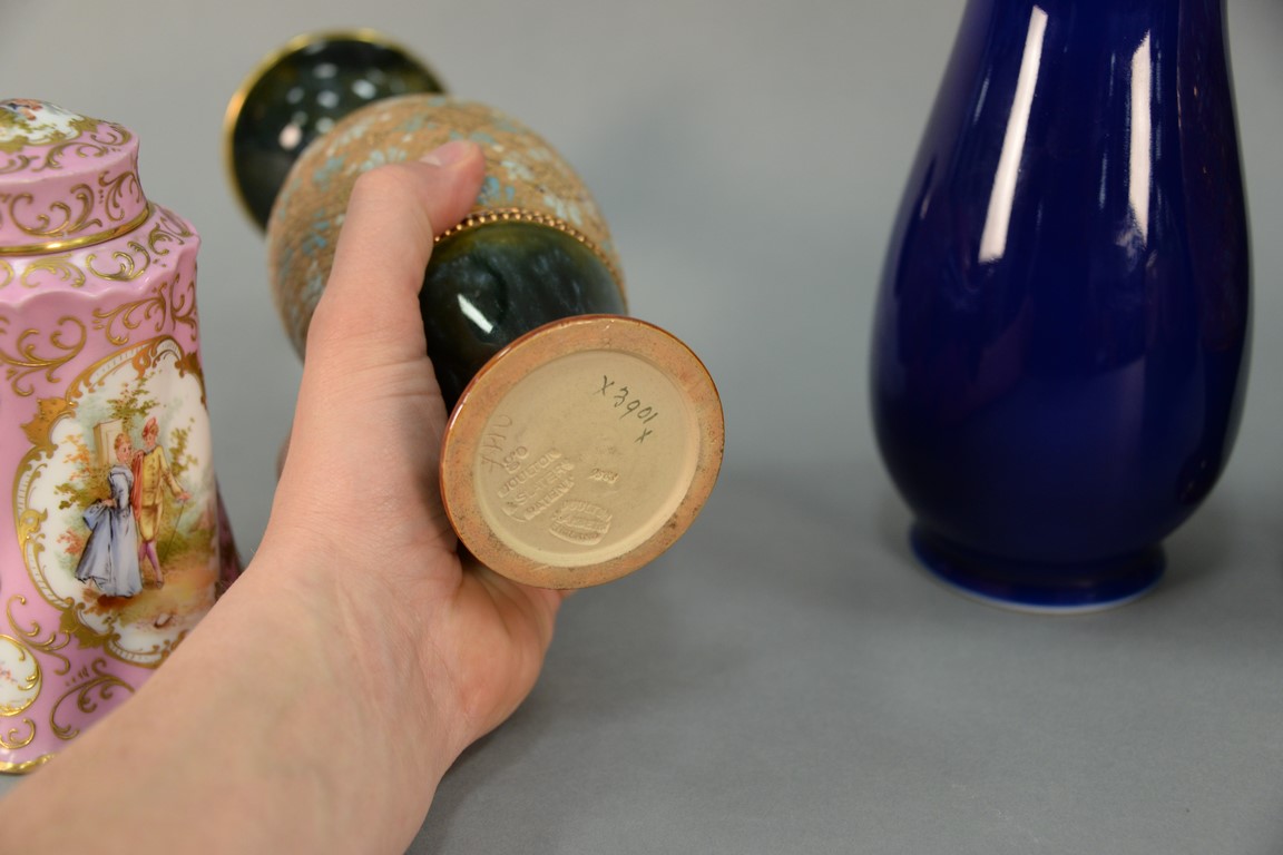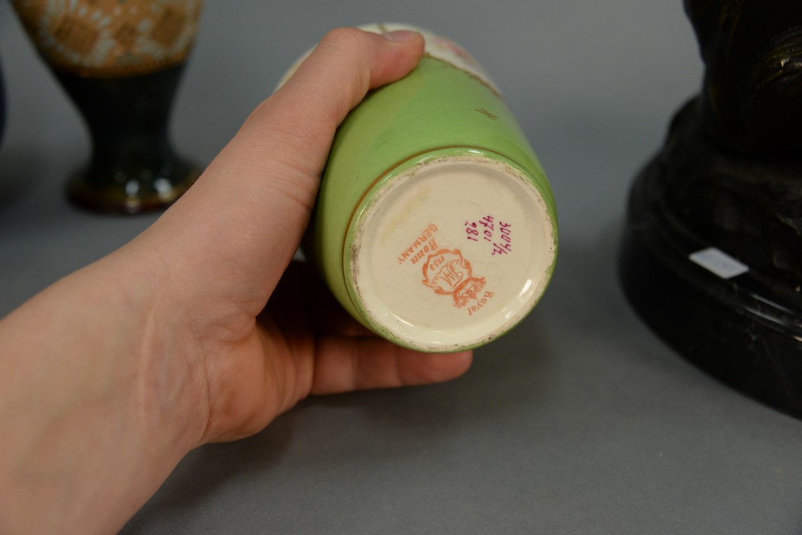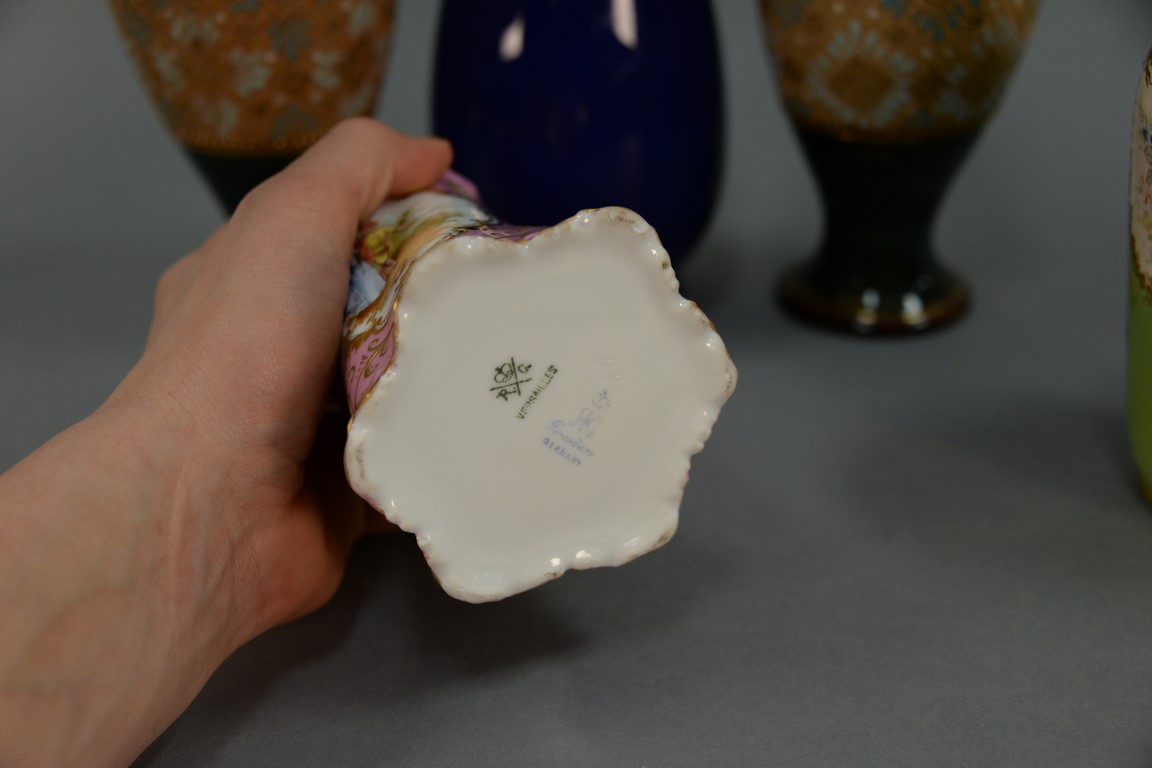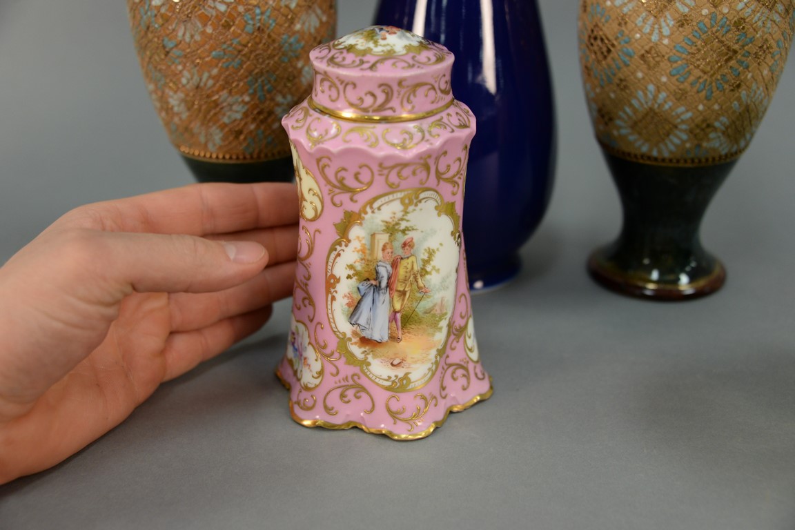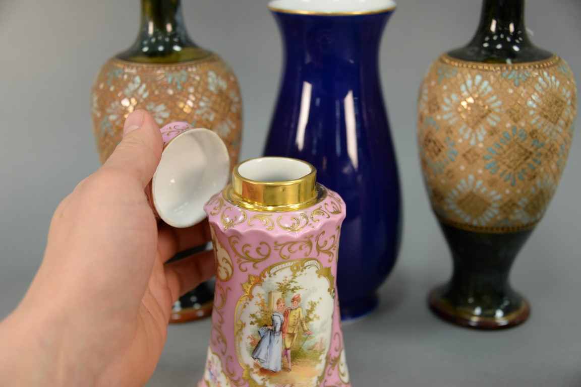 Lot 27: Five porcelain pieces to include Dresden porcelain covered jar ht. 6in., Royal Bonn gilt decorated vase, pair of Doulton Slaters g…