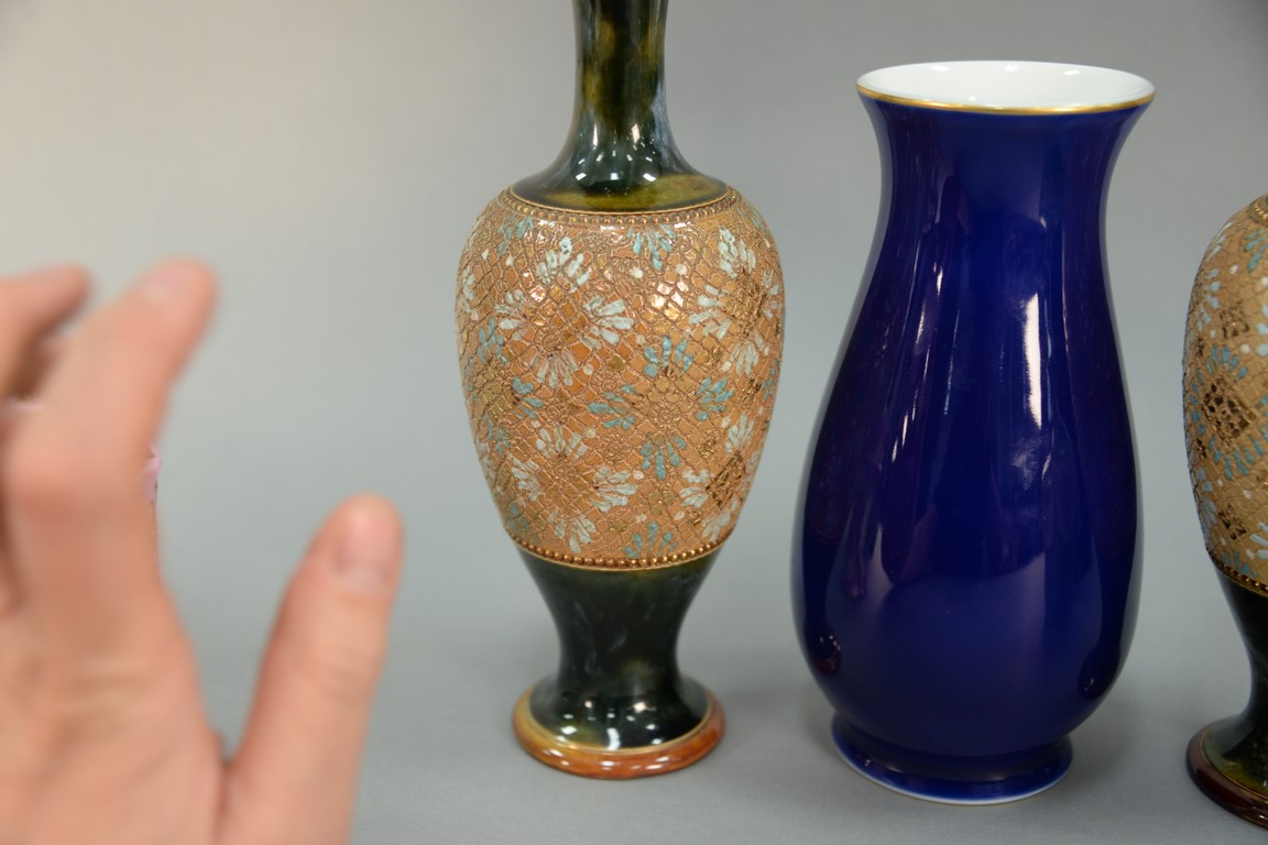Five porcelain pieces to include Dresden porcelain covered jar ht. 6in., Royal Bonn gilt decorated vase, pair of Doulton Slaters glazed flower vases marked Doulton Slaters patent ht. 10 1/2in. and blue and white Japanese vase.