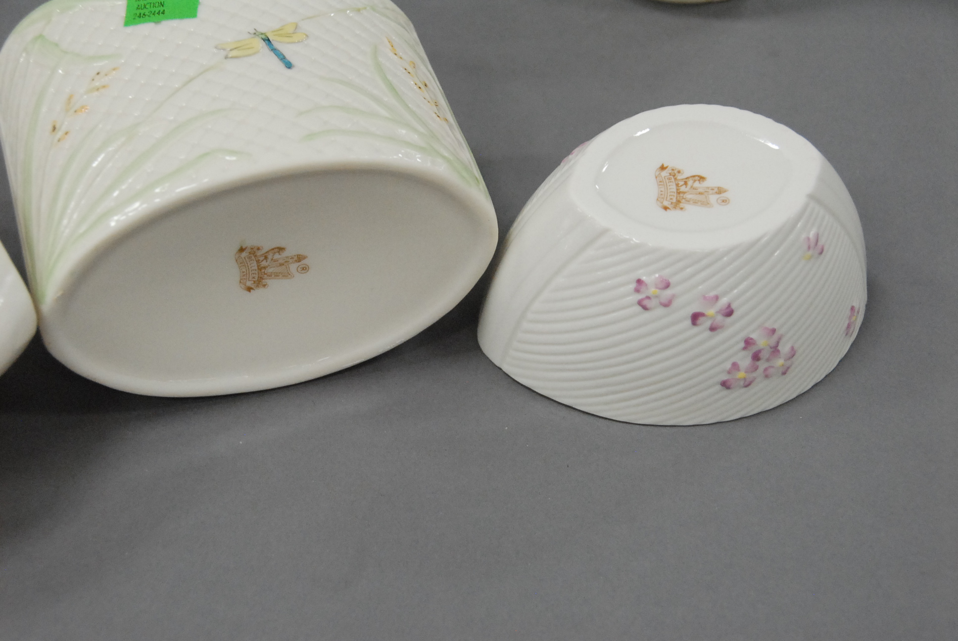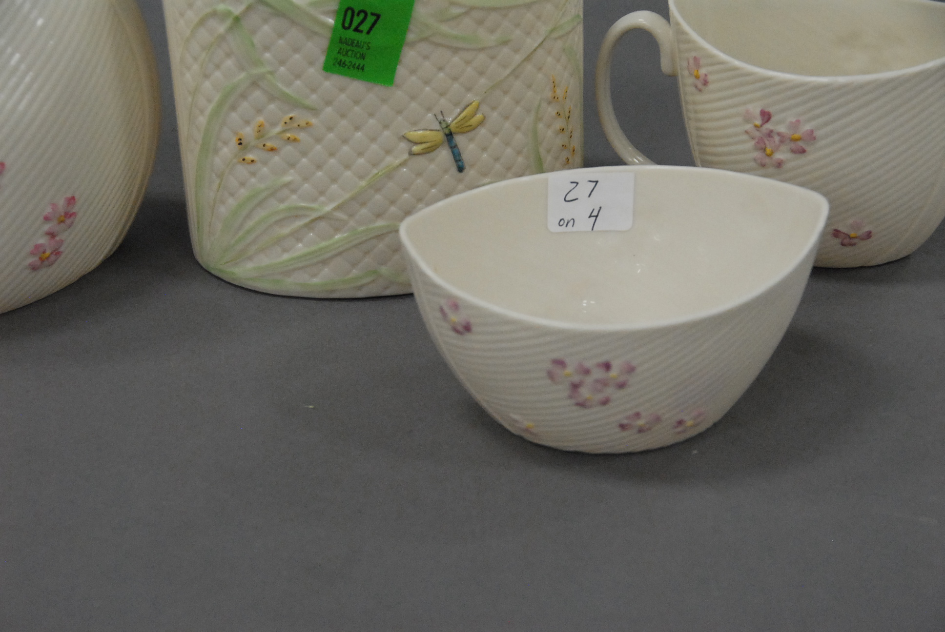 Four piece lot of Irish Belleek with a brown mark, creamer, sugar, and two vases, three are matching pieces.