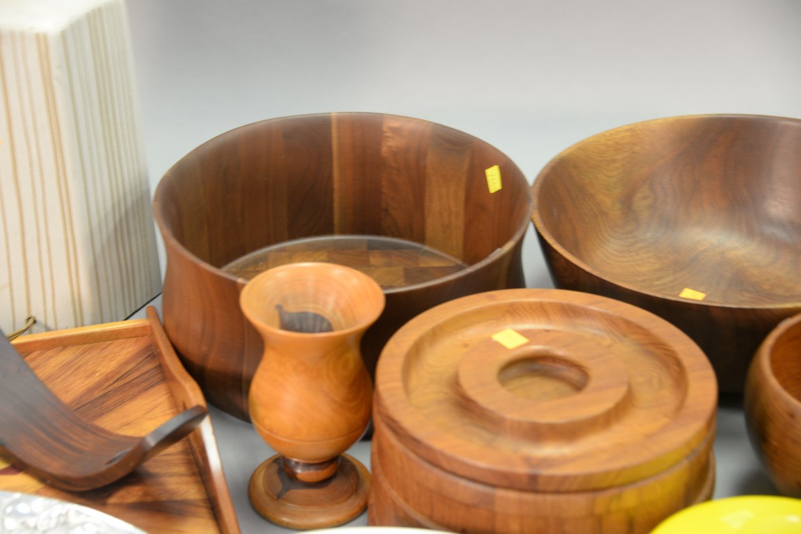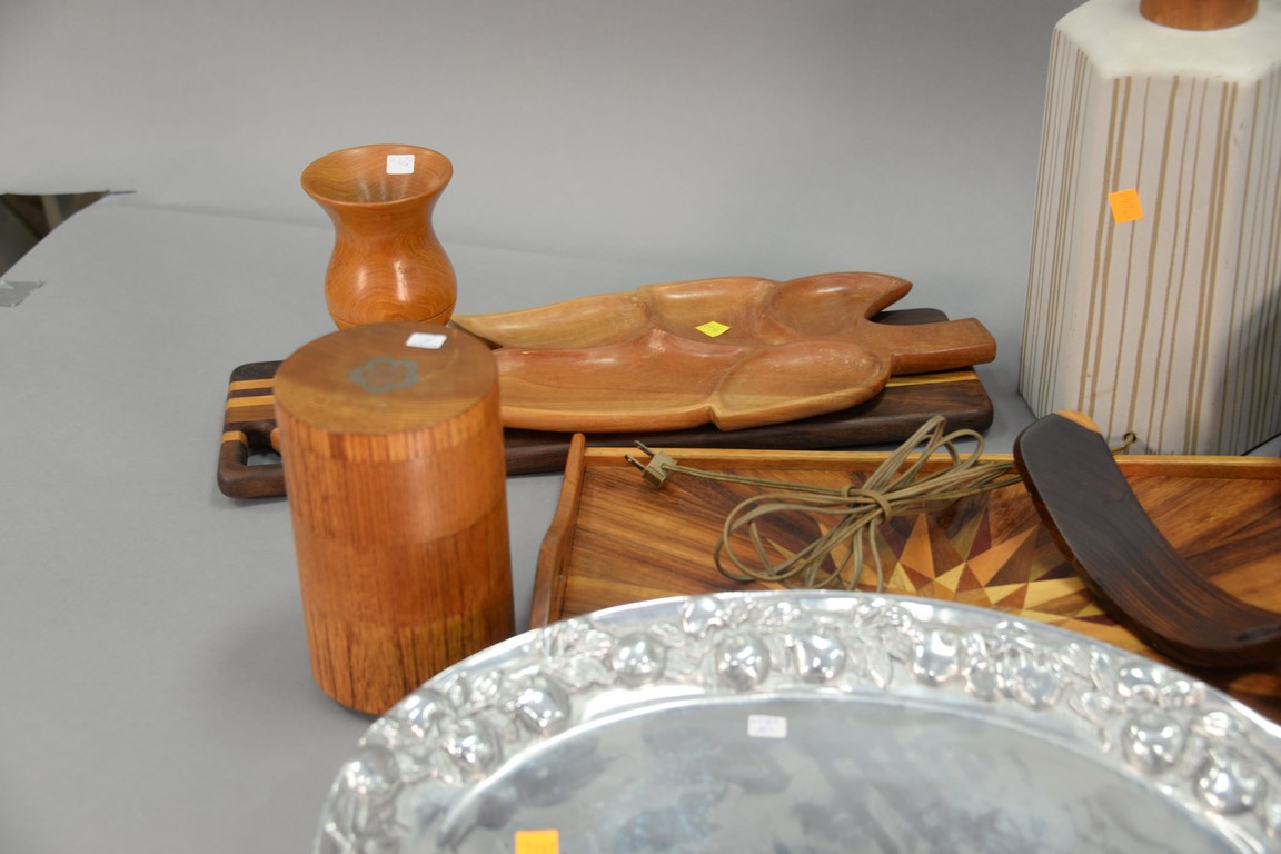 Large group of Danish Modern serving pieces to include Nacco pot, Copco pot, Dansk Delavan brass and teak coat rack, etc., small cup ht. 6 1/2 in., lamp ht. 19 in.