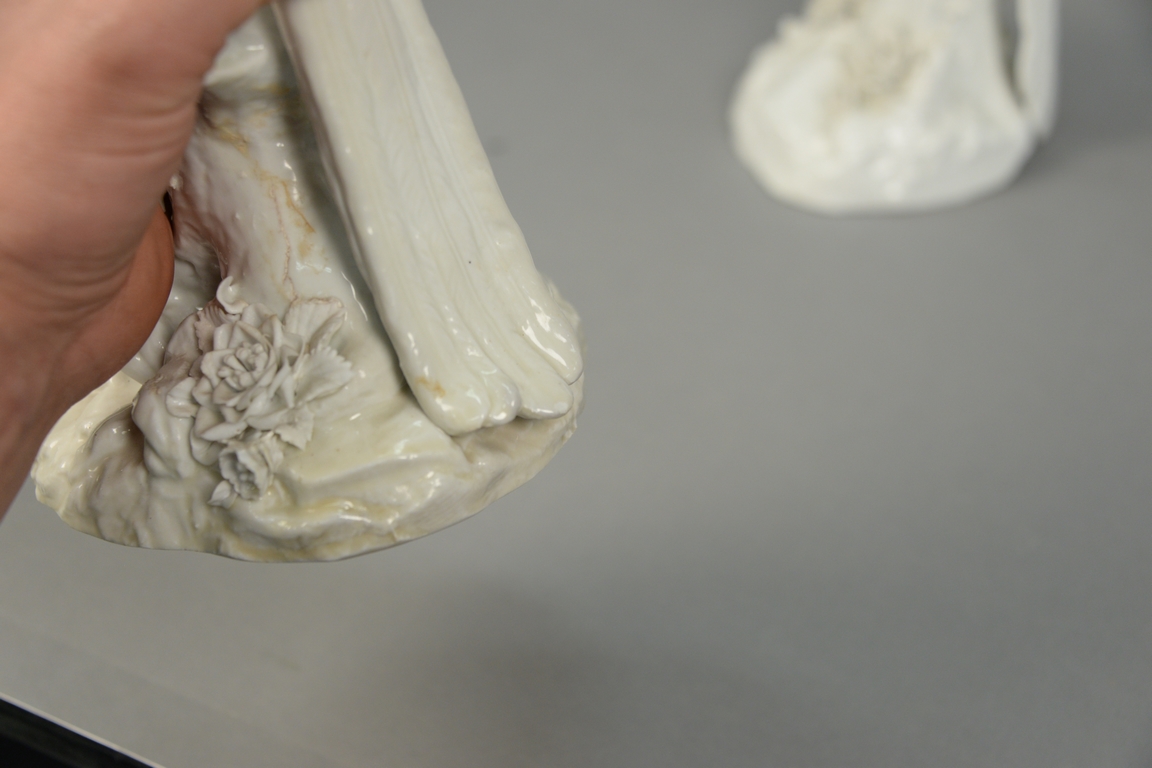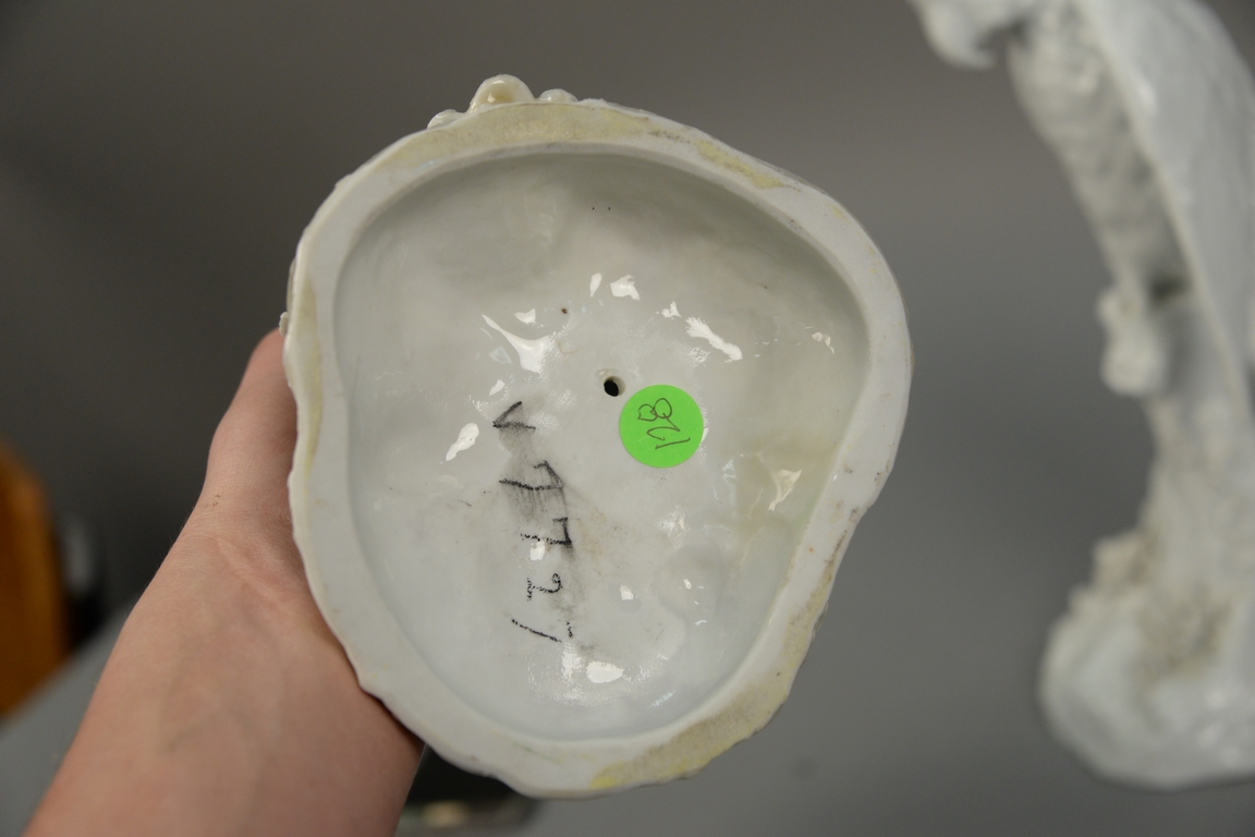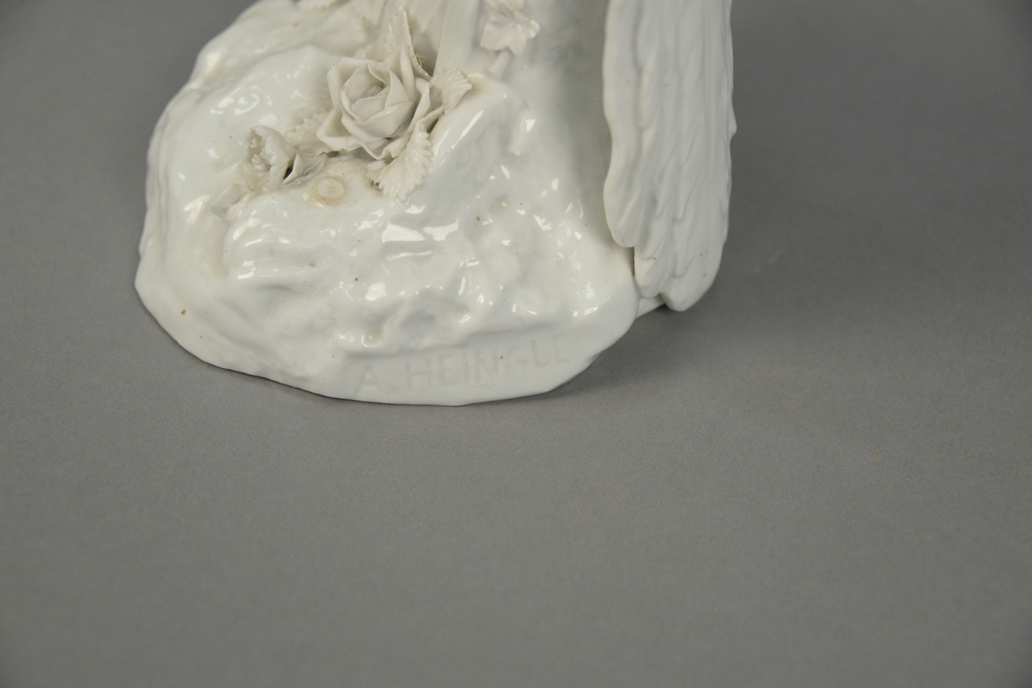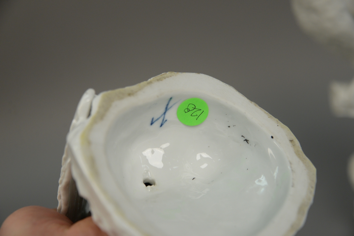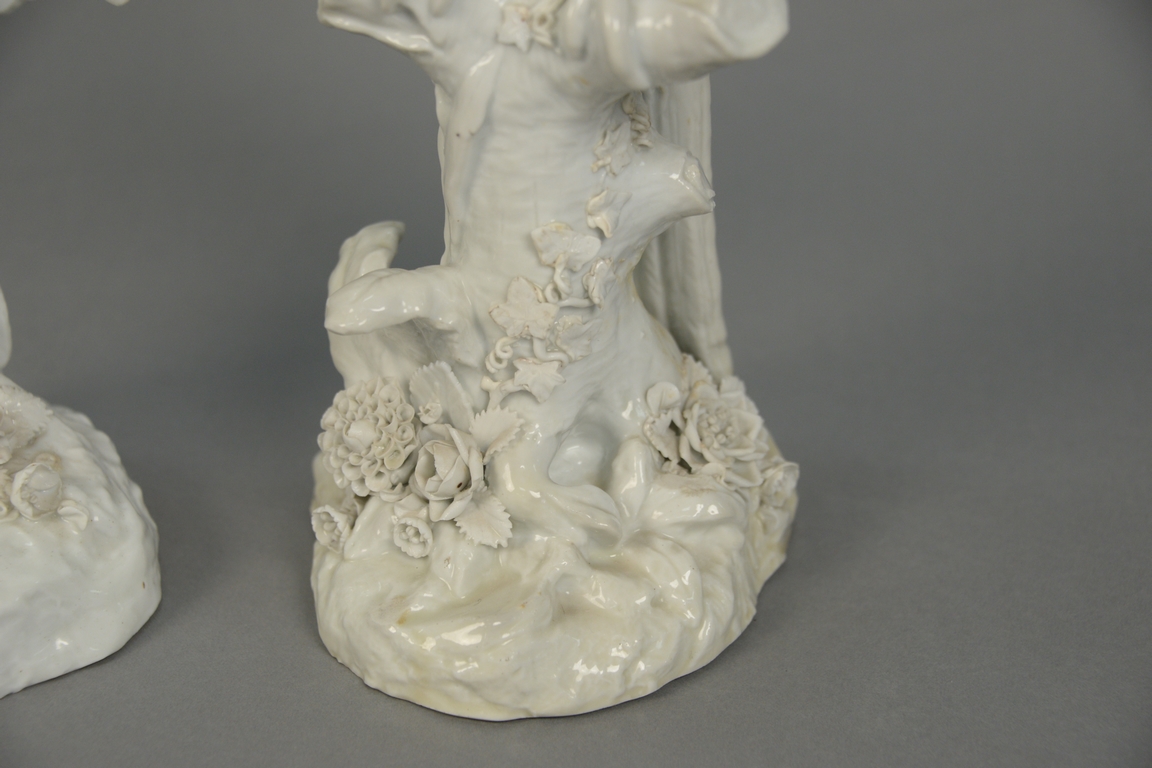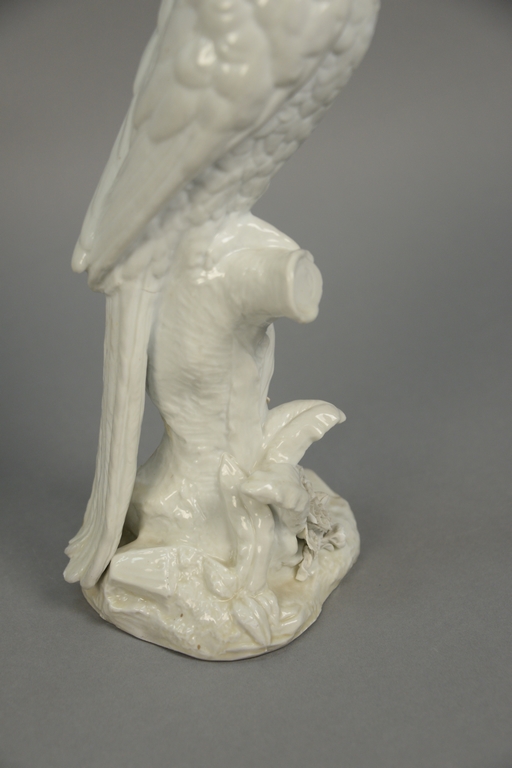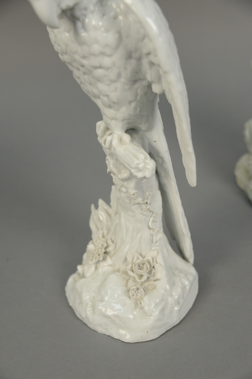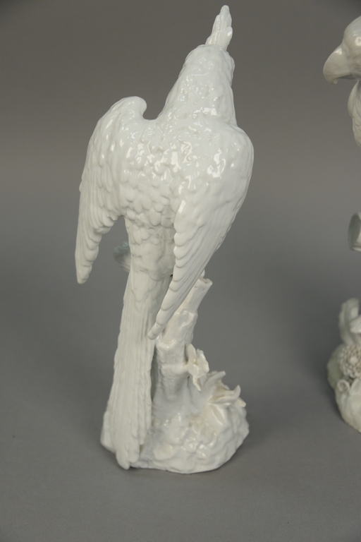 Lot 27: Pair of German porcelain parrots on tree stumps Blanc de Chine with blue crossed swords mark on bottom, impressed A. Heingle mark on…