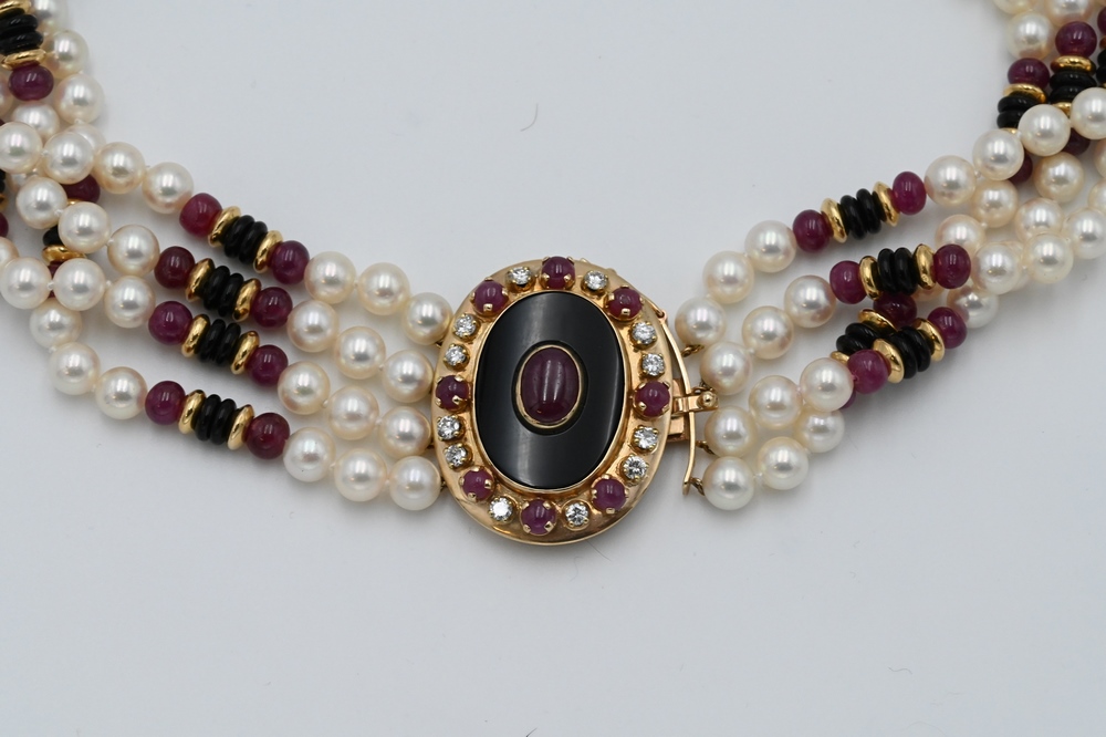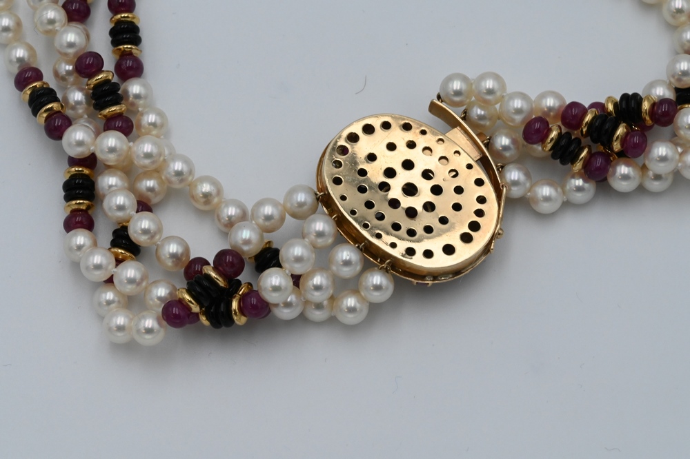 Pearl and Ruby Four Strand Necklace, having gold and onyx flat beads, large 14 karat gold clasp mounted with rubies and 12 diamonds around center ruby surrounded by onyx, length 15 inches.
