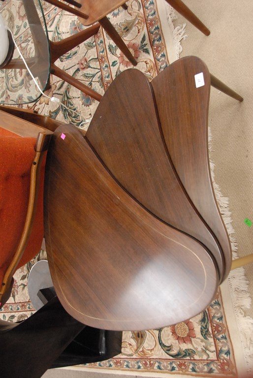 Rosewood inlaid three tier fan nesting tables with molded tops, ht. 19in. lg. 32in.