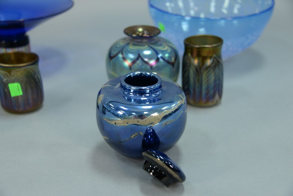 Seven art glass pieces to include art glass compote with multi-color candy cane base, large blue frosted and clear bowl, set of three Elaine Hyde art glass goblets with pulled feather design, Hartman art glass iridescent vase with pulled feather design, and a John Reep art glass jar with cover. ht. 3 1/2in. to 5in.