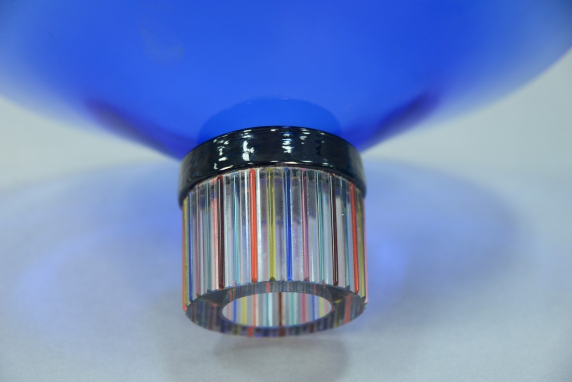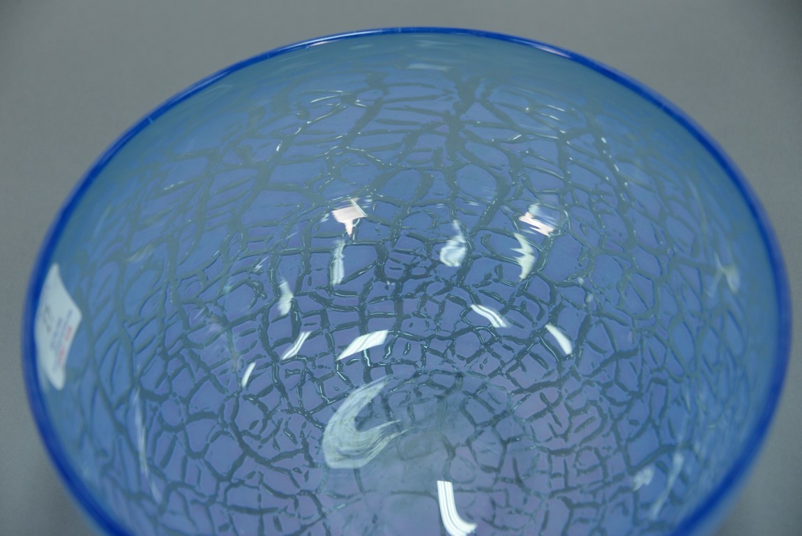 Lot 27: Seven art glass pieces to include art glass compote with multi-color candy cane base, large blue frosted and clear bowl, set of thr…