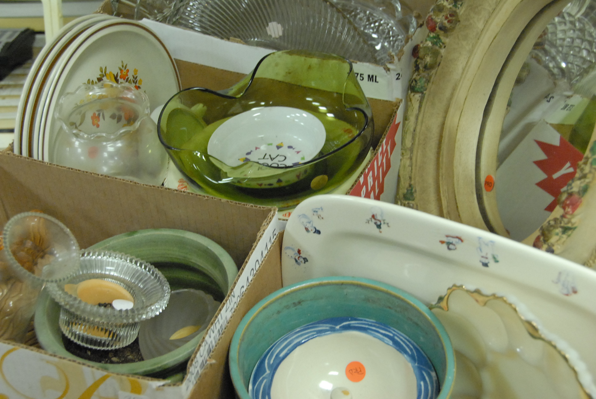 Seven box lots of china, wash basin, a Victorian mirror, etc.