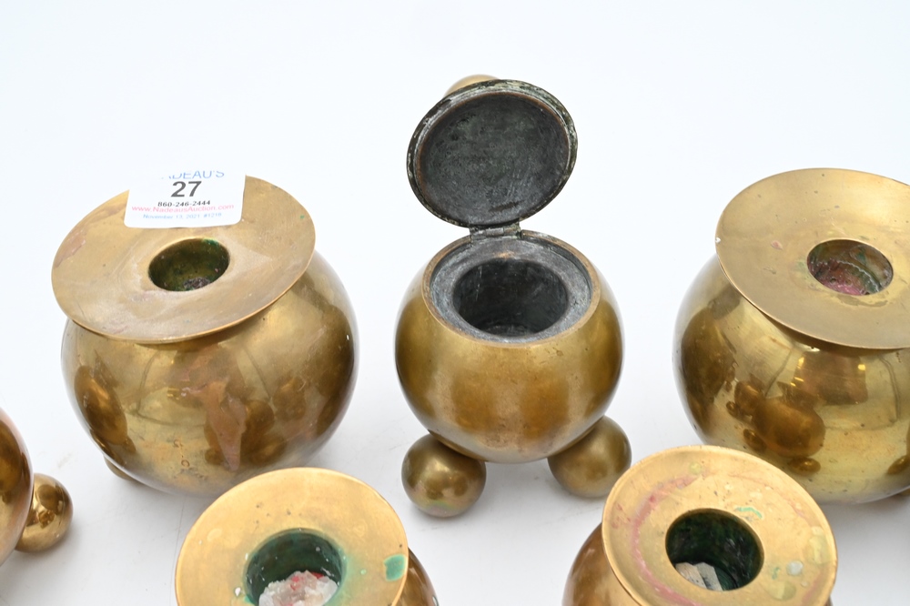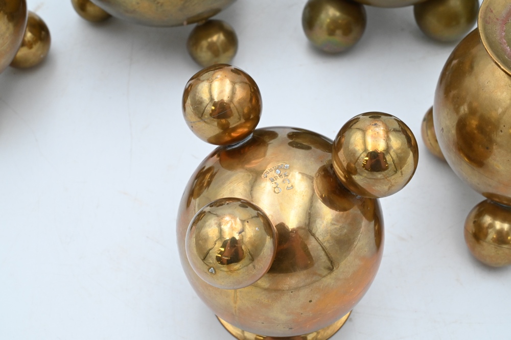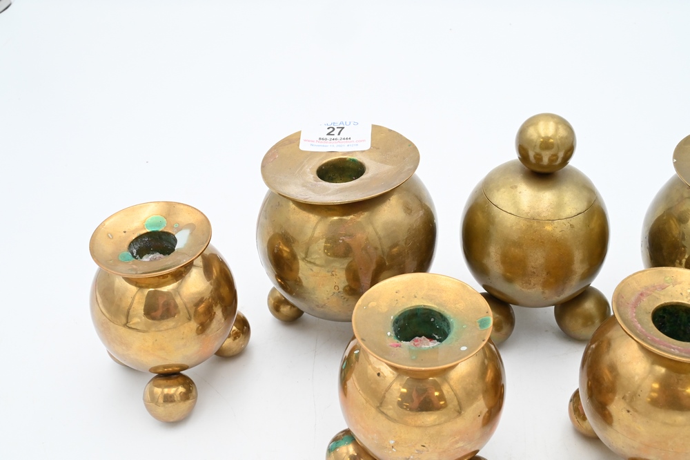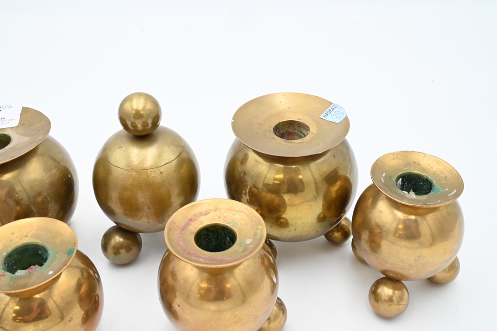Lot 27: Seven Brass Pieces, to include four Gusums Bruk candlesticks; one Gusum Bruk inkwell; along with two candlesticks after Gusums Bruk, tallest 4 1/8 inches.
