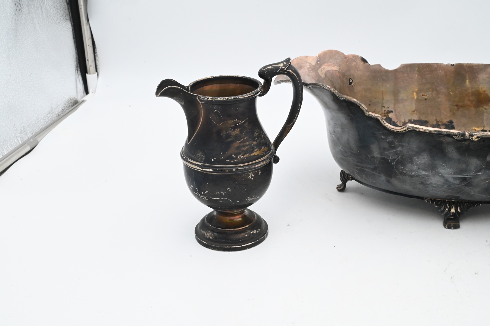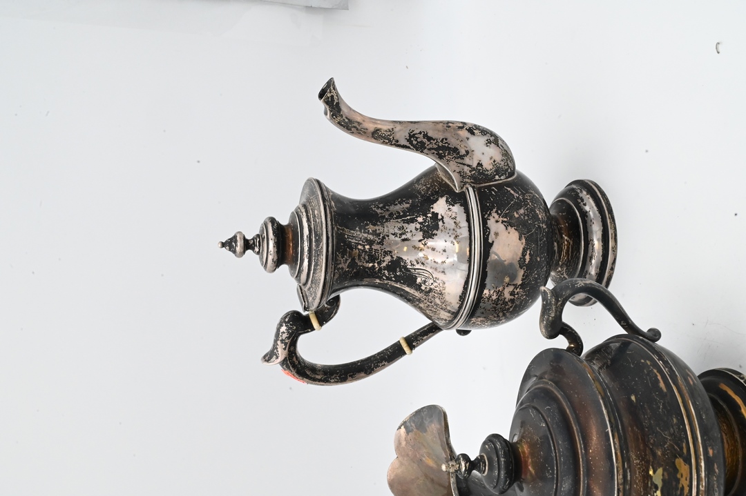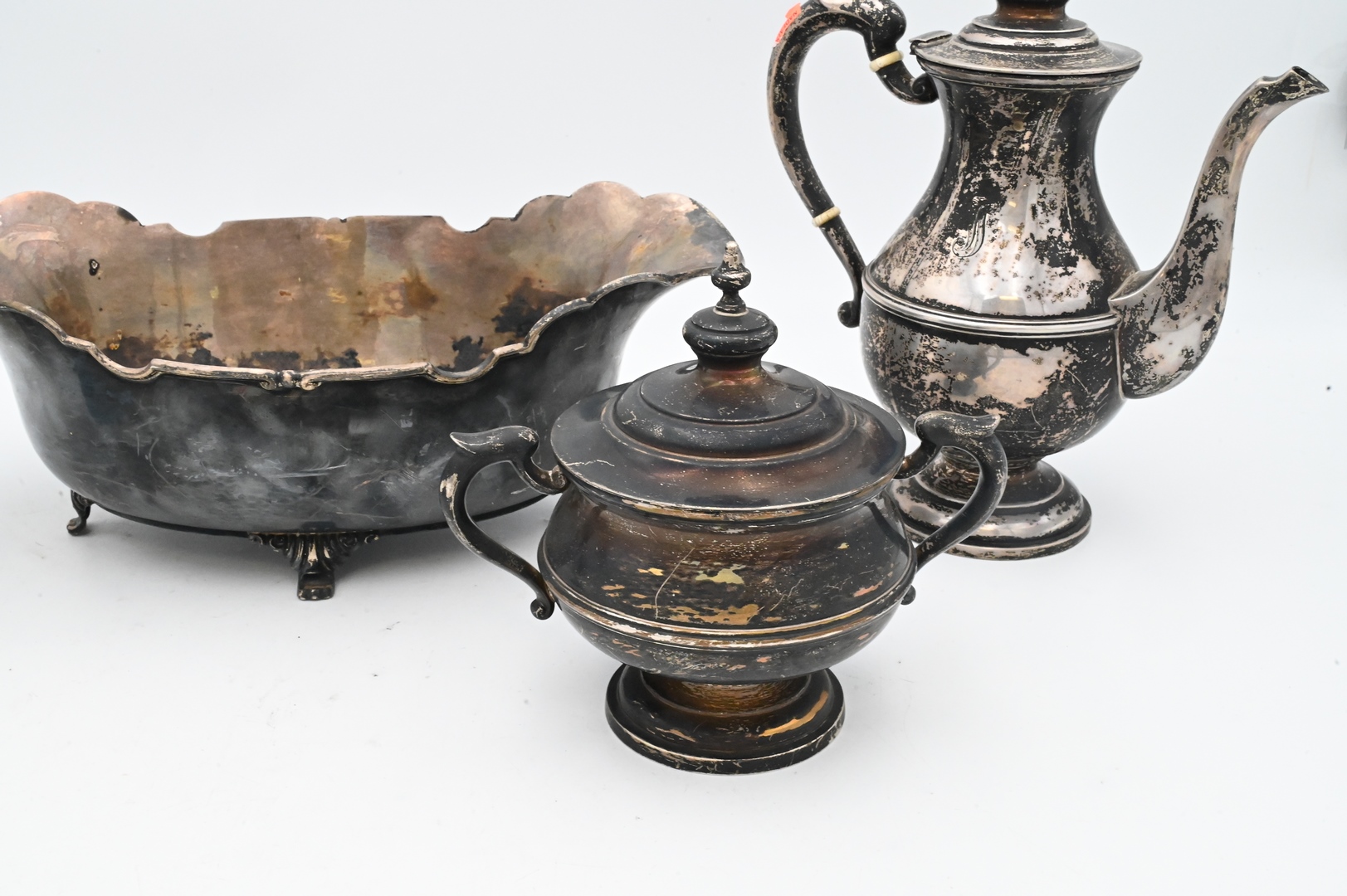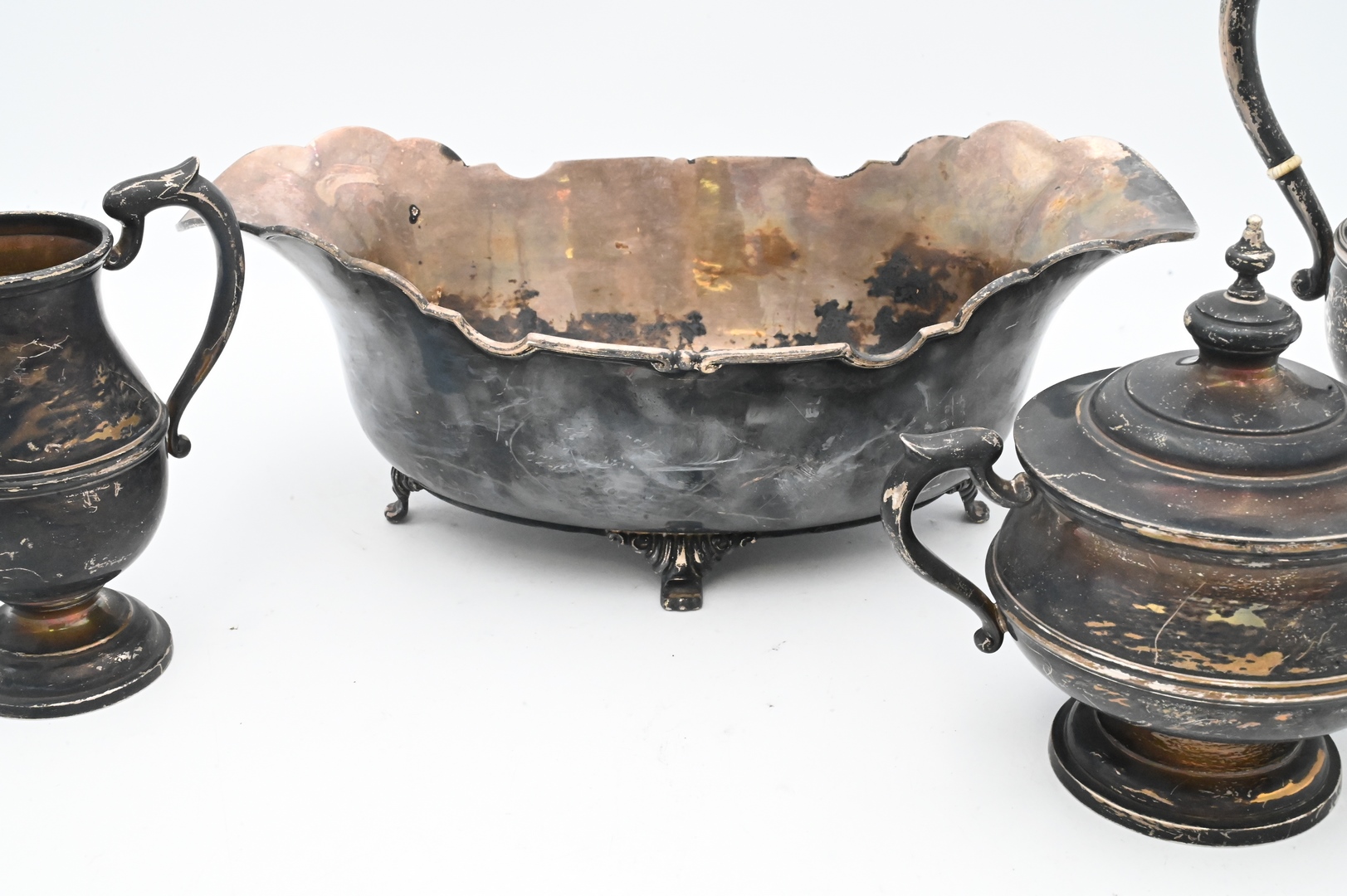 Sterling Silver Group, to include a three piece tea set, along with a large footed center bowl, bowl length 13 inches, height 5 inches, 72.4 t.oz, Provenance: Estate of Cyril H. Moore Jr, Kent, Connecticut.