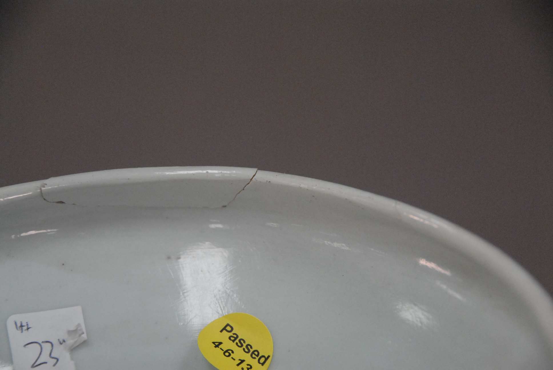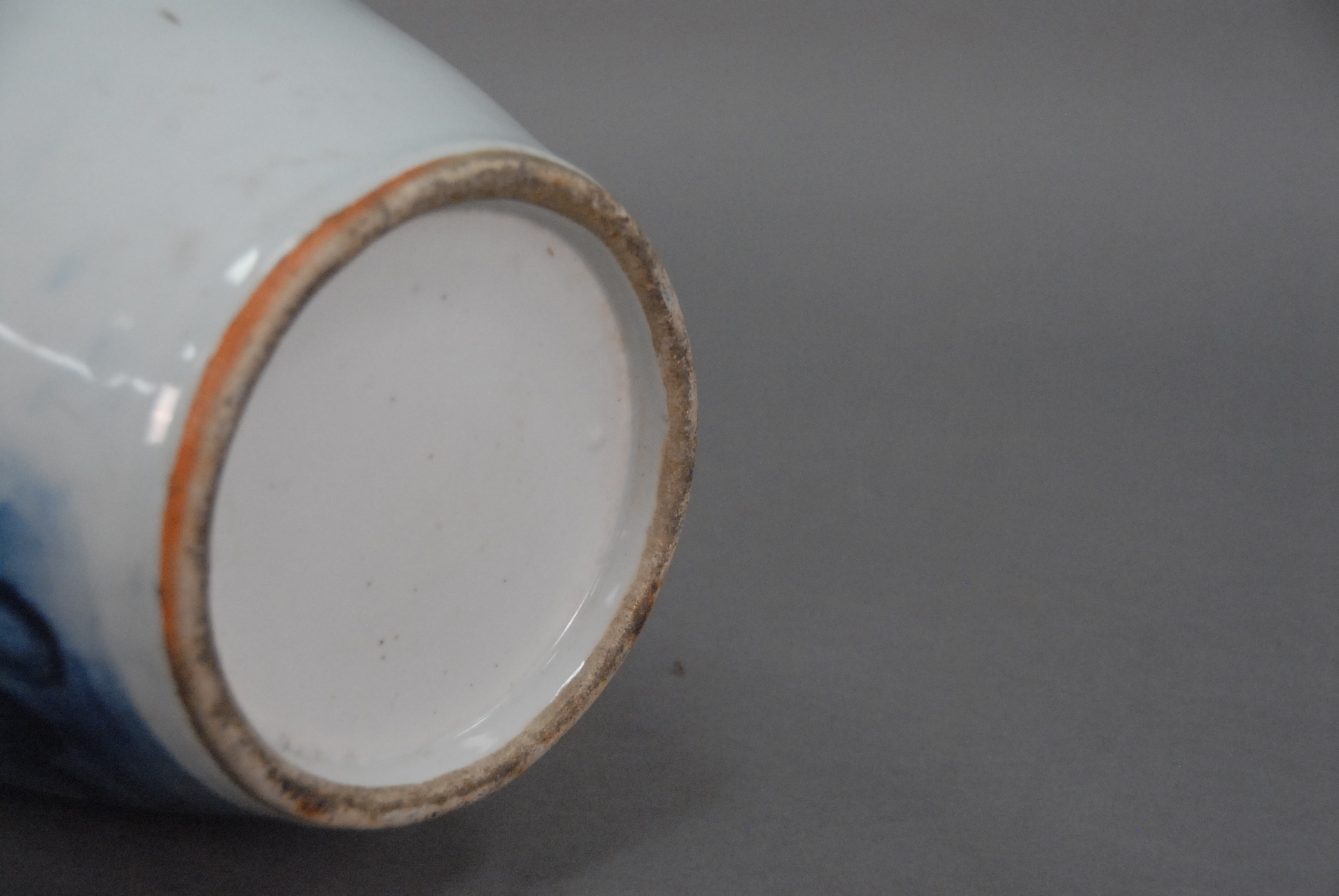 Tall blue and white vase in baluster form with painted peacock and molded handles. ht. 23in.