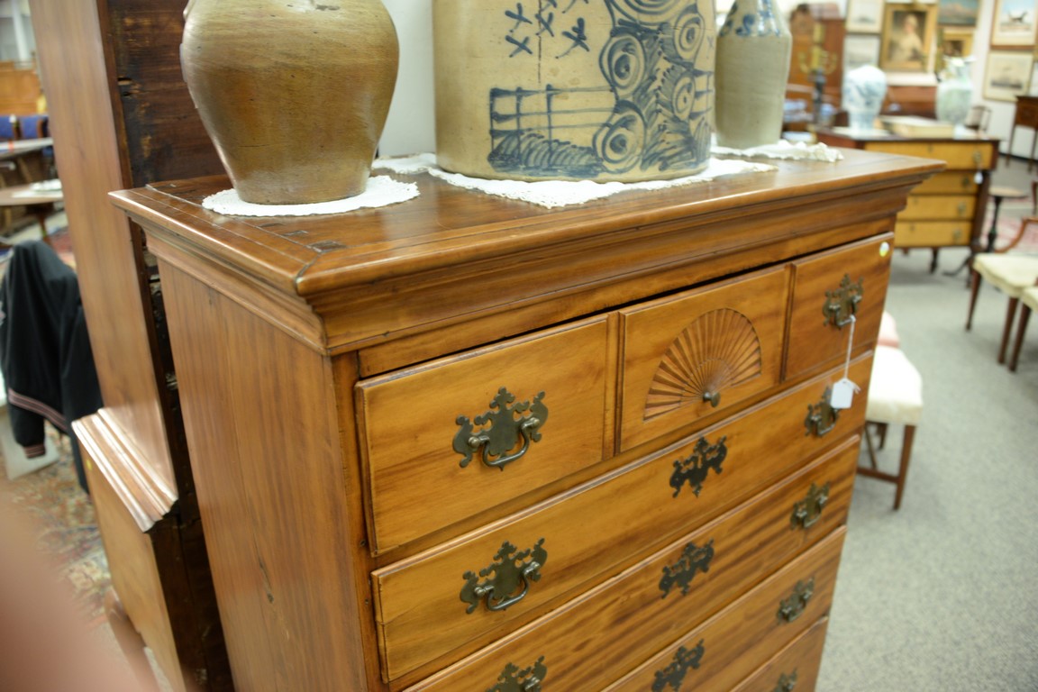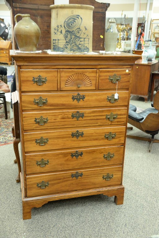 Tall chest having large cornice molding and fan carved long drawer with false triple front over five drawers, all set on bracket base. height 55 3/4 inches, width 39 1/2 inches, depth 20 inches Provenance: Northeast Auctions November 2, 2002 lot number 500.