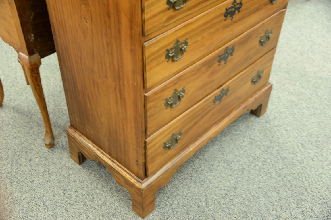 Lot 27: Tall chest having large cornice molding and fan carved long drawer with false triple front over five drawers, all set on bracket bas…