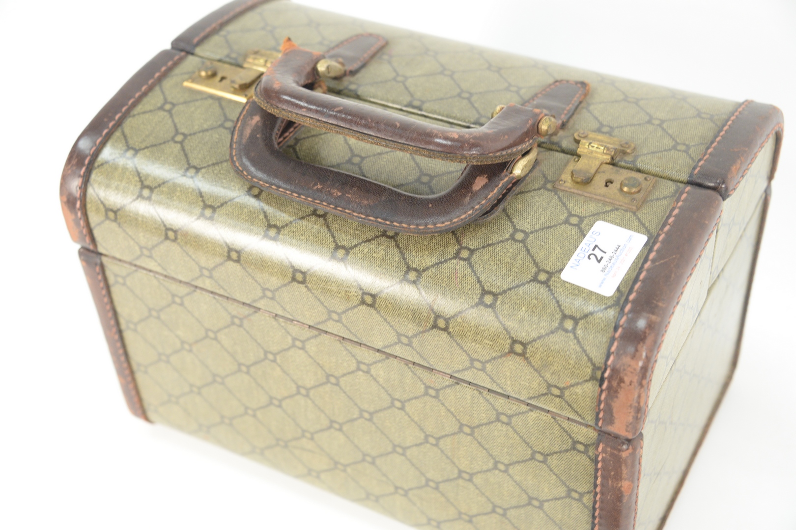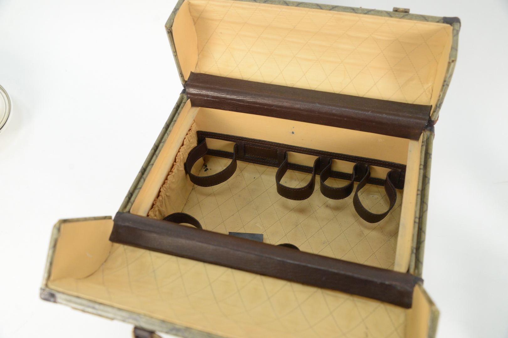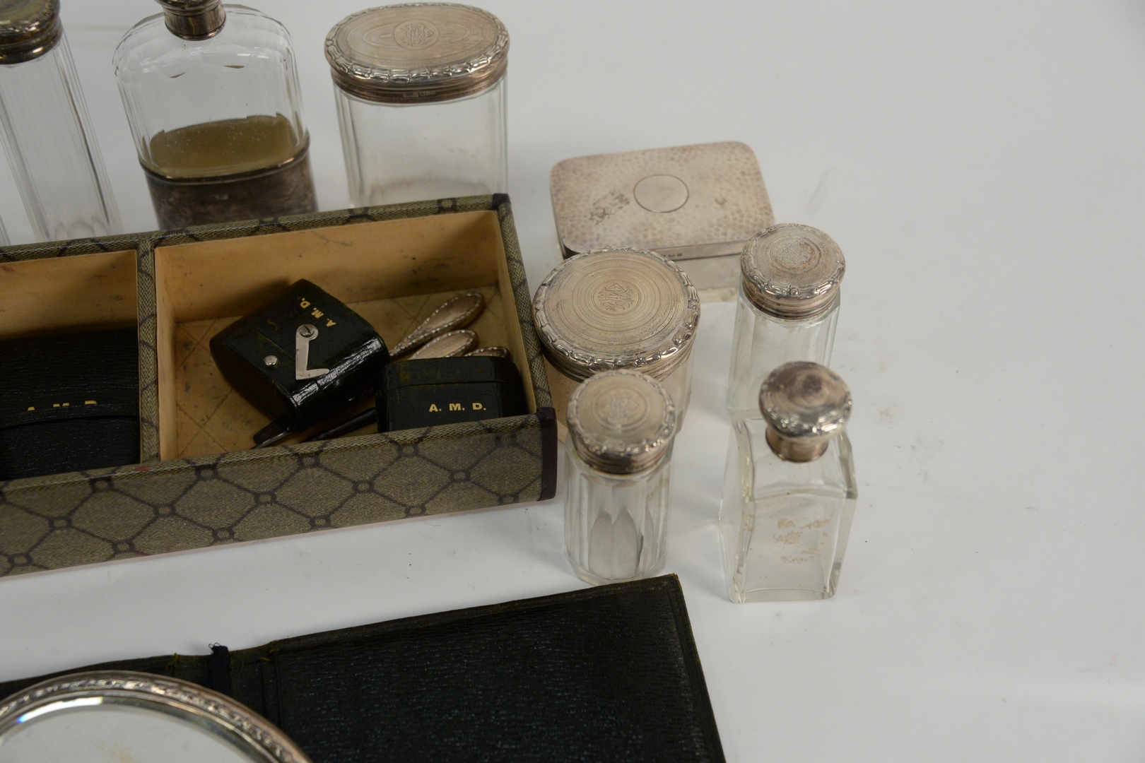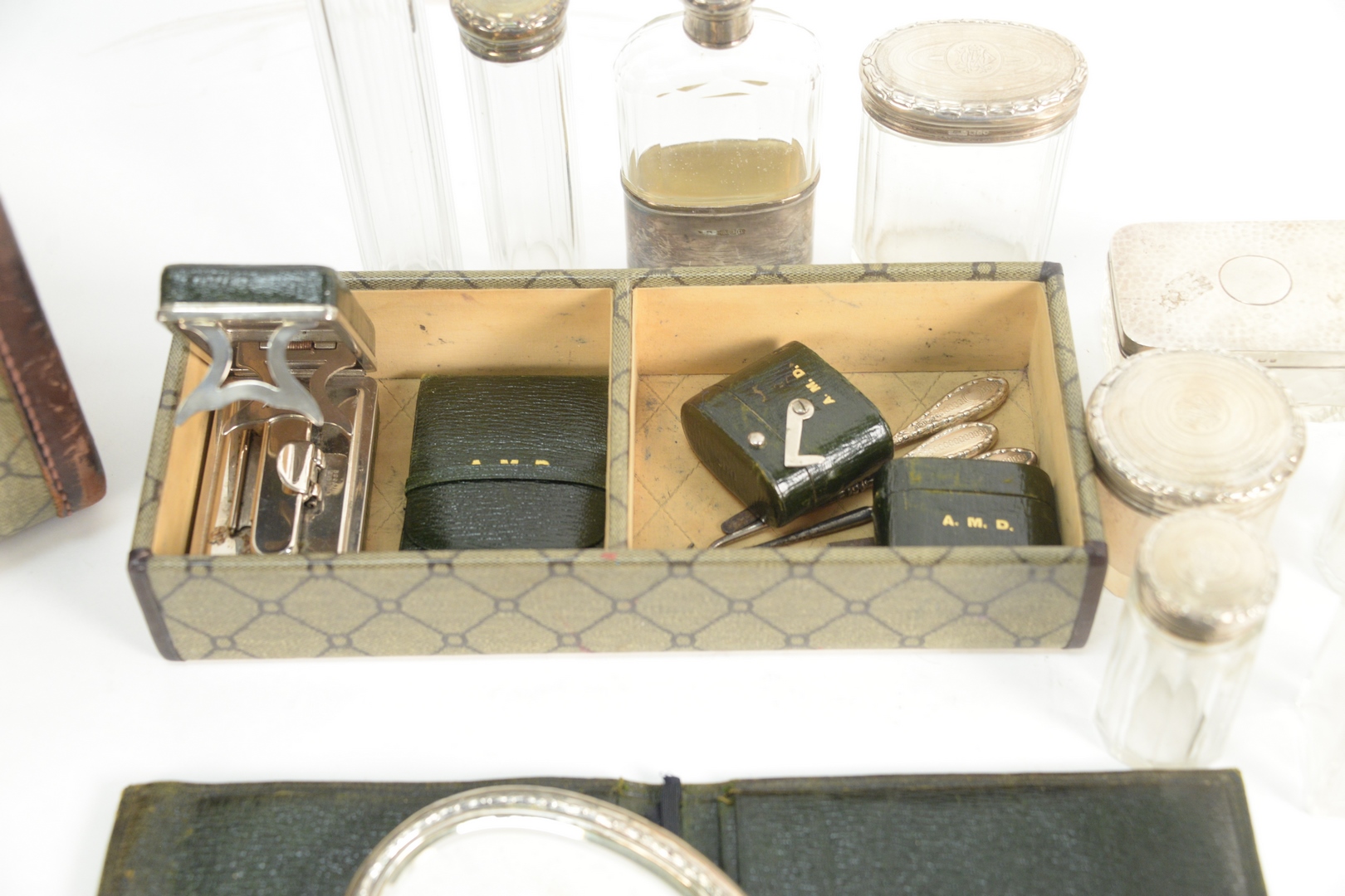Lot 27: Travelling Vanity Set having sterling silver top bottles, mirror, inkwell, lighter, etc. in fitted box, height 9 inches, length 13 inches, several items marked with embossed stamp Mansfield of Grafton Street, Dublin, maker to the Lord Lieutenant –