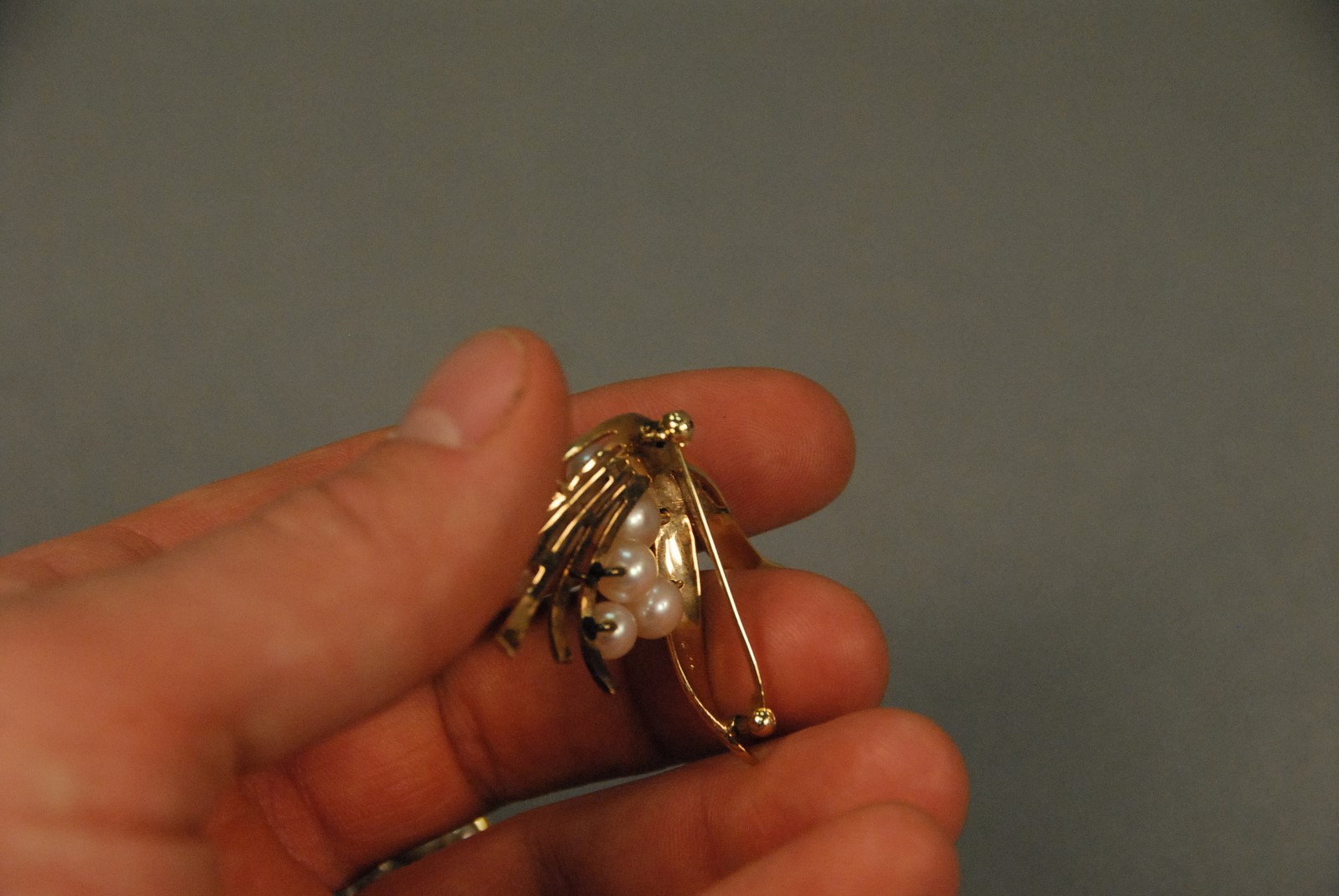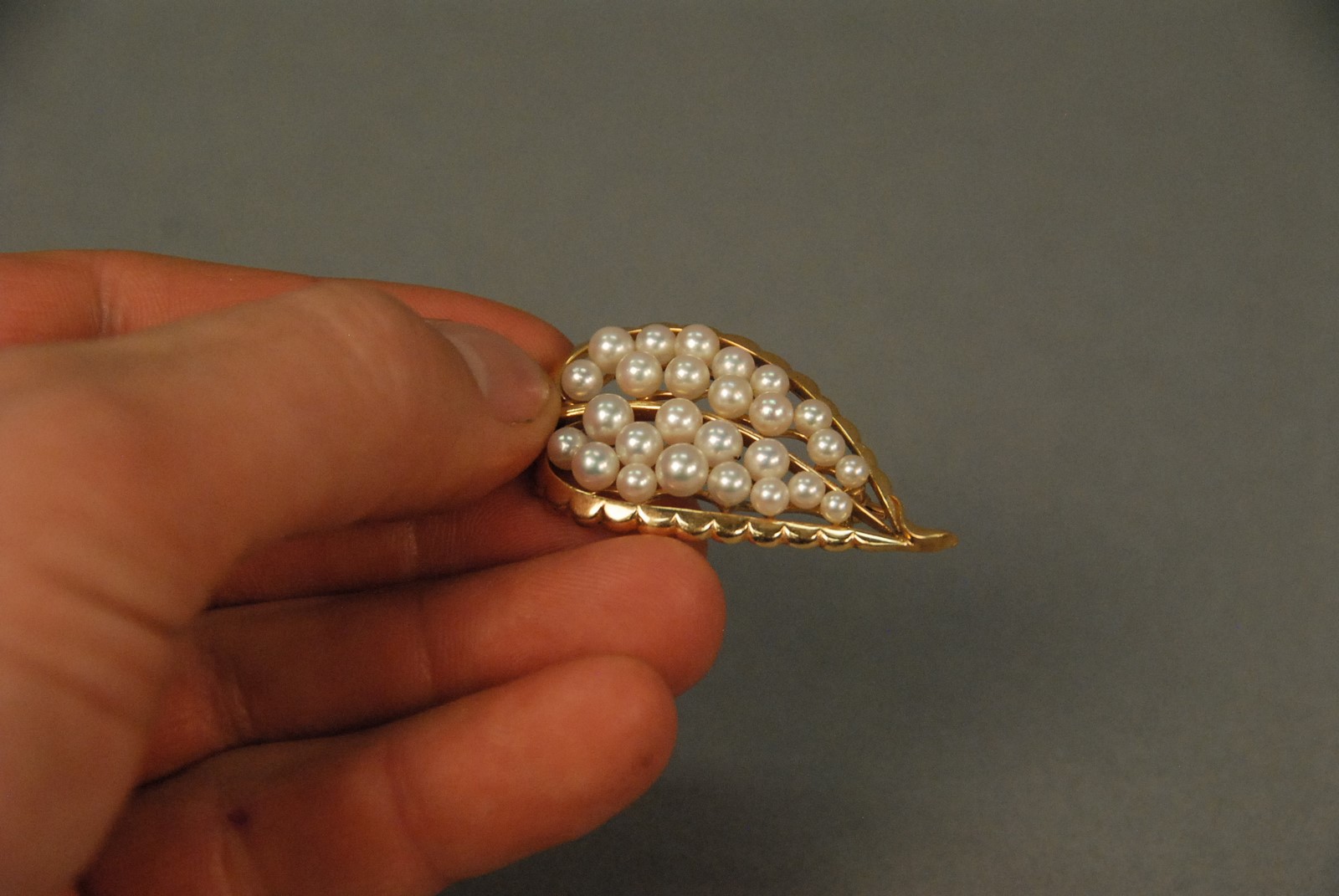 Two 14K gold pins including one leaf pin set with twenty-six pearls signed K. Mikimoto Tokyo and free form pin set with seven pearls signed with M. lg. 2 in. and lg. 1 1/2 in. 22.4 total grams Provenance: Property from a Private Collection Sold for the Benefit of the Virginia Historical Society.