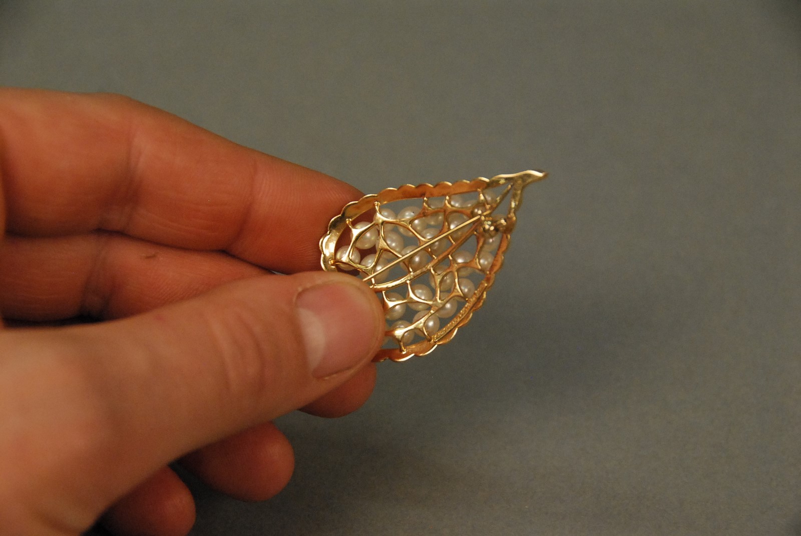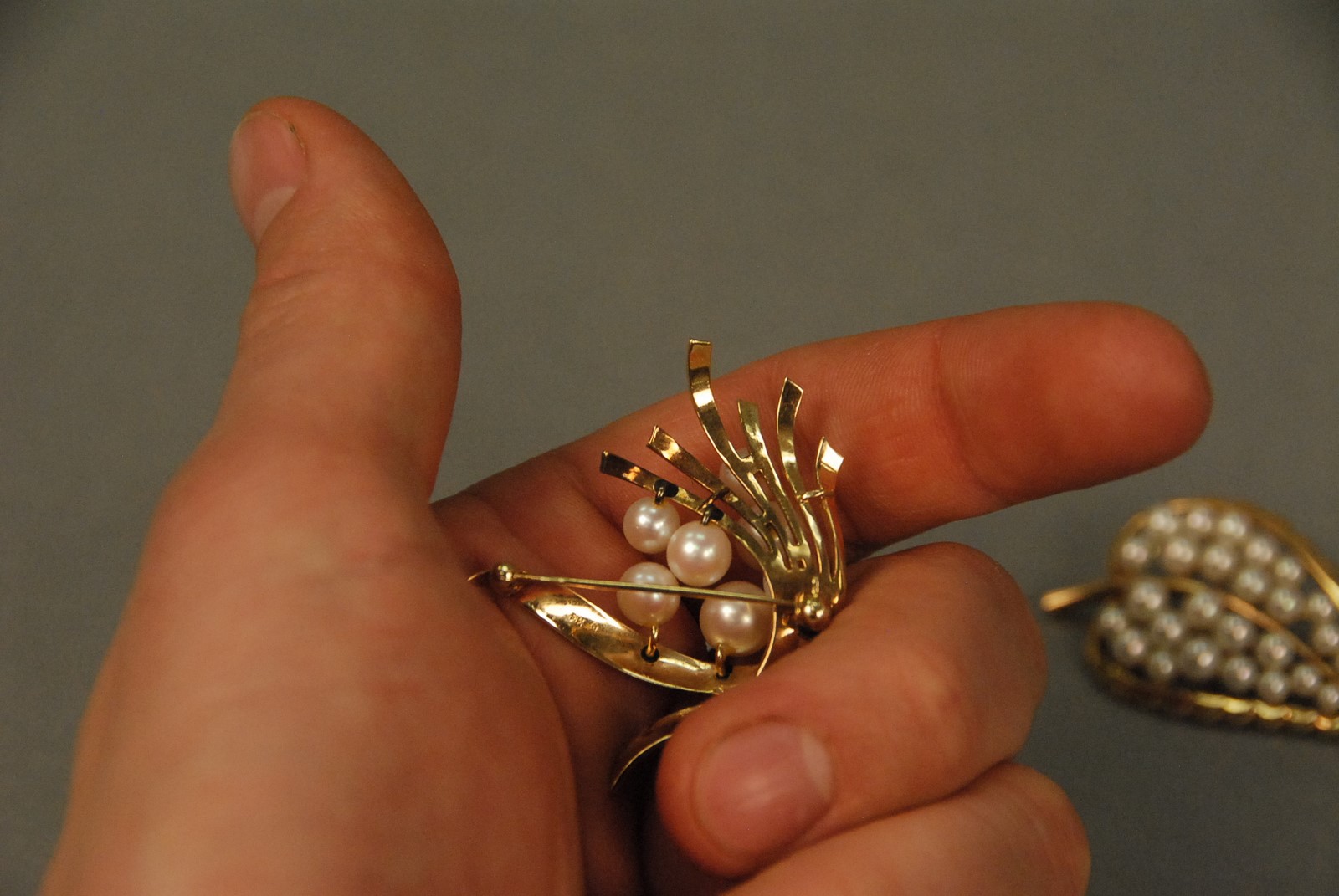 Lot 27: Two 14K gold pins including one leaf pin set with twenty-six pearls signed K. Mikimoto Tokyo and free form pin set with seven pearls signed with M. lg. 2 in. and lg. 1 1/2 in. 22.4 total grams Provenance: Property from a Private Collection S